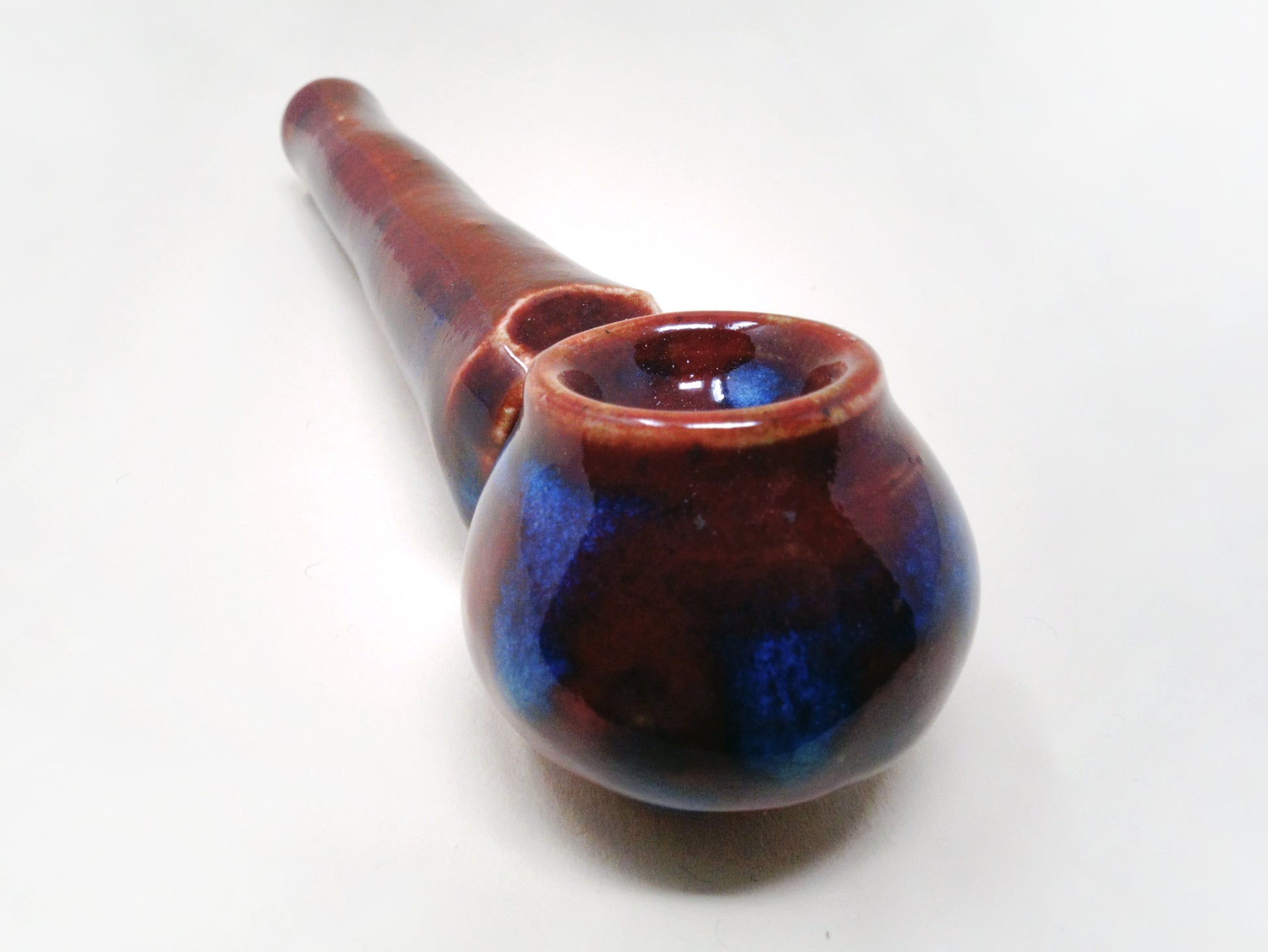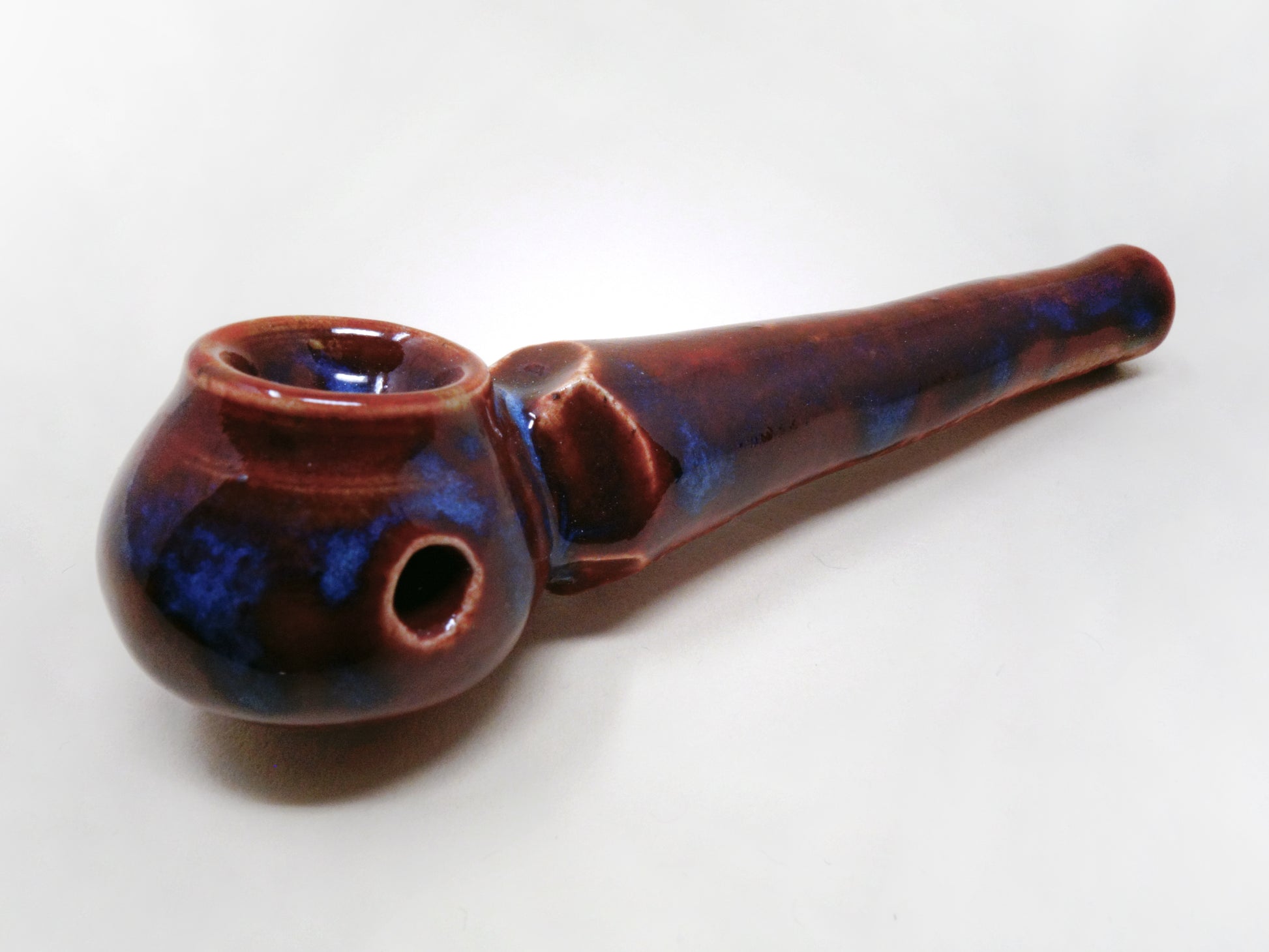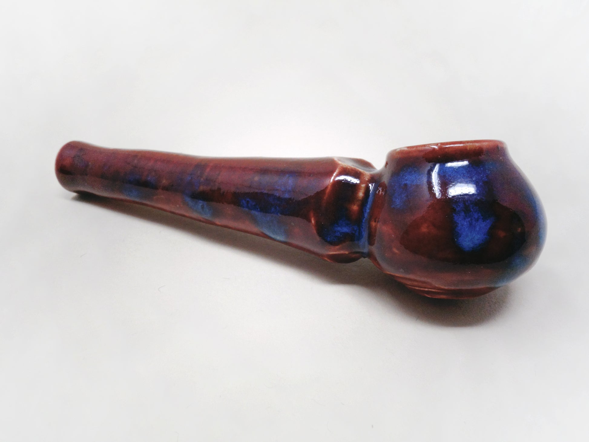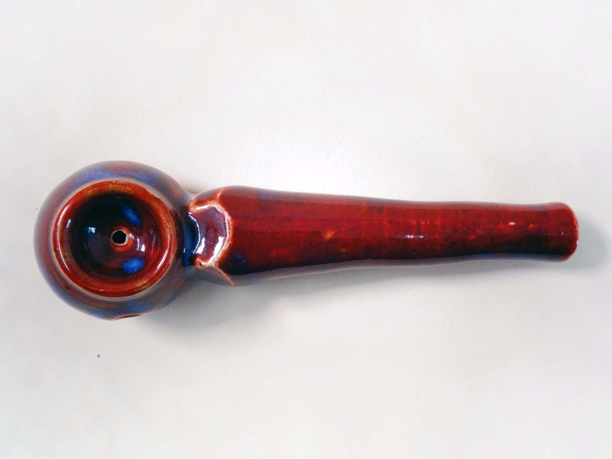 I know they hurt you. I know you want to set fire to their car. Don’t, and instead set fire to this lovely bowl, and let her hold your rage. With a deep ruby glaze and drops of peacock blue smoldering down the sides of the stem and bowl, Hell Hath No Fury came from the eighth layer of hell to stay.