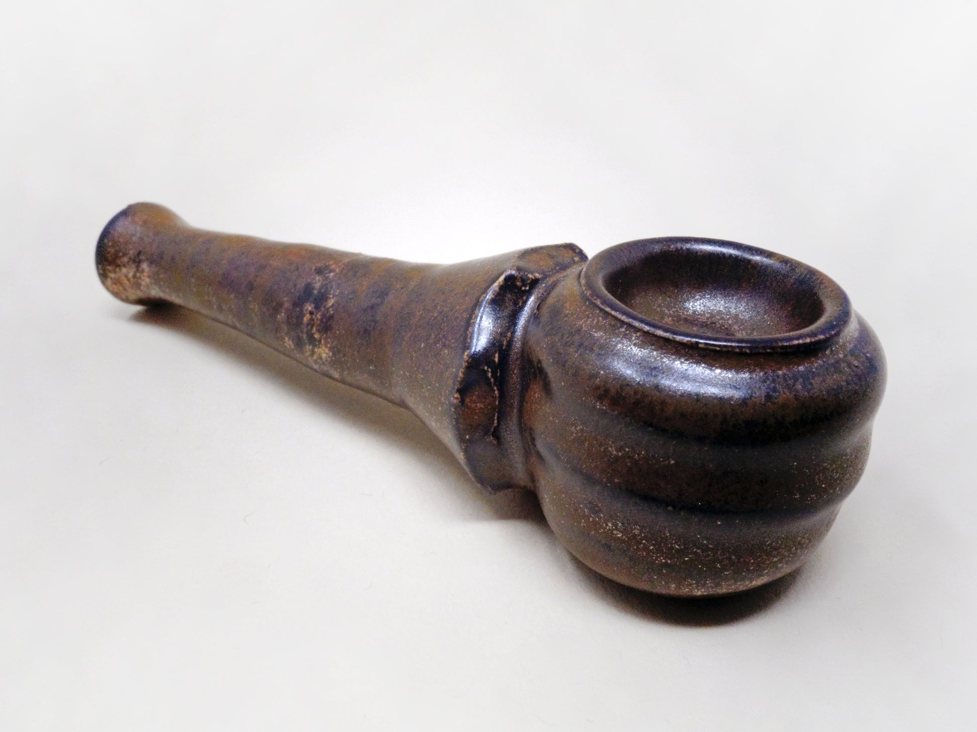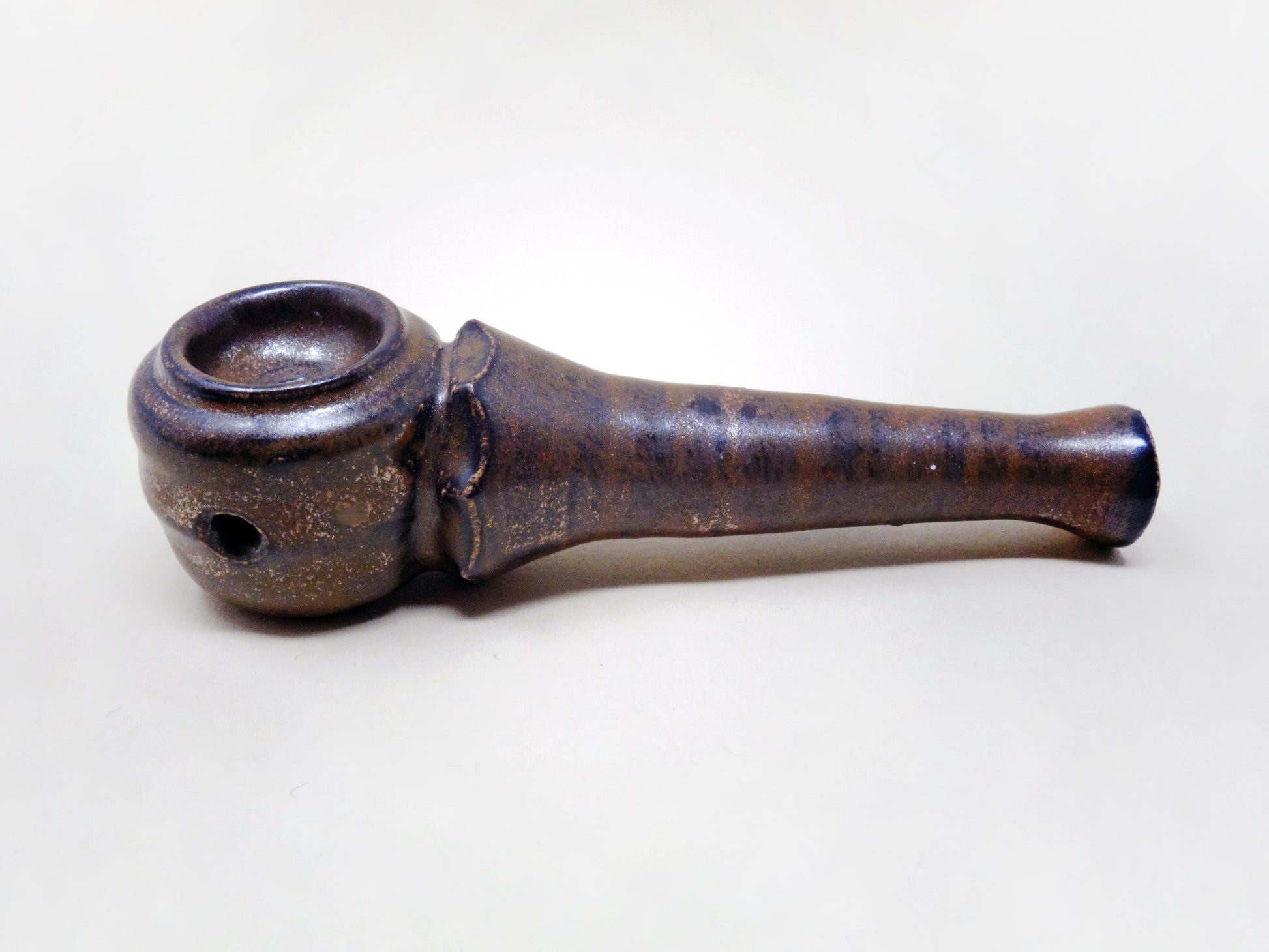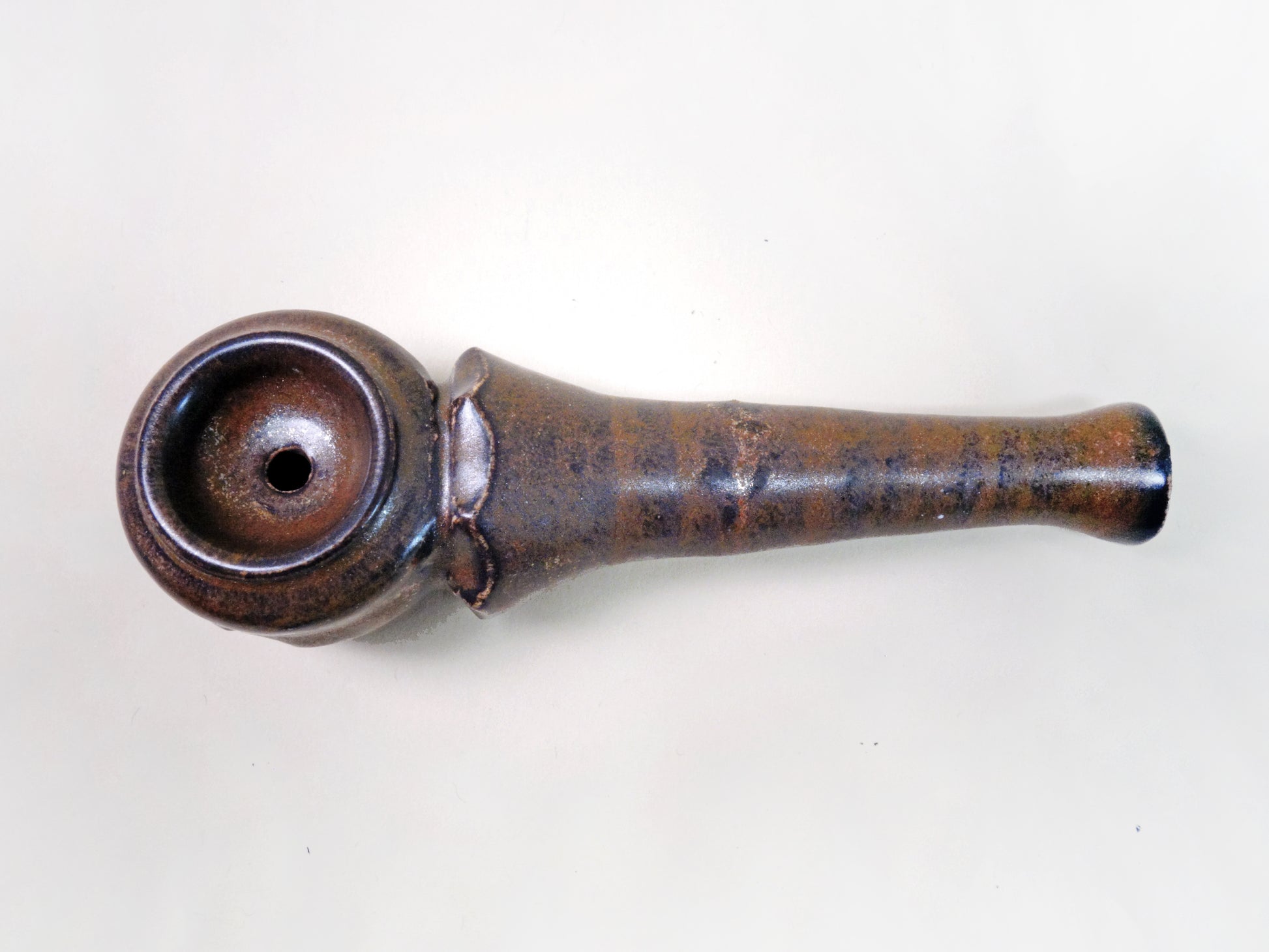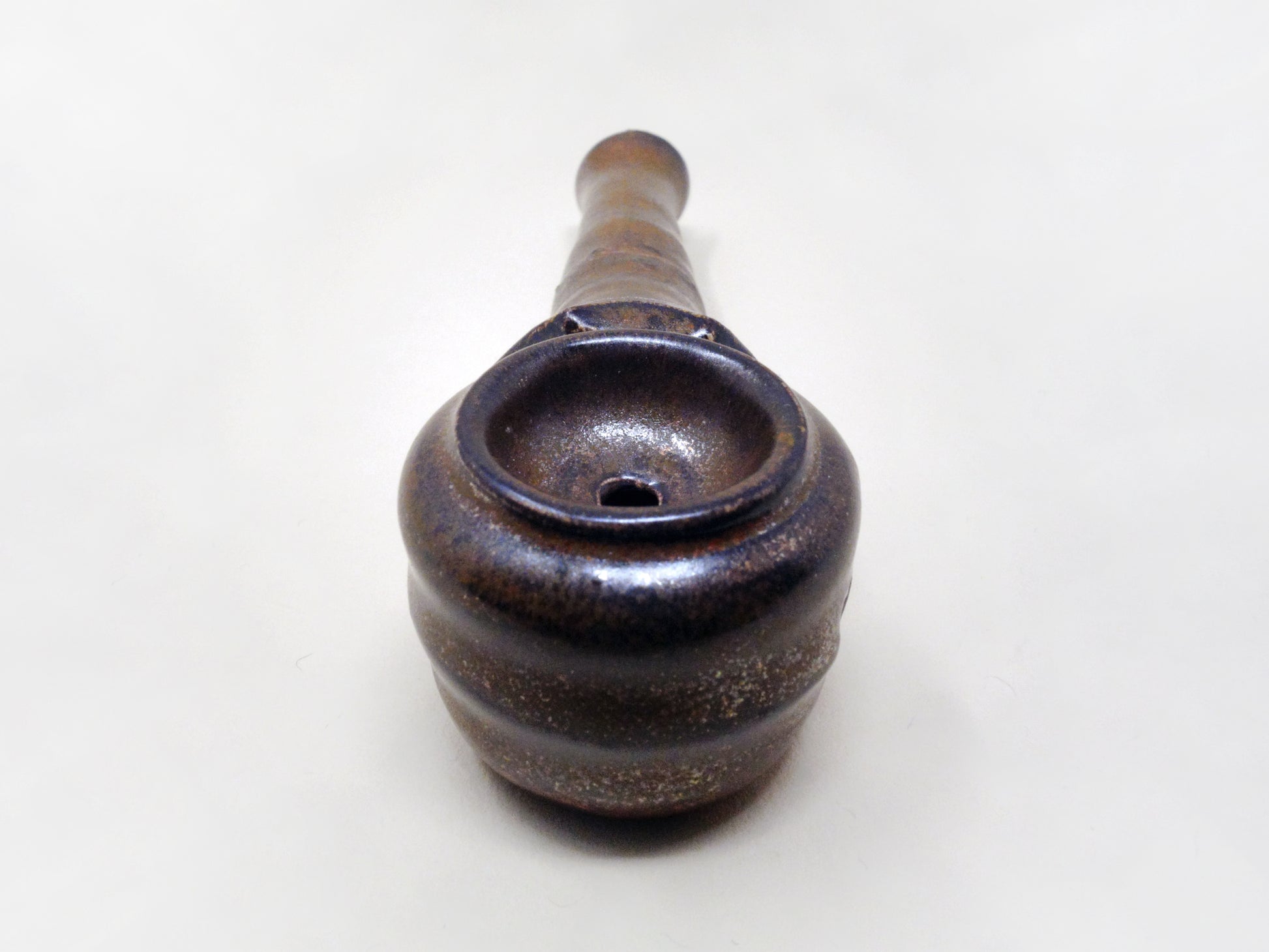 A survivor piece originally split in half, Brass Knuckles appears to be more likely made from metal instead of clay. You can see on its coppery-metallic glaze where the piece broke in half during the first kiln fire, and reformed in the second fire. Able to withstand a hefty bowl, Brass Knuckles holds an aged, antique look.
