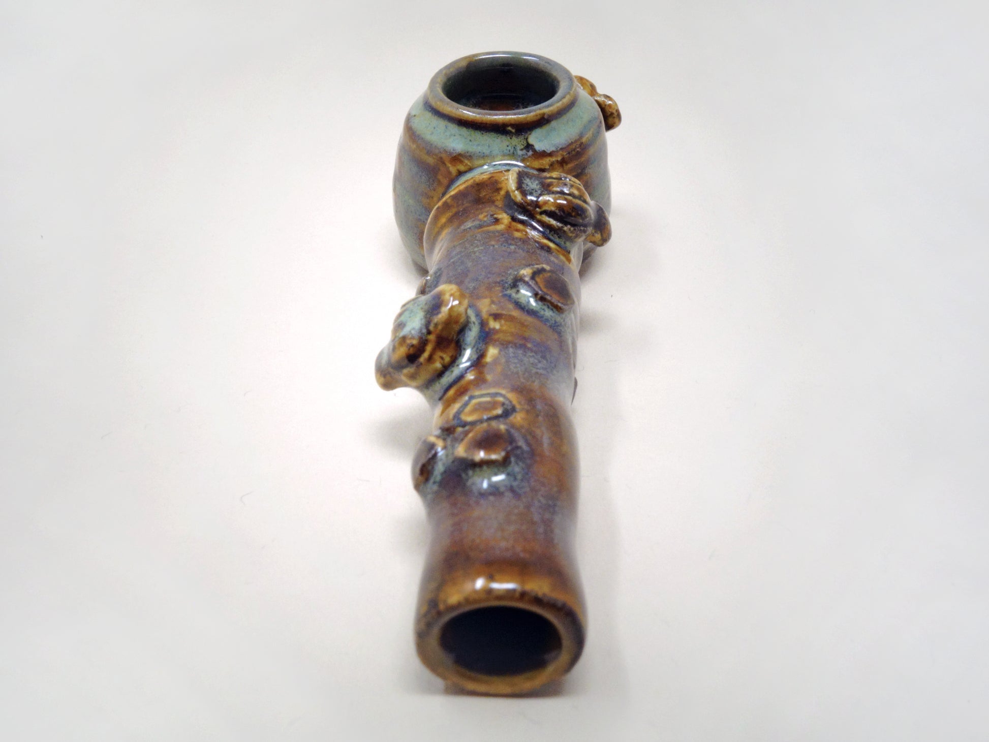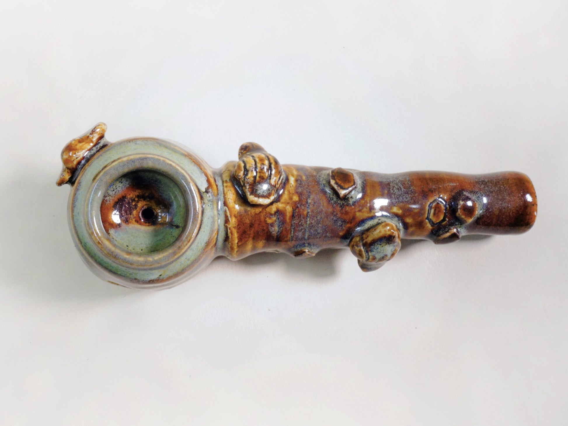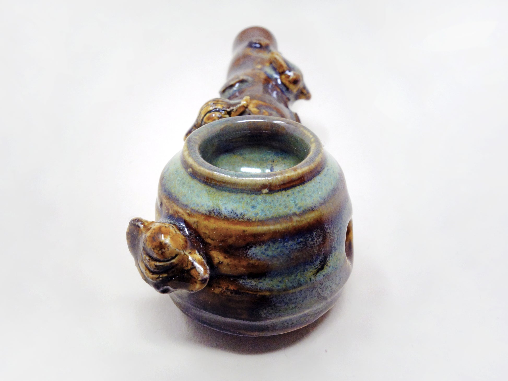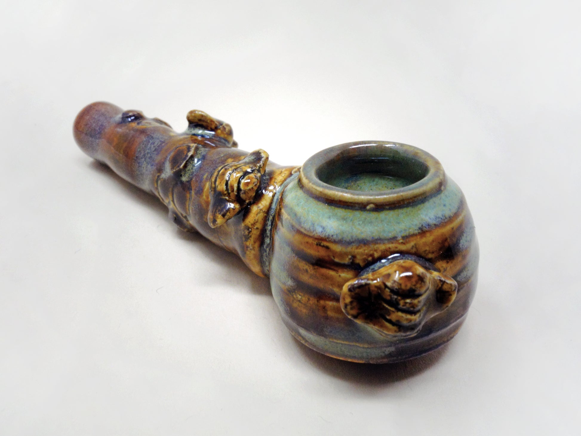 Lita Clay’s first honeypot pipe, Honey Baby showcases hexagon embellishments and bees that buzz around a bowl formed to hold copious amounts of flower. Crystalline glazes reveal amber and sea foam tones.