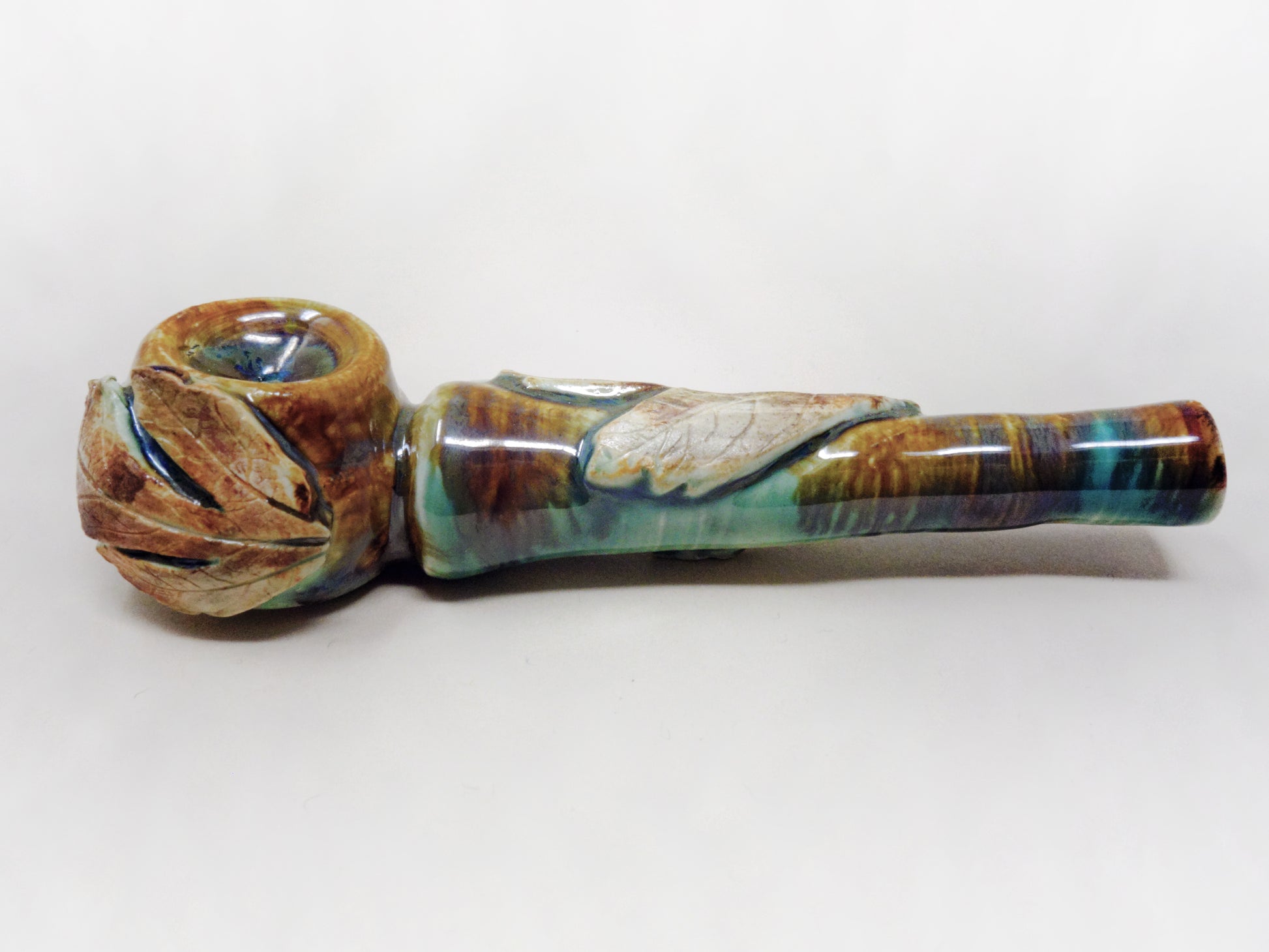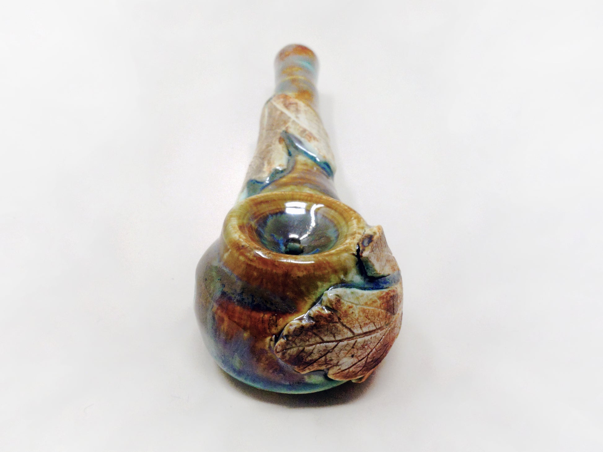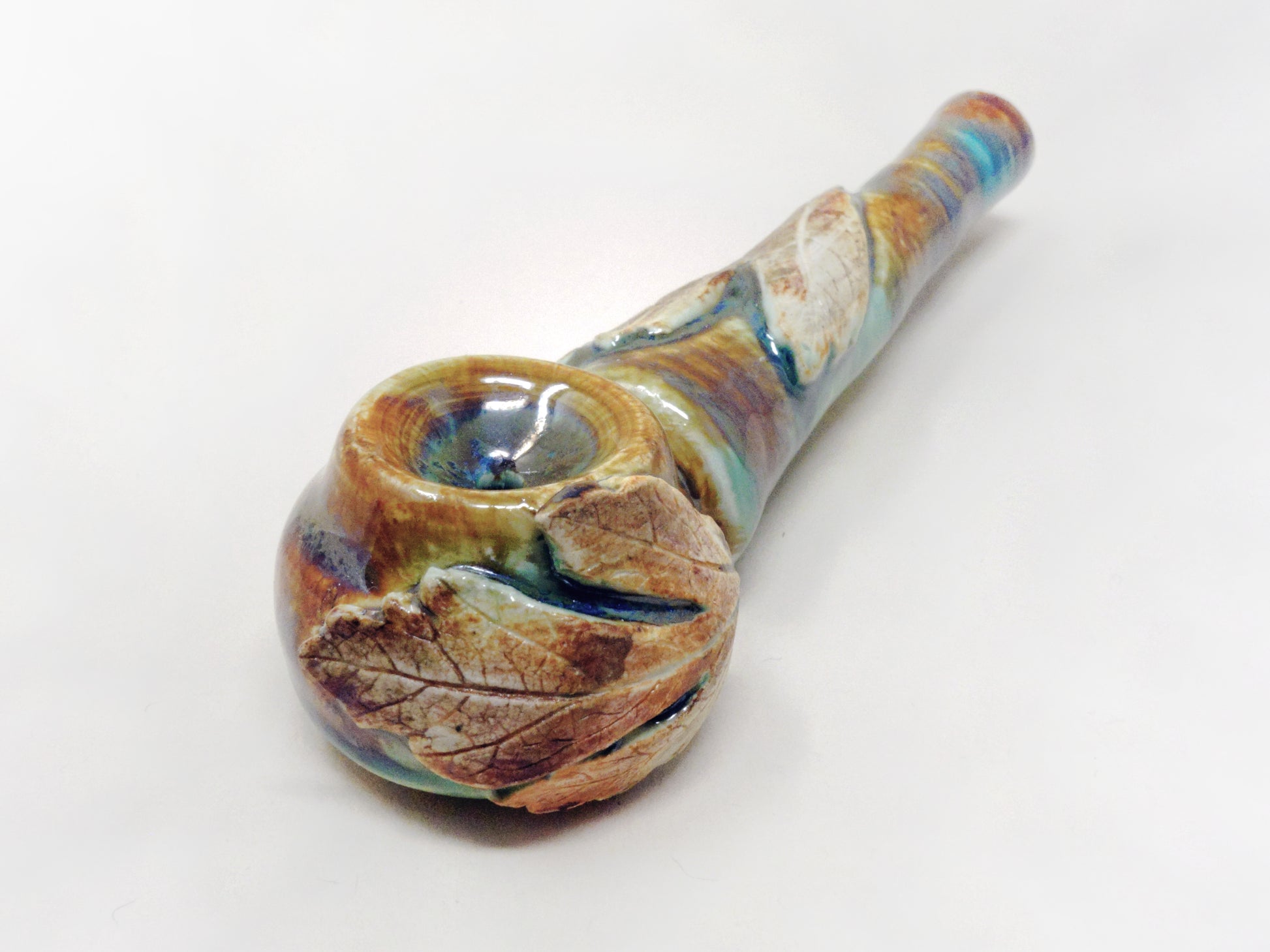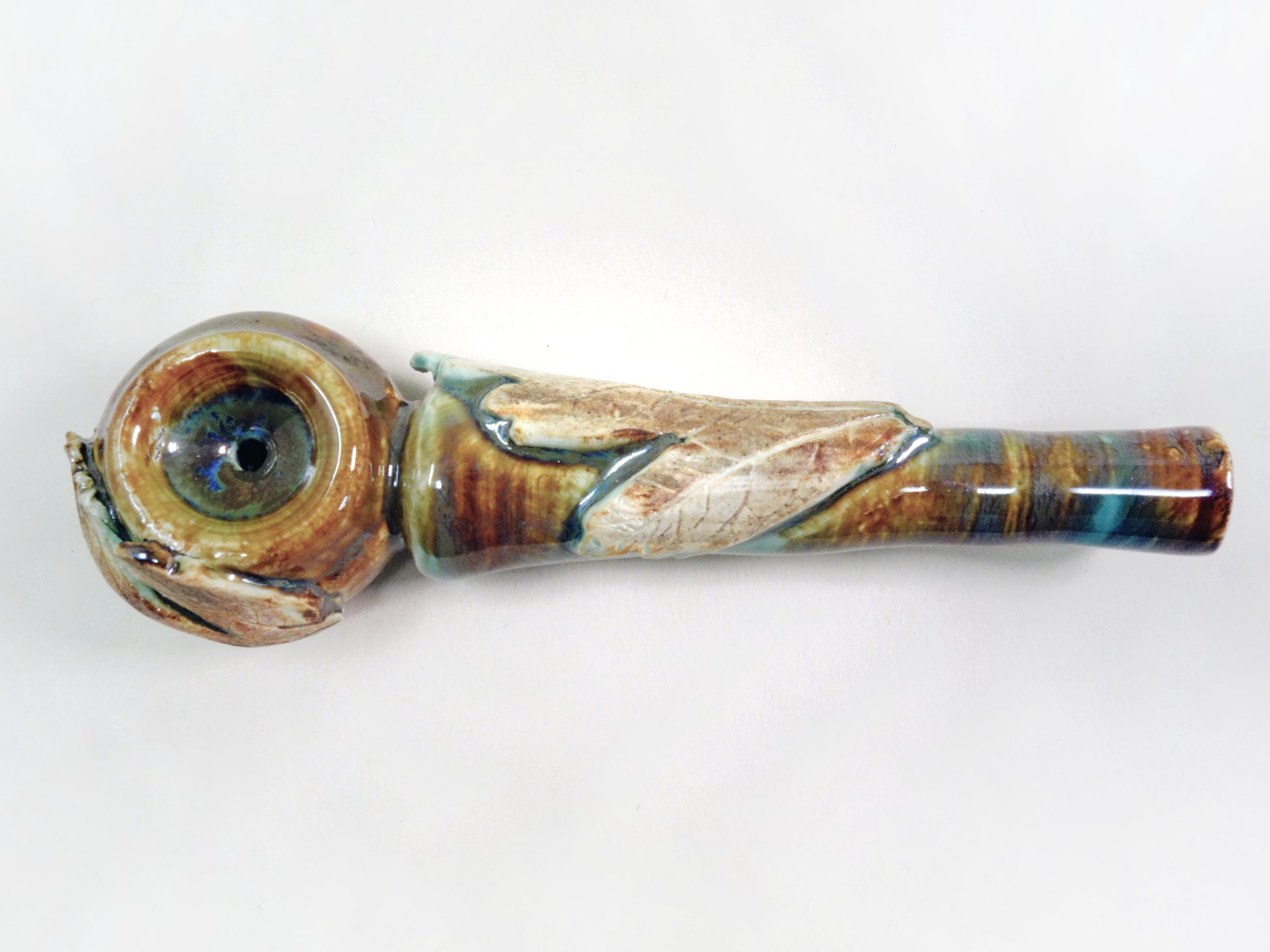 One of Lita Clay’s first pipes made from leaves found in Denver, its glaze is reminiscent of the lines eroded into stone from acid rain. The leaves take on a rustic look as the stem and bowl are trailed with radioactive cider onto translucent green.