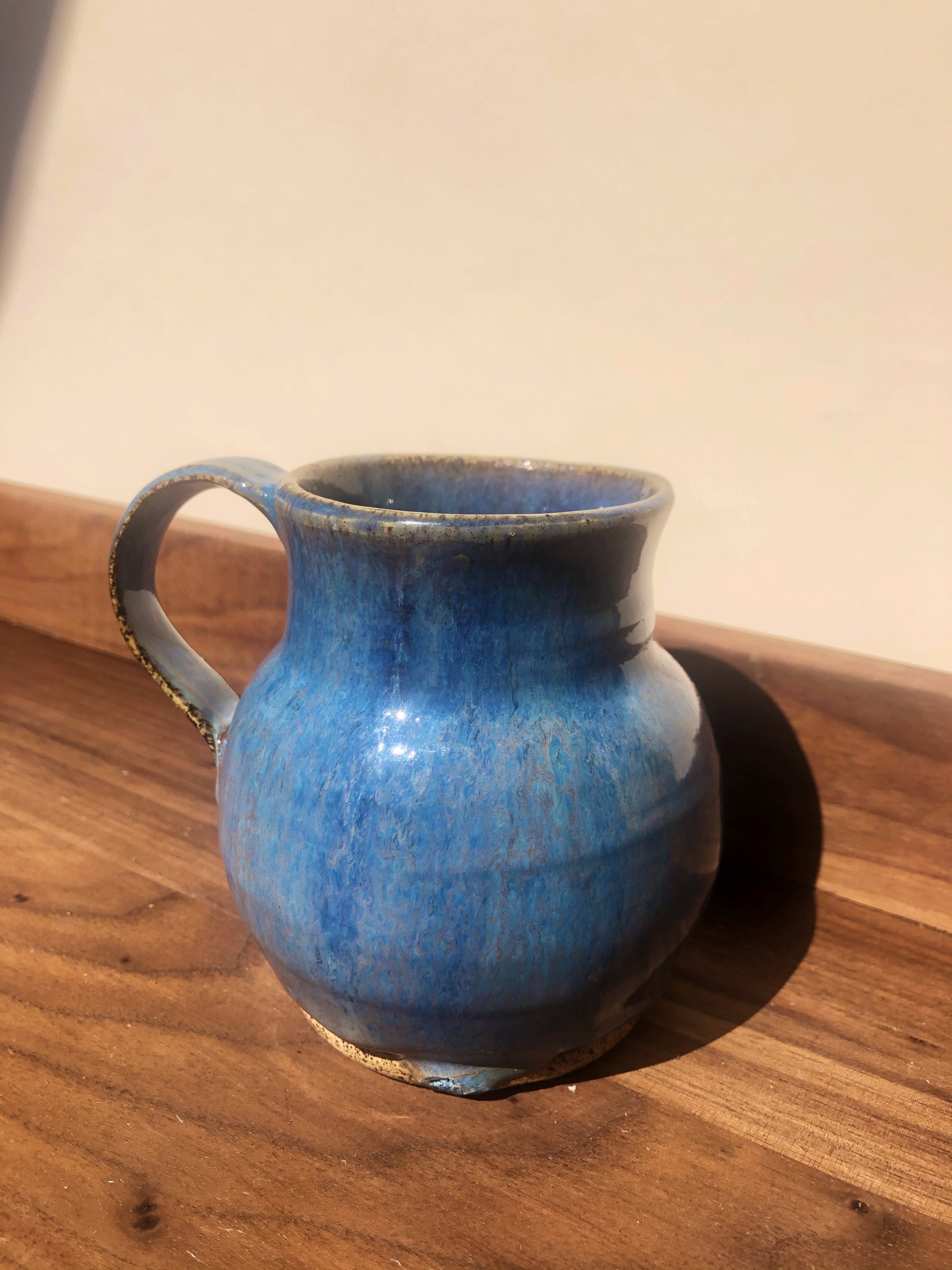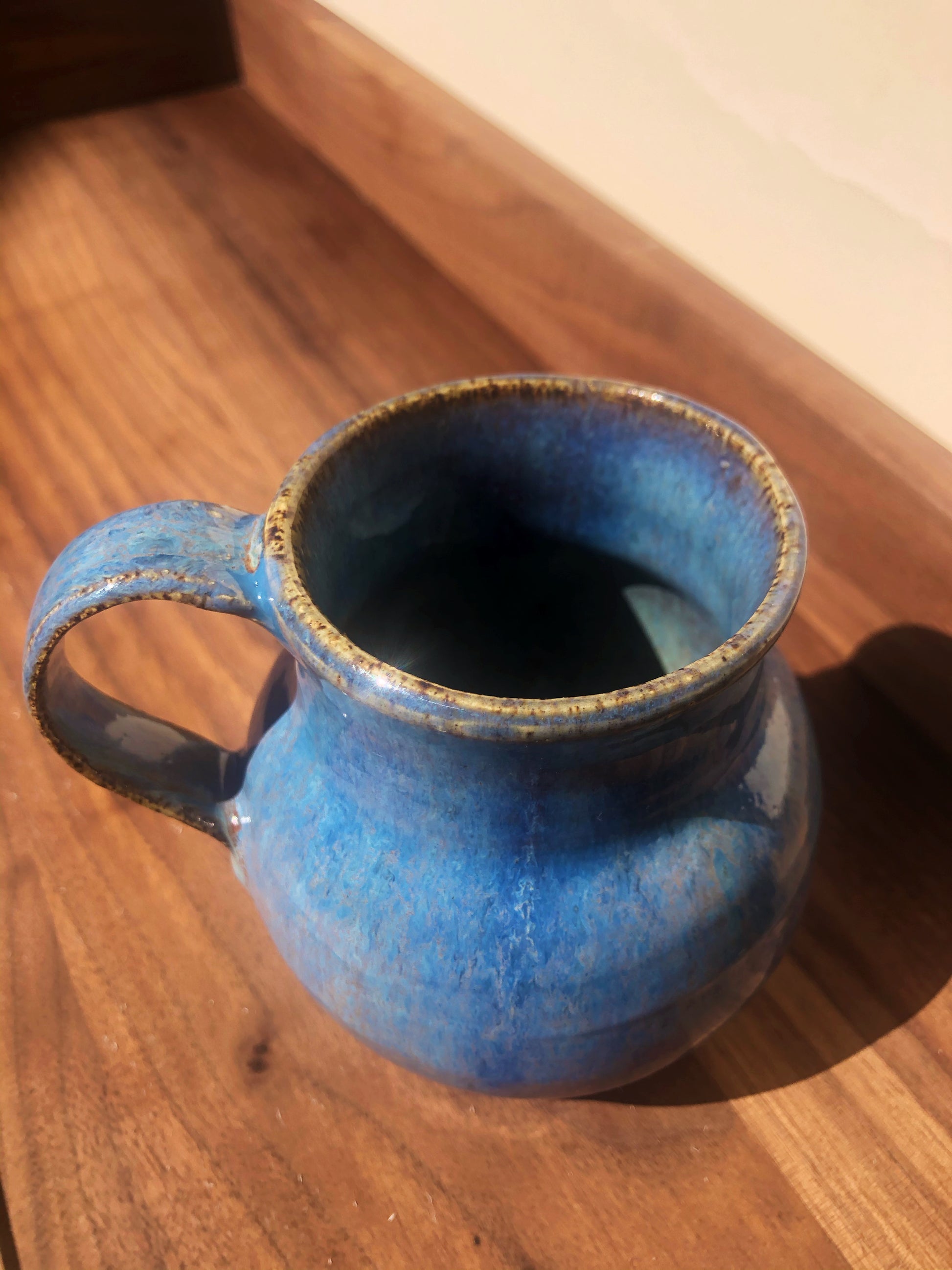With warm brown and gold tones flecking the outer downpour, this vivid cerulean mug appears as if gold-rush rivers had fallen over the glaze during firing. Blue ranges from aquamarine to cobalt.