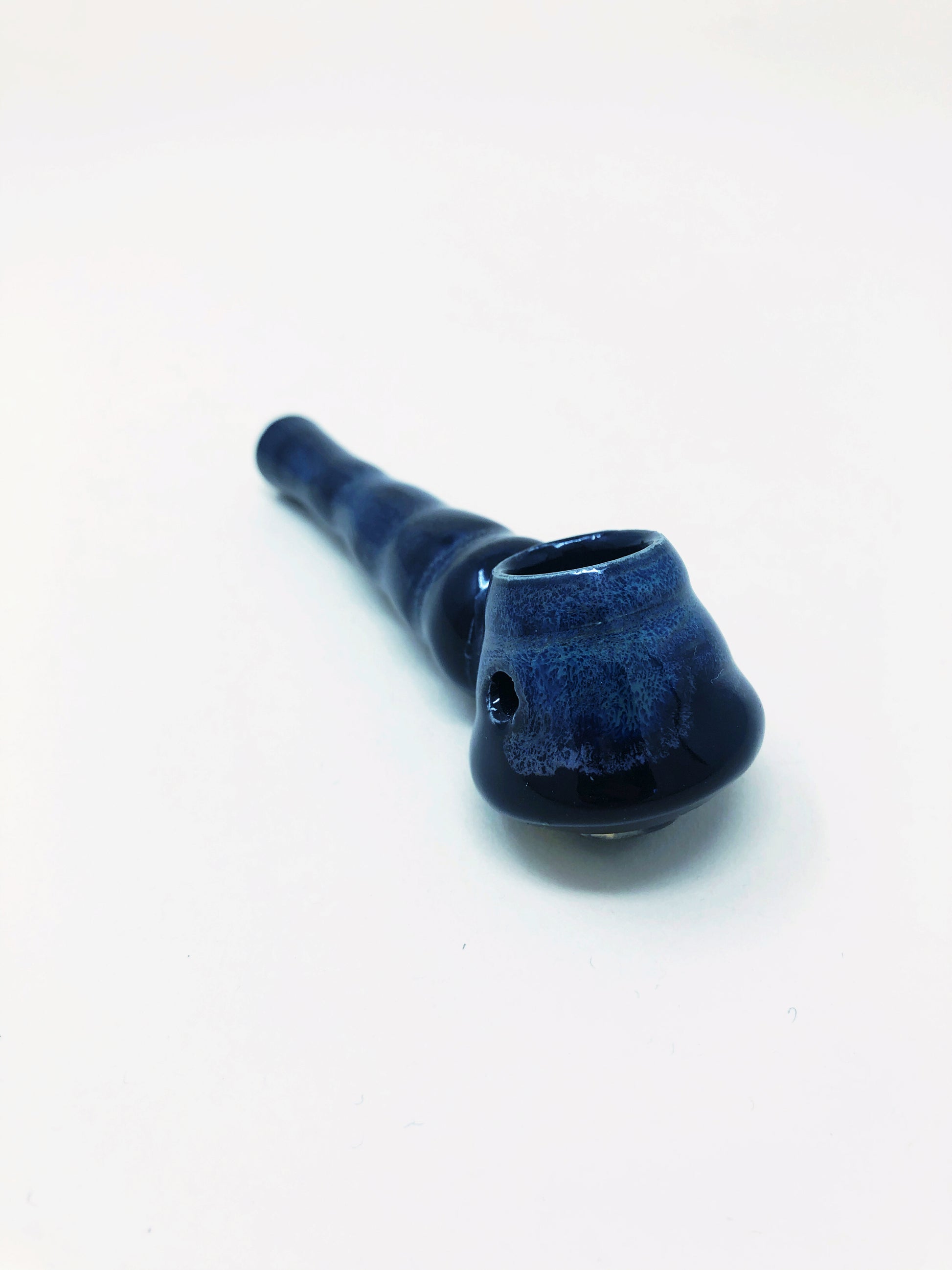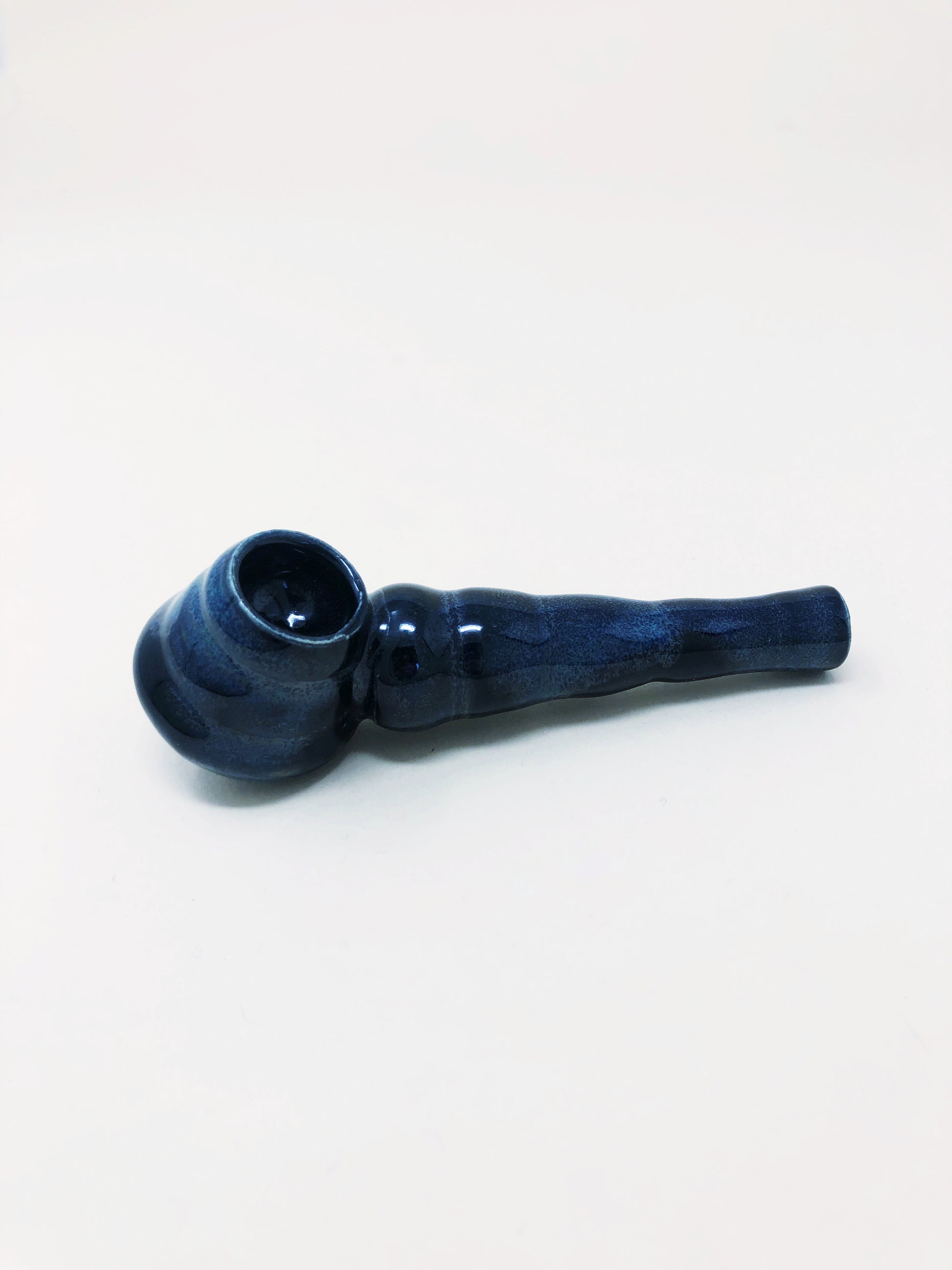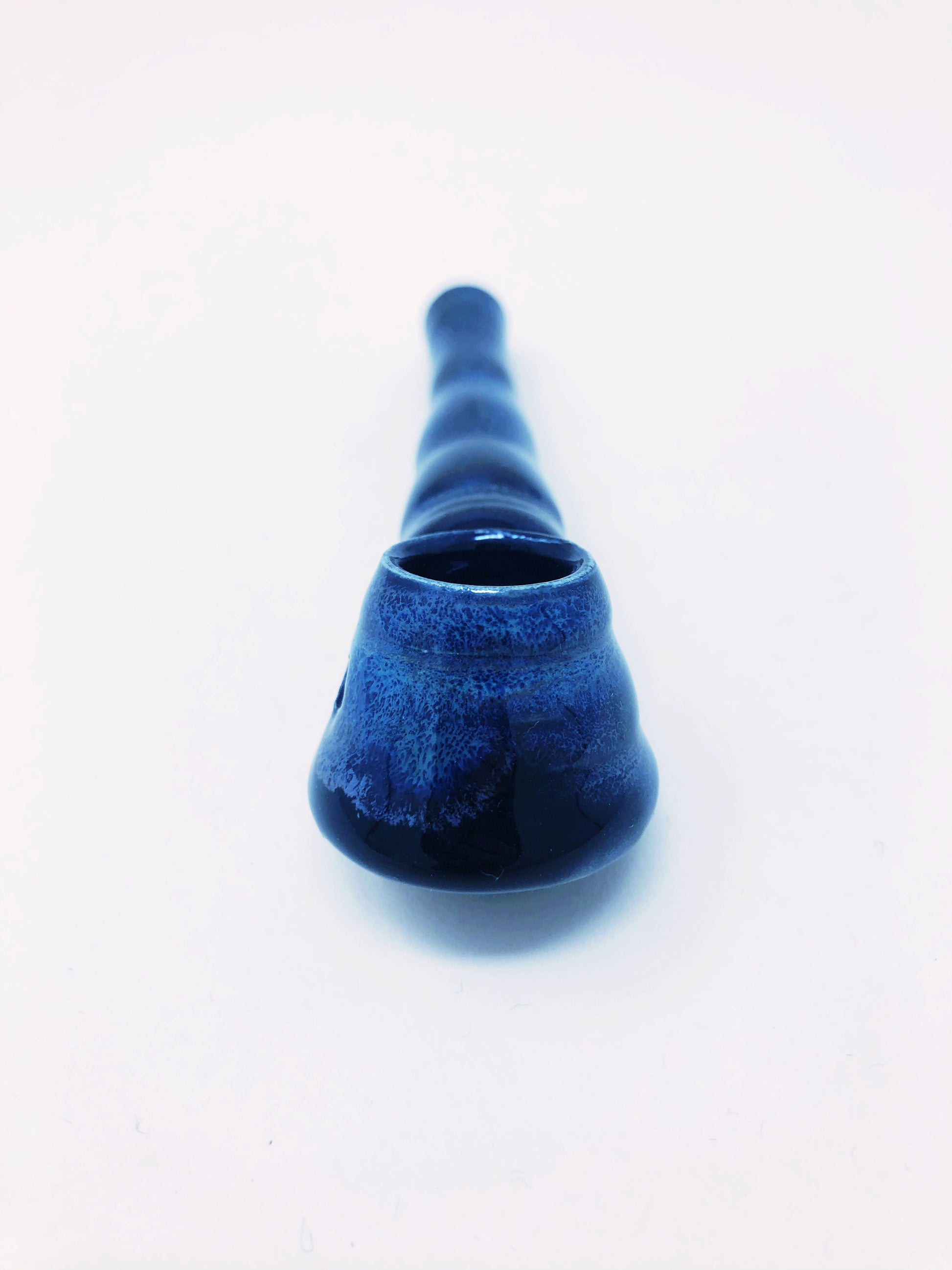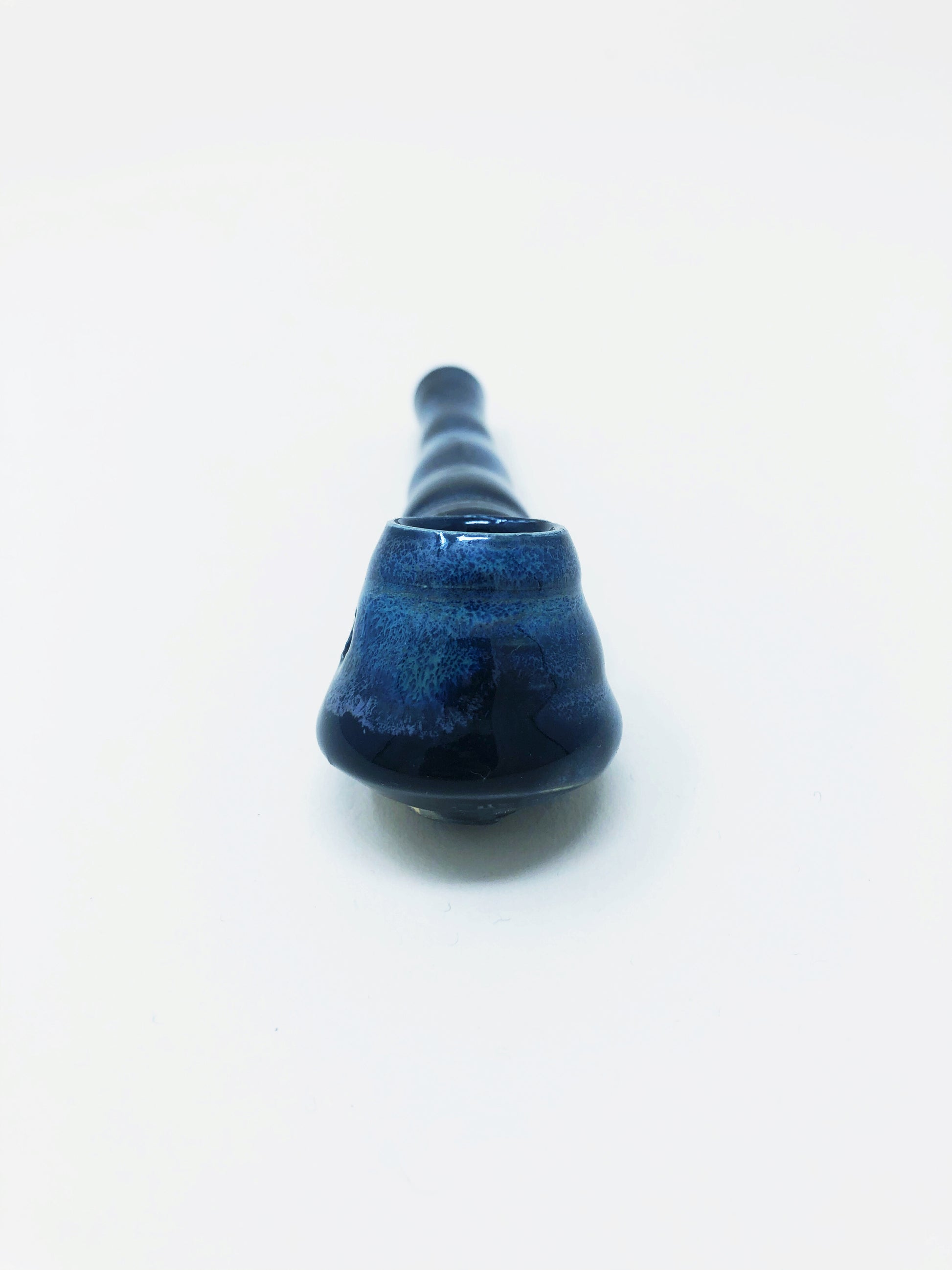 The Four Horsemen's Nephew is equipped with a deep bowl and portably-sized stem, glazed pitch-black with fizzling of bright blue on the top half. Due to his nature of over-proving but never being quite as good at the apocalypse as his four uncles, this bowl will faithfully serve you 'til the end.