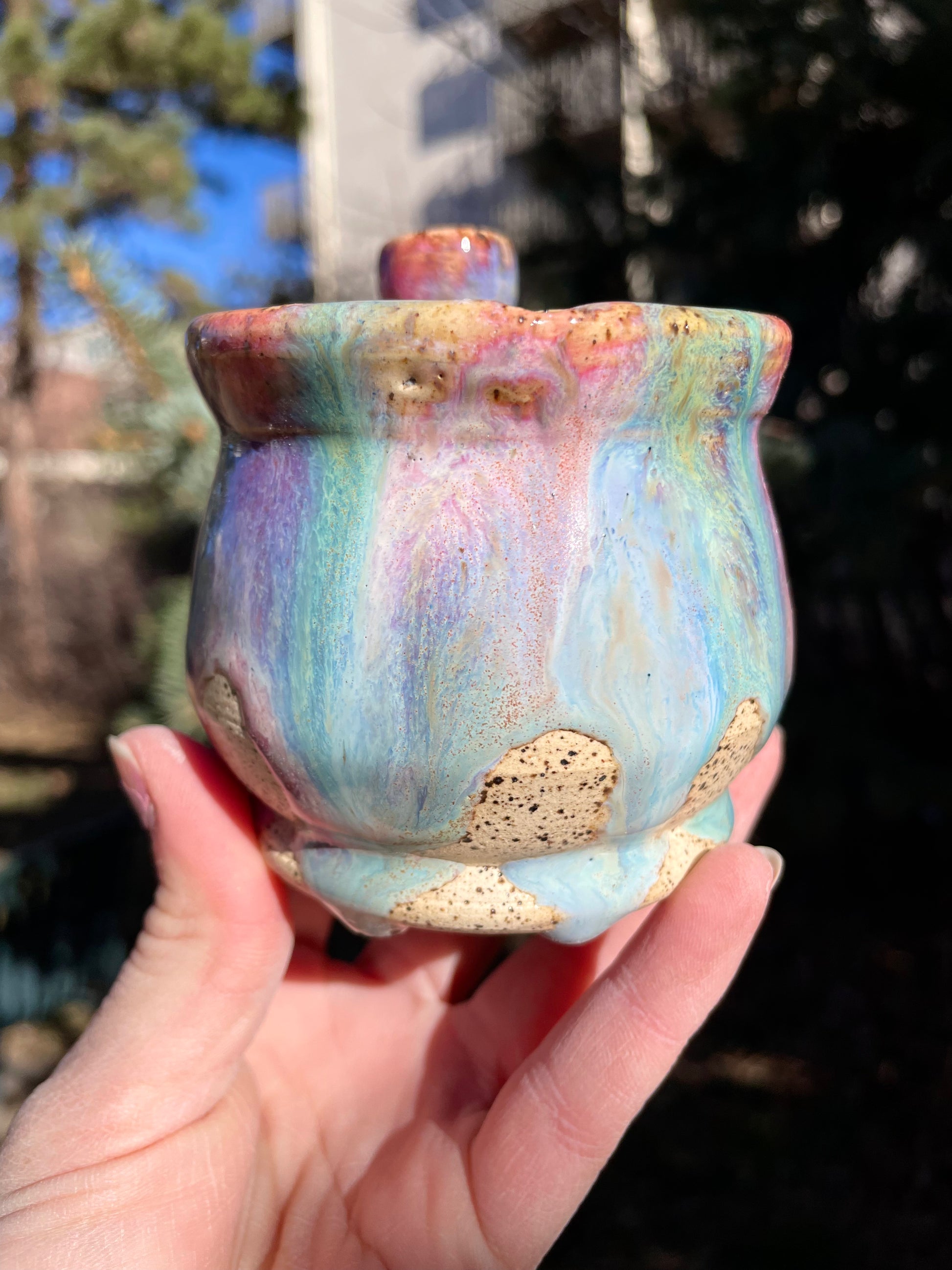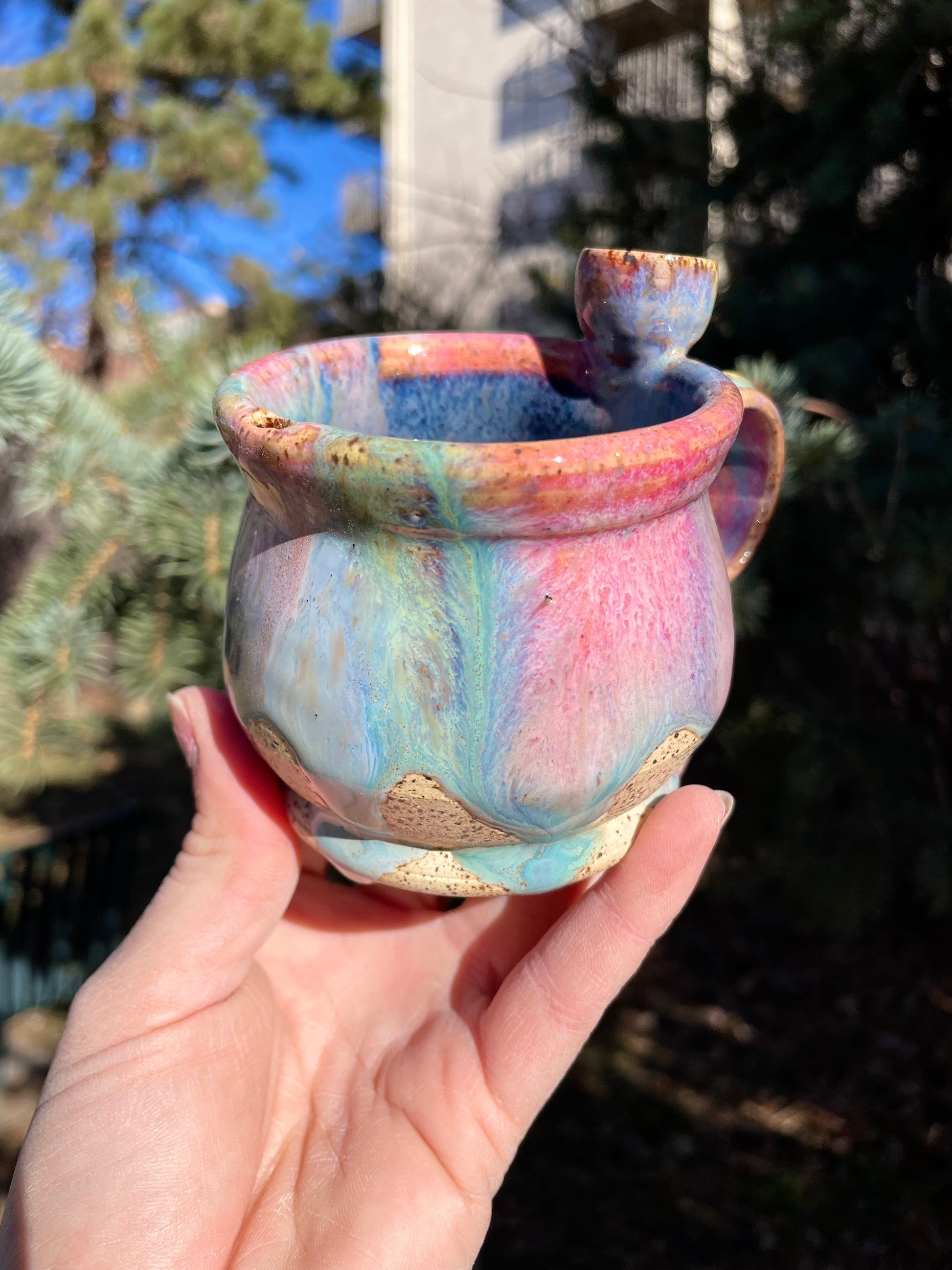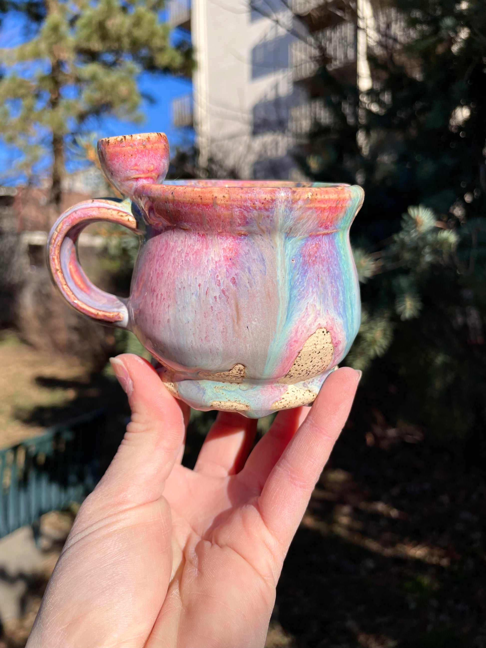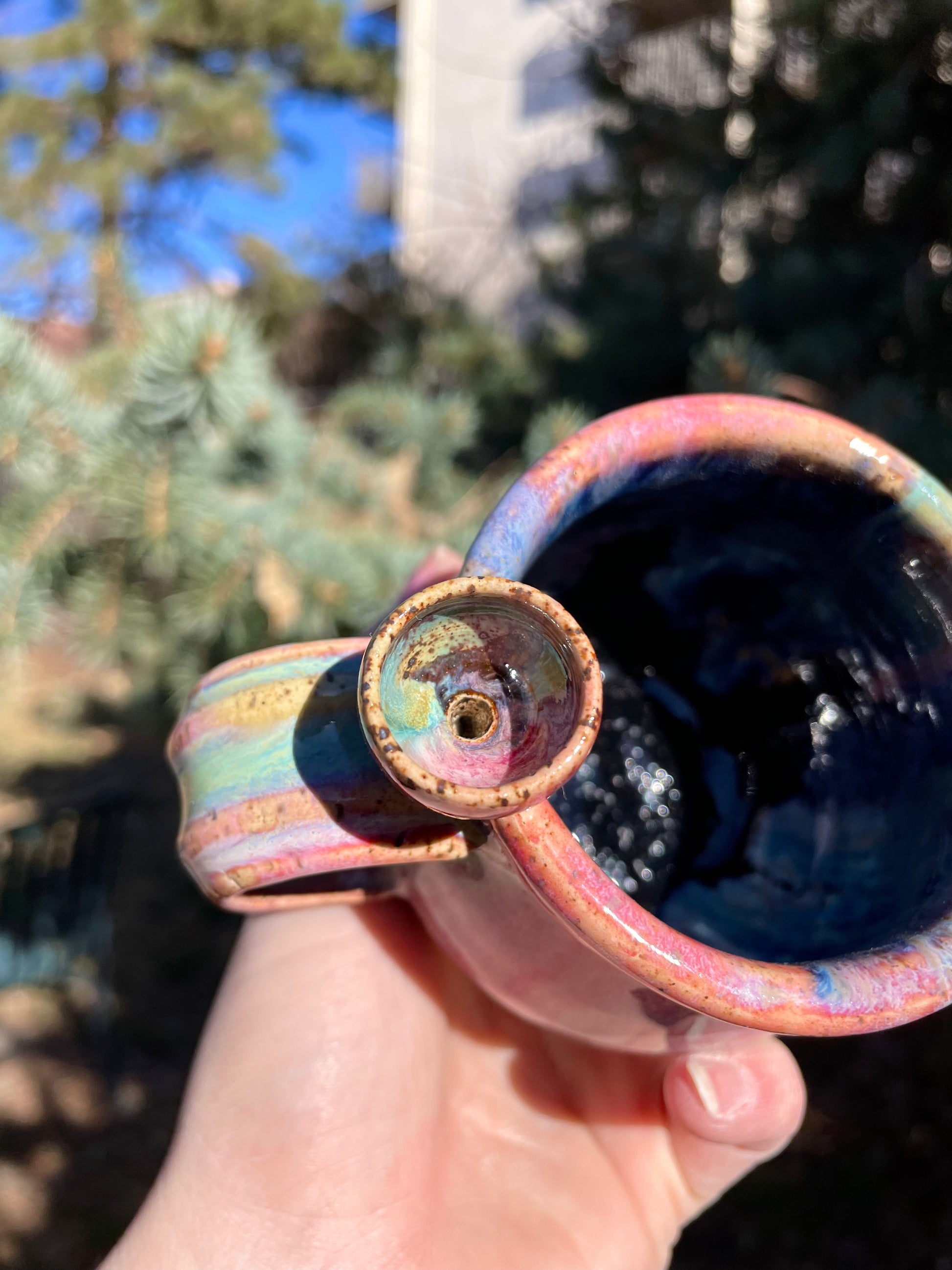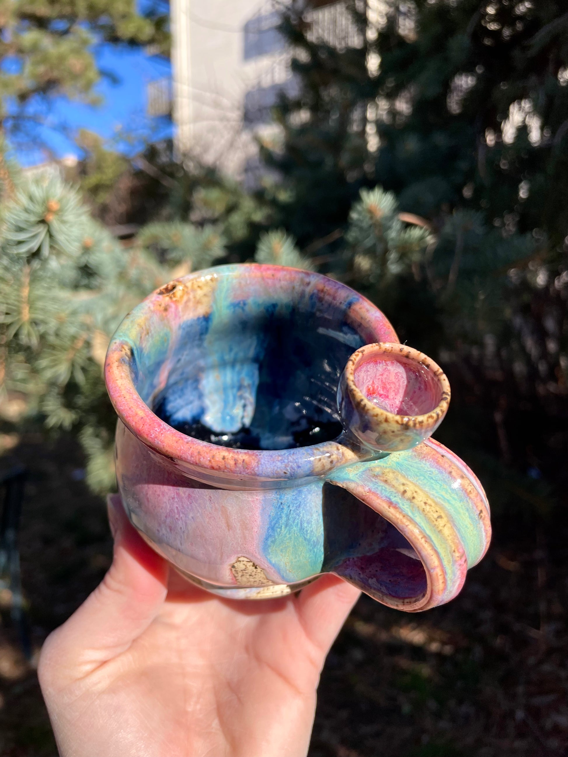 A functional Wake & Bake cappuccino mug with a built-in bowl for smoking flower.