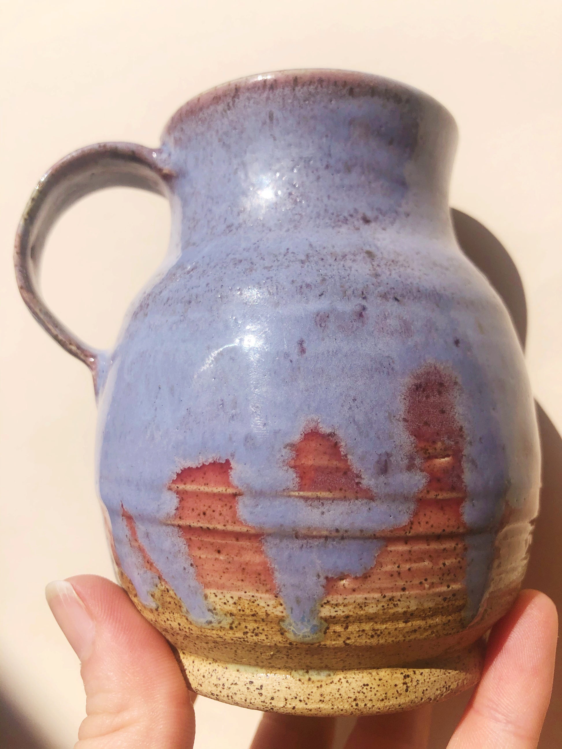 Frosty robin's egg blue trickles over watermelon ombré in lazy drops on this jug-shaped mug. Yellow and gold tones pool at the bottom.