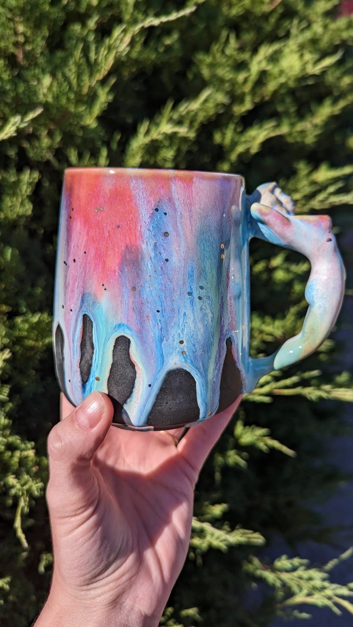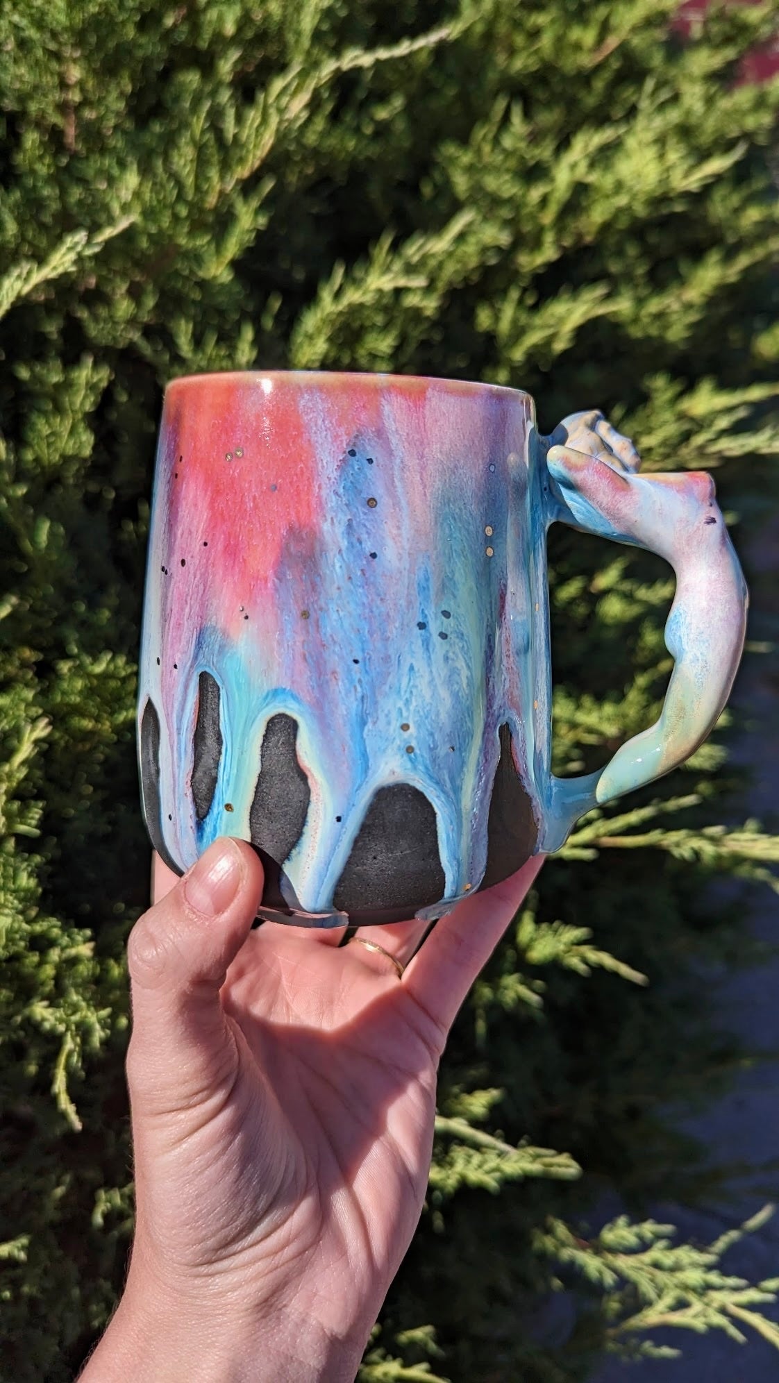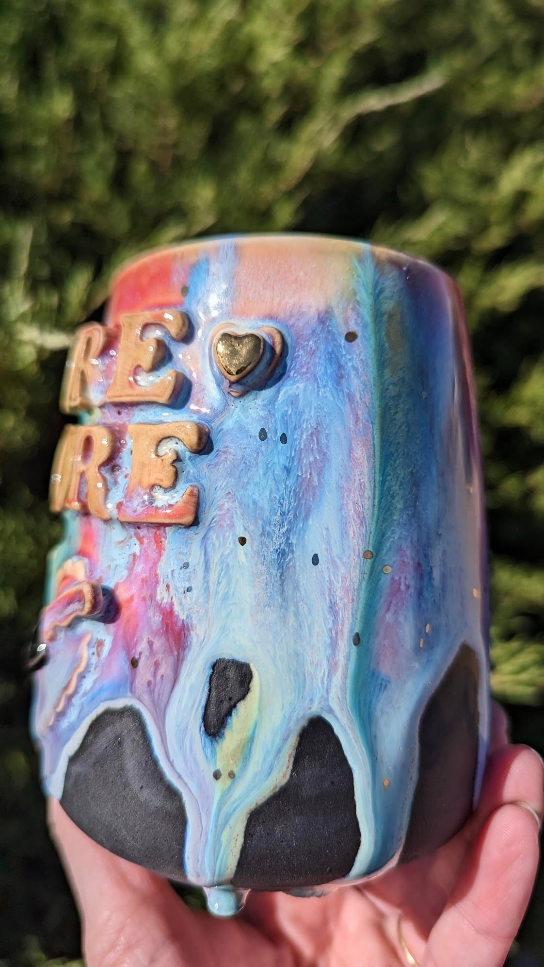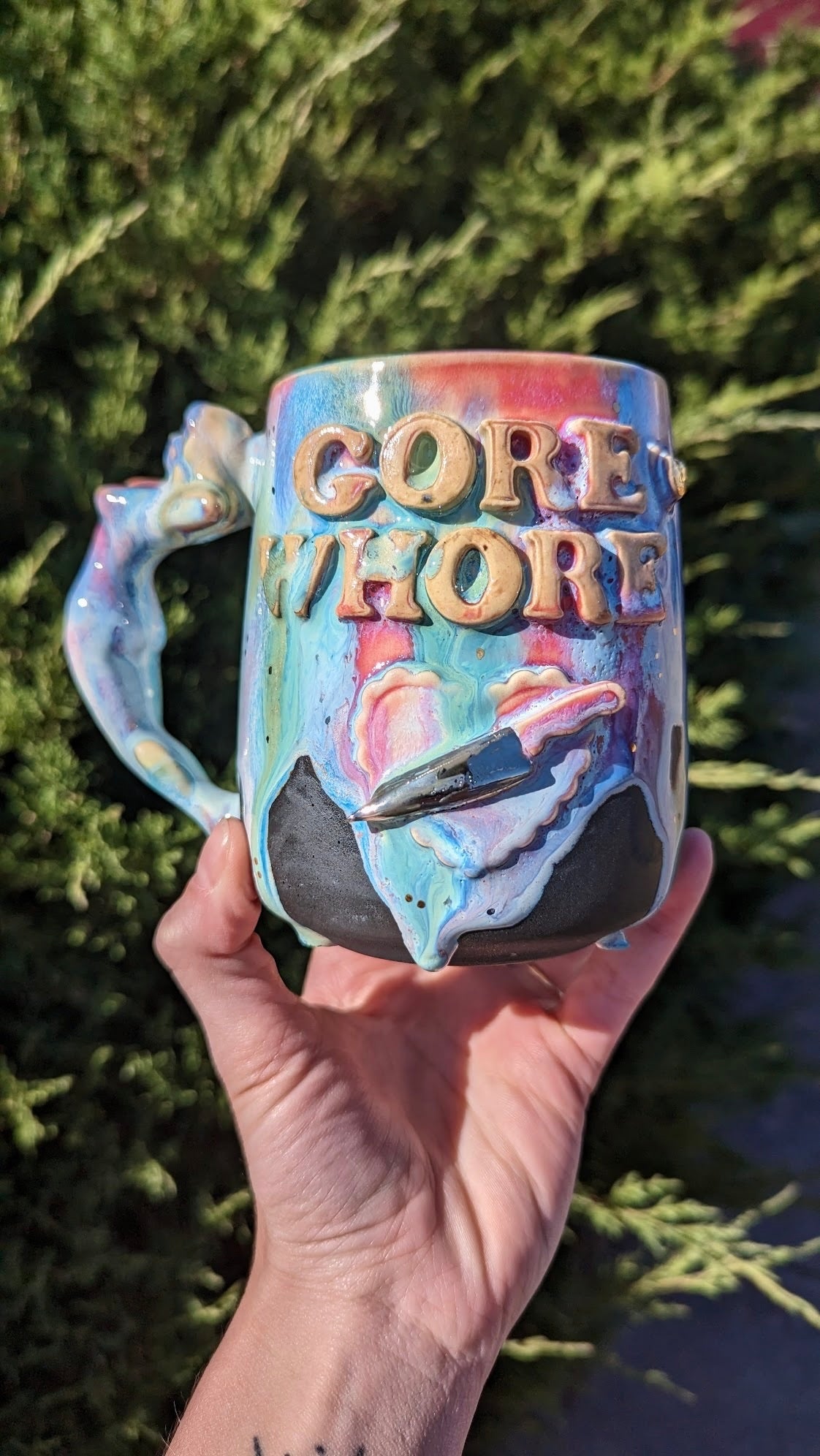 “Gore Whore” rainbow collab mug by SheWolf Studios and Lita Clay. Discounted for slightly warped rim