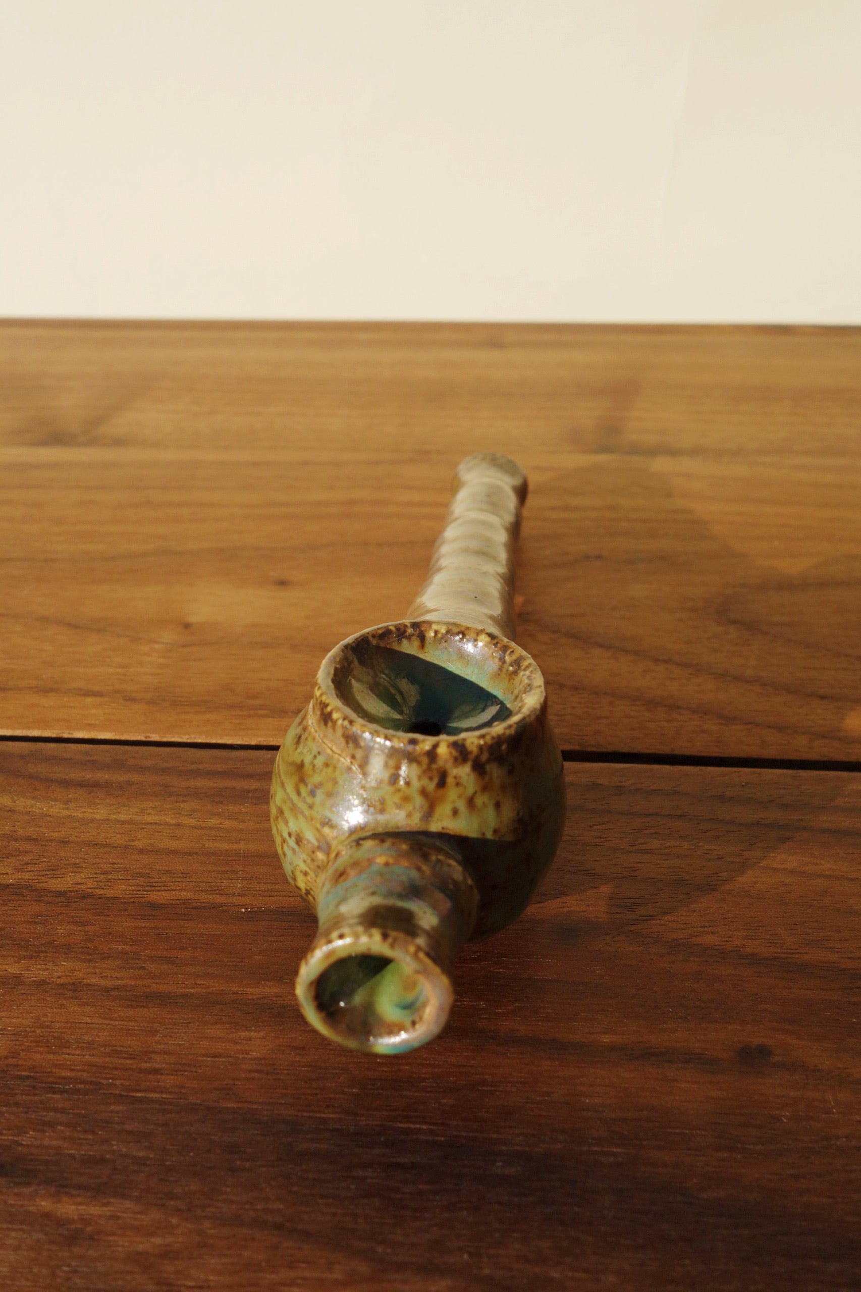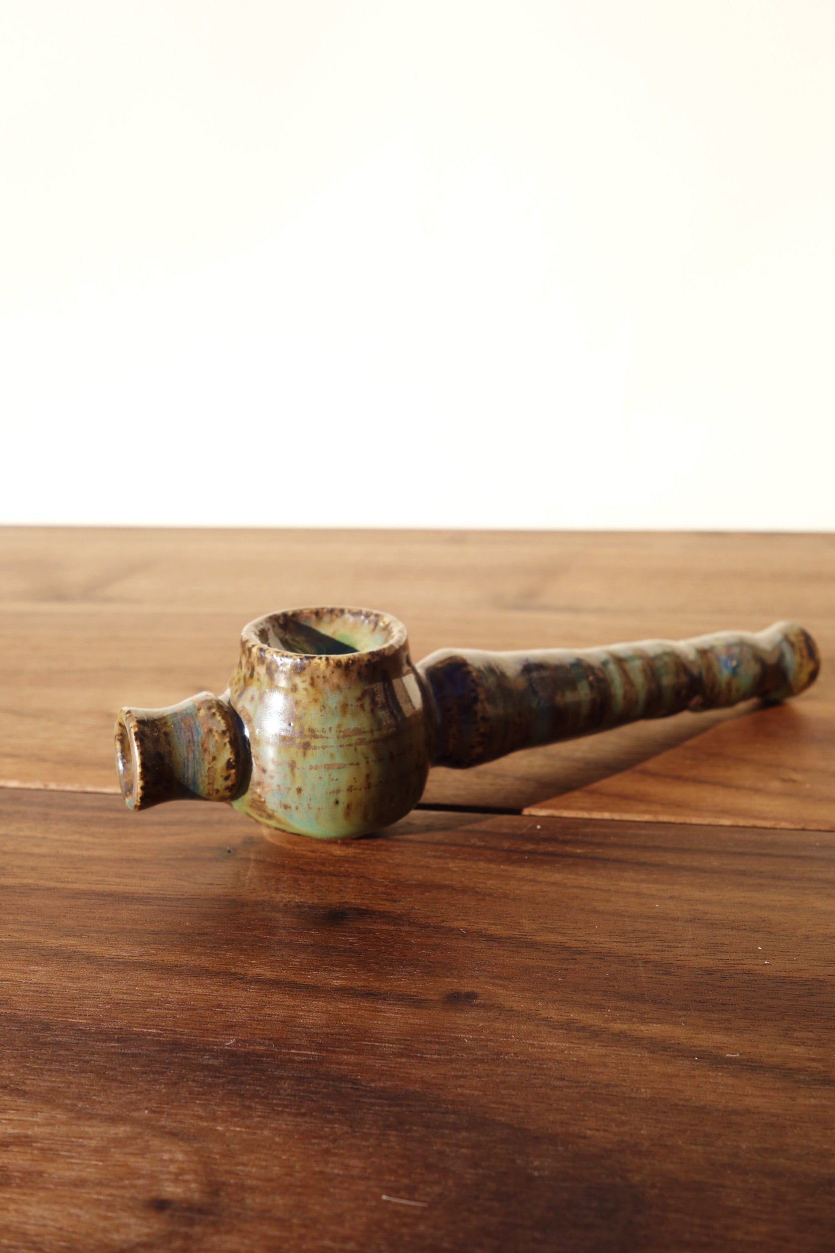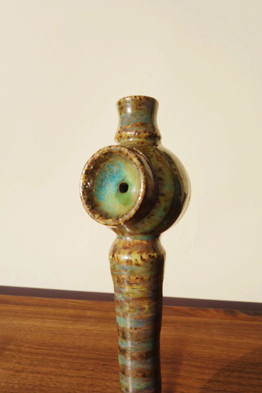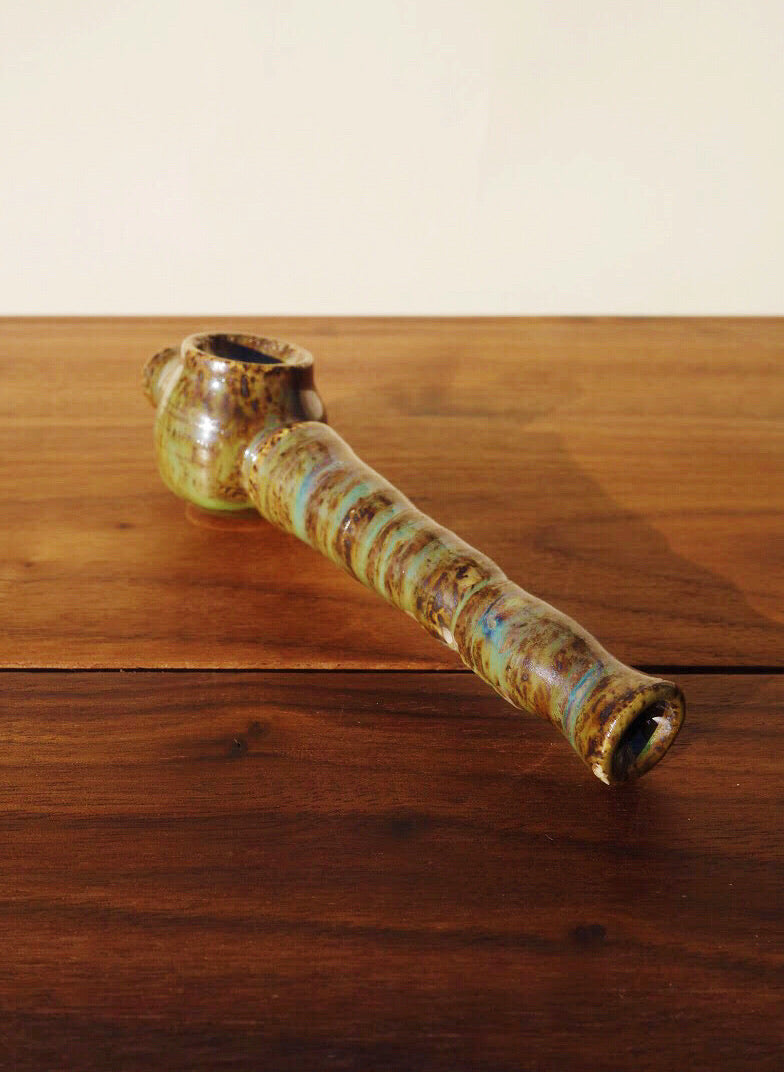 Iridescent emerald and topaz grass-stains streak an speckled bowl and stem, dripping to crystal-cut glaze along the bottom. This pipe, named for vibing to Bassnectar in the park on a damn good day, was made to act as a portable piece with the airflow of a steamroller. Nod away to better places with her in hand, and let the unnecessary noise fade away.