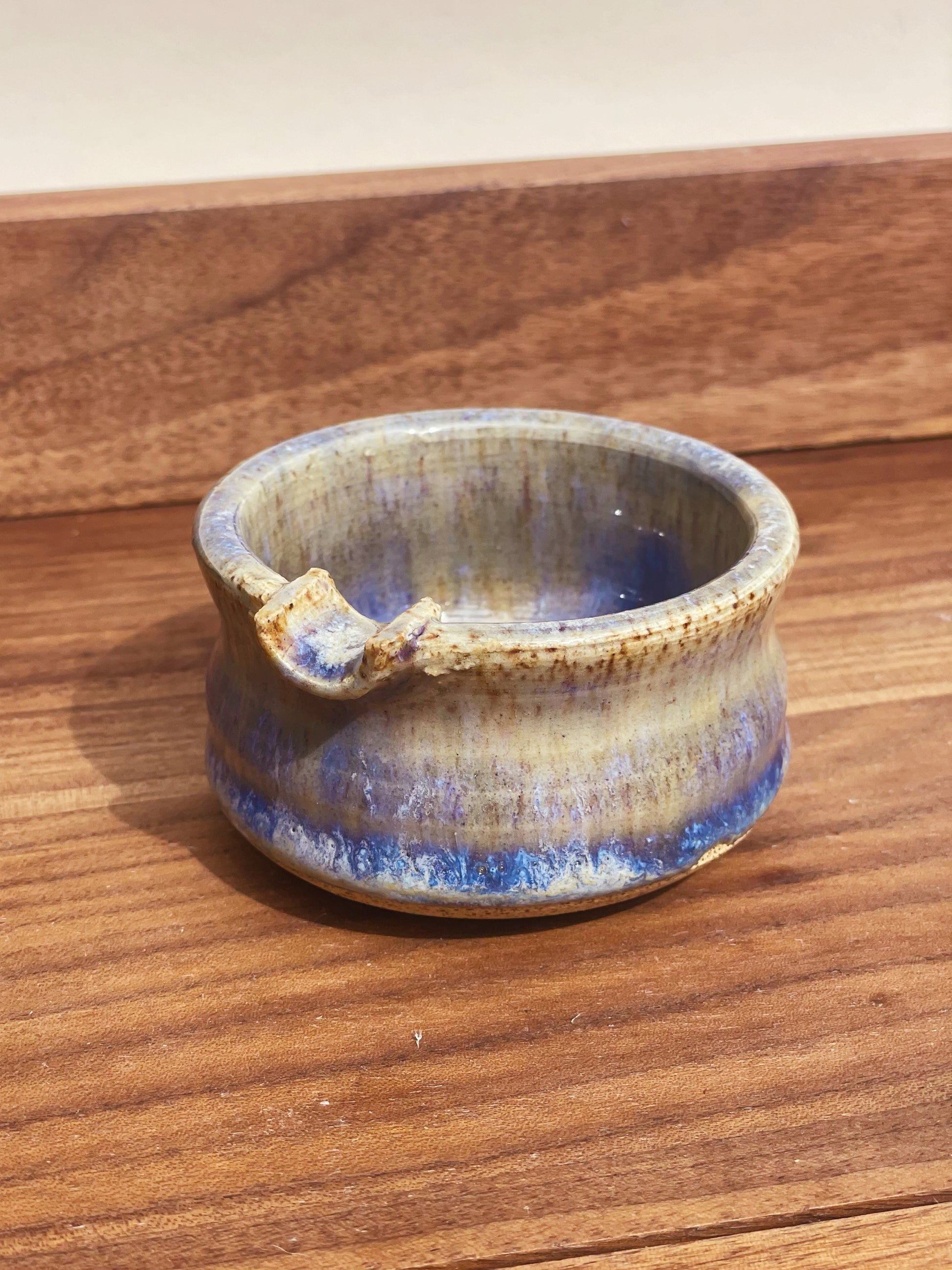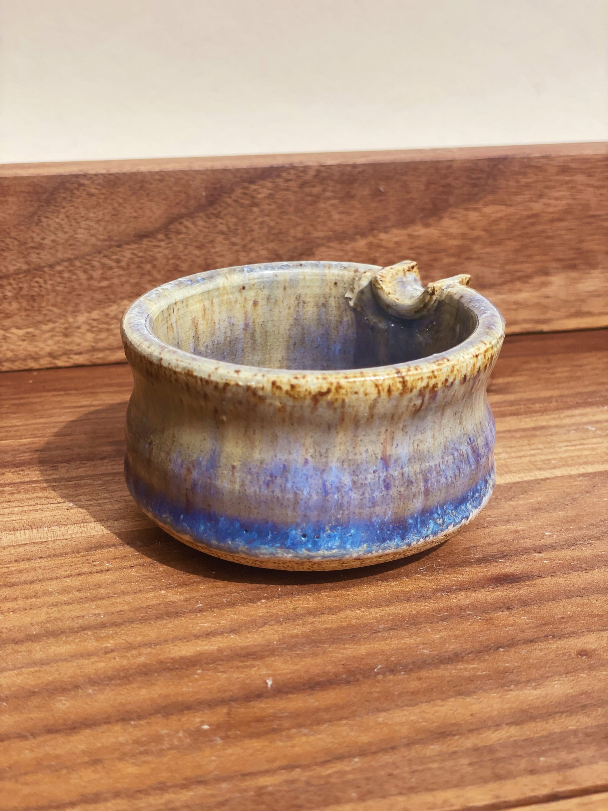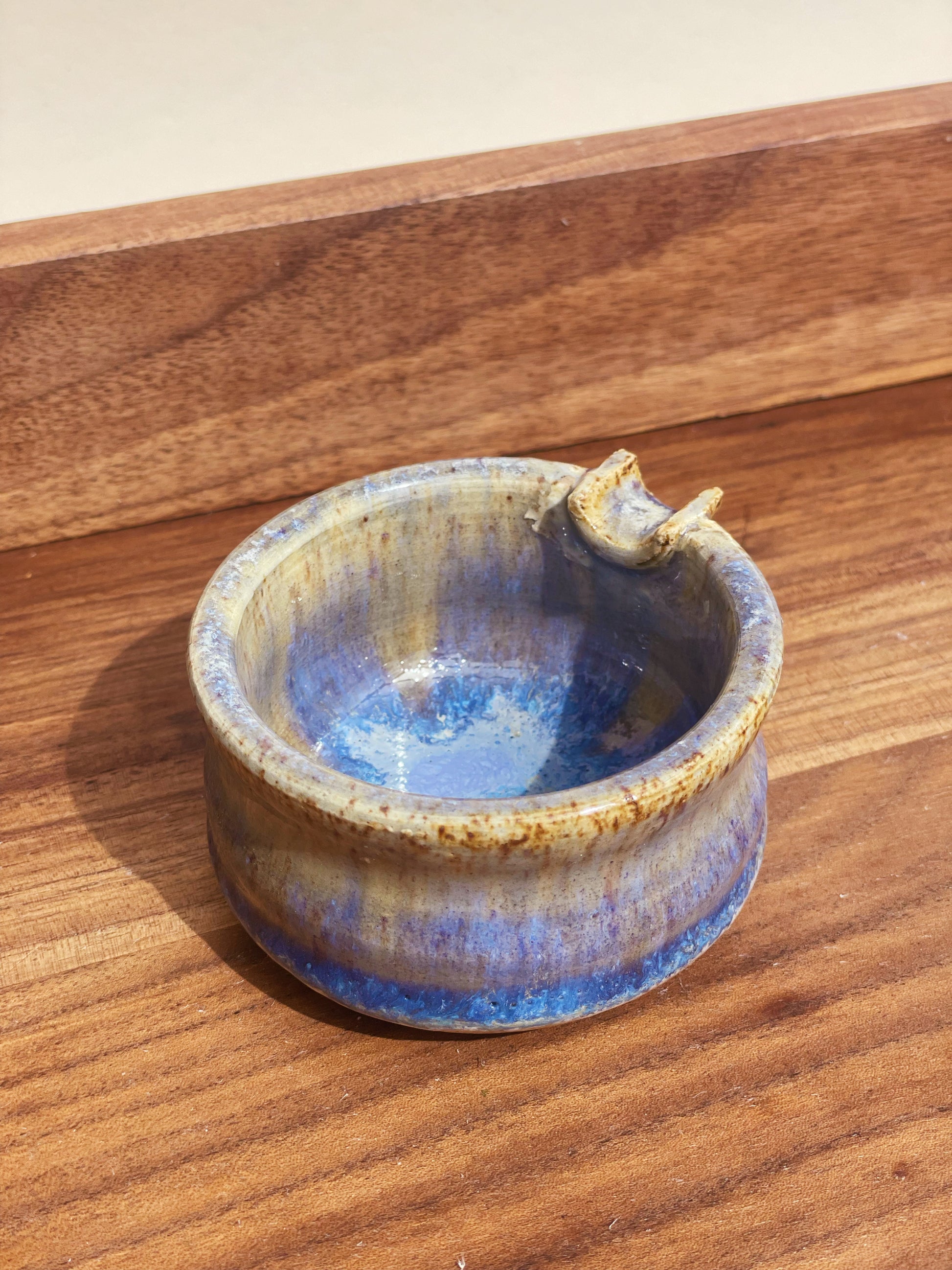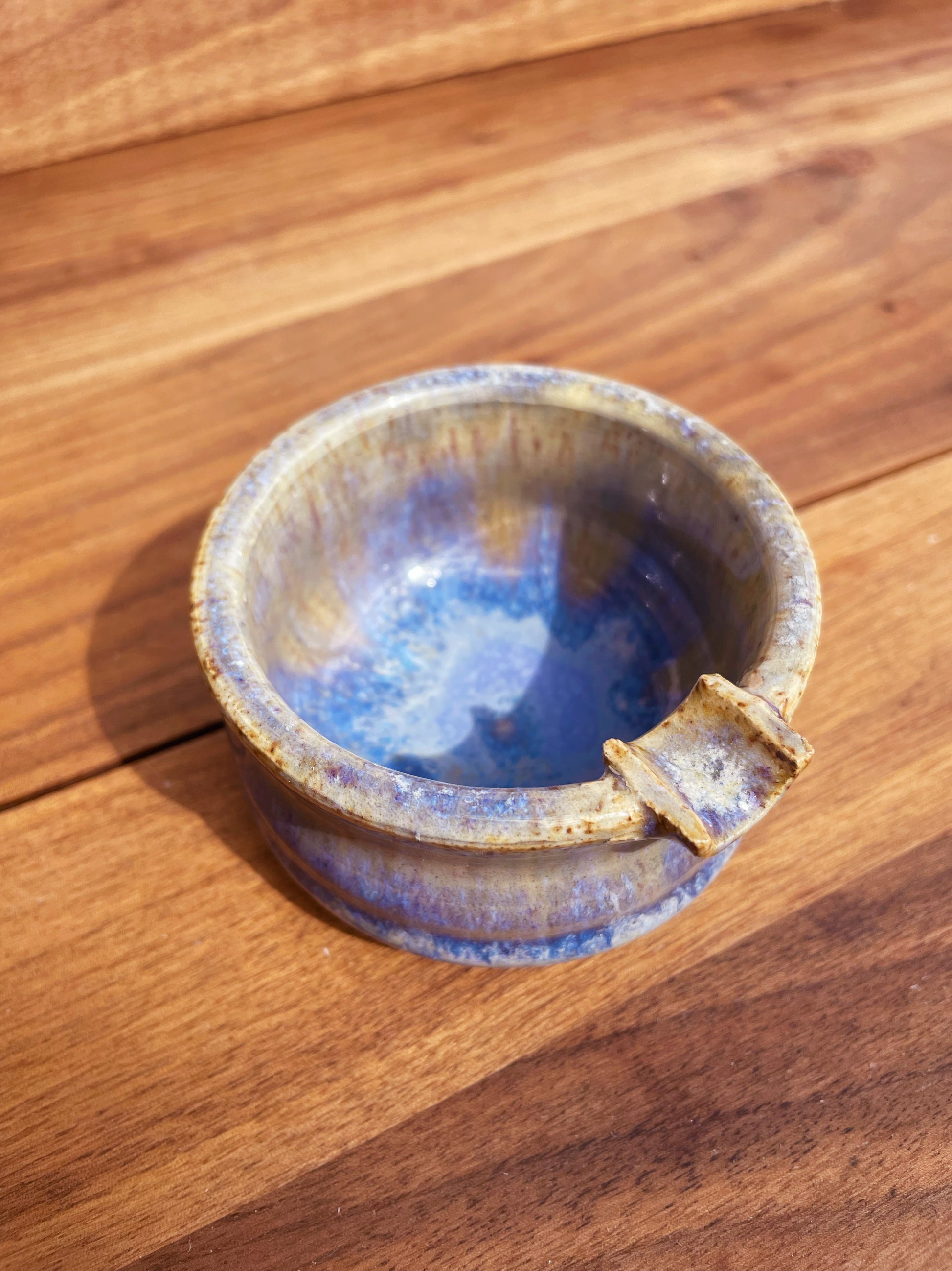 Luminescent cerulean washes over a speckled cream base, making an ashtray that brings its own sunny skies and clear weather. Embellished with a half-crescent rest for resting rolled smokes.