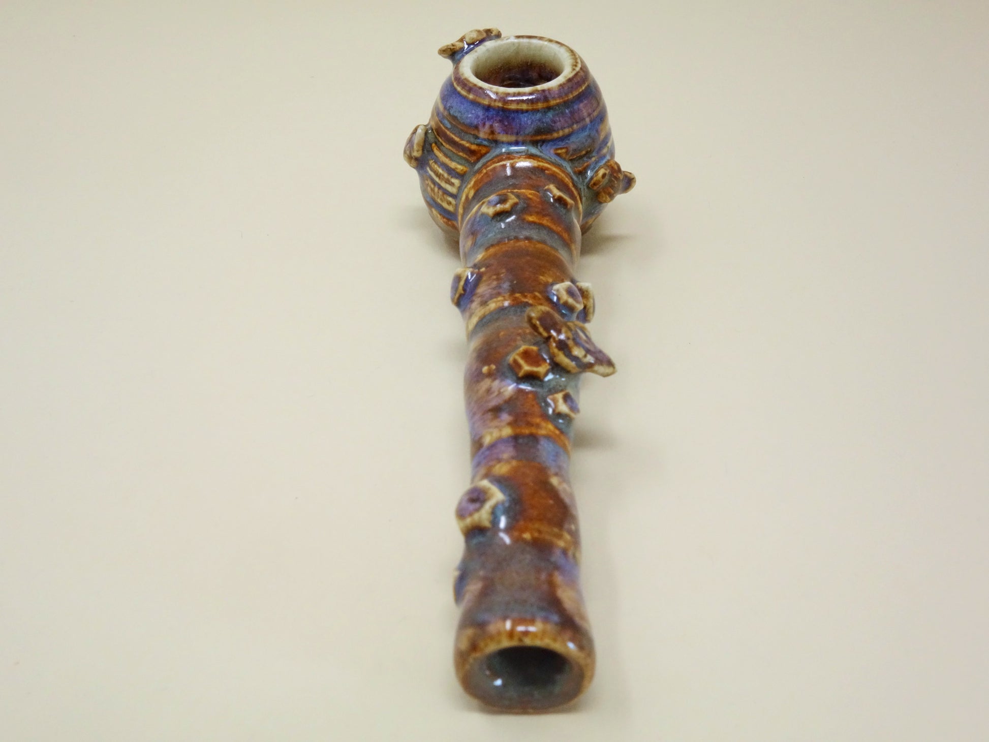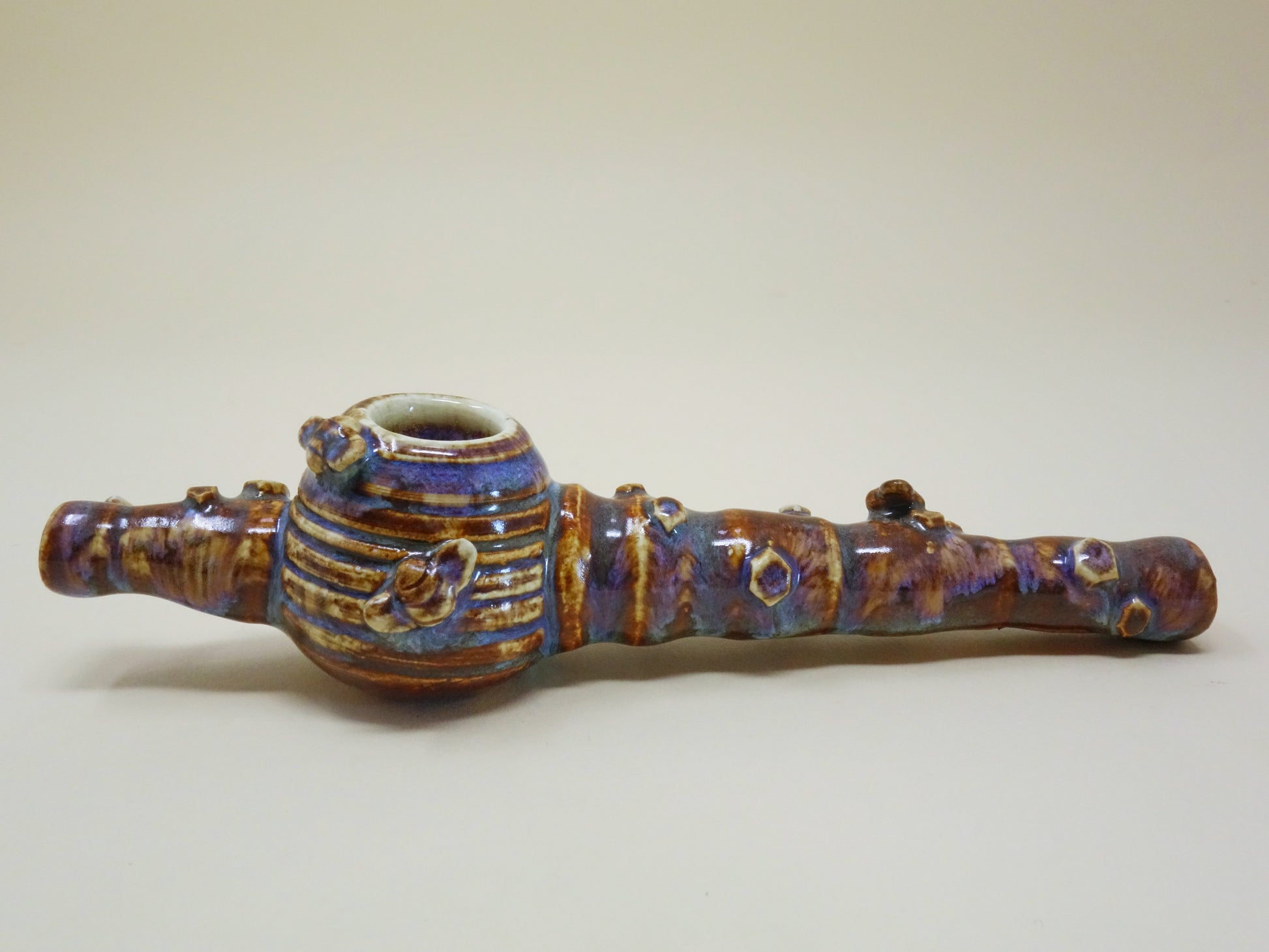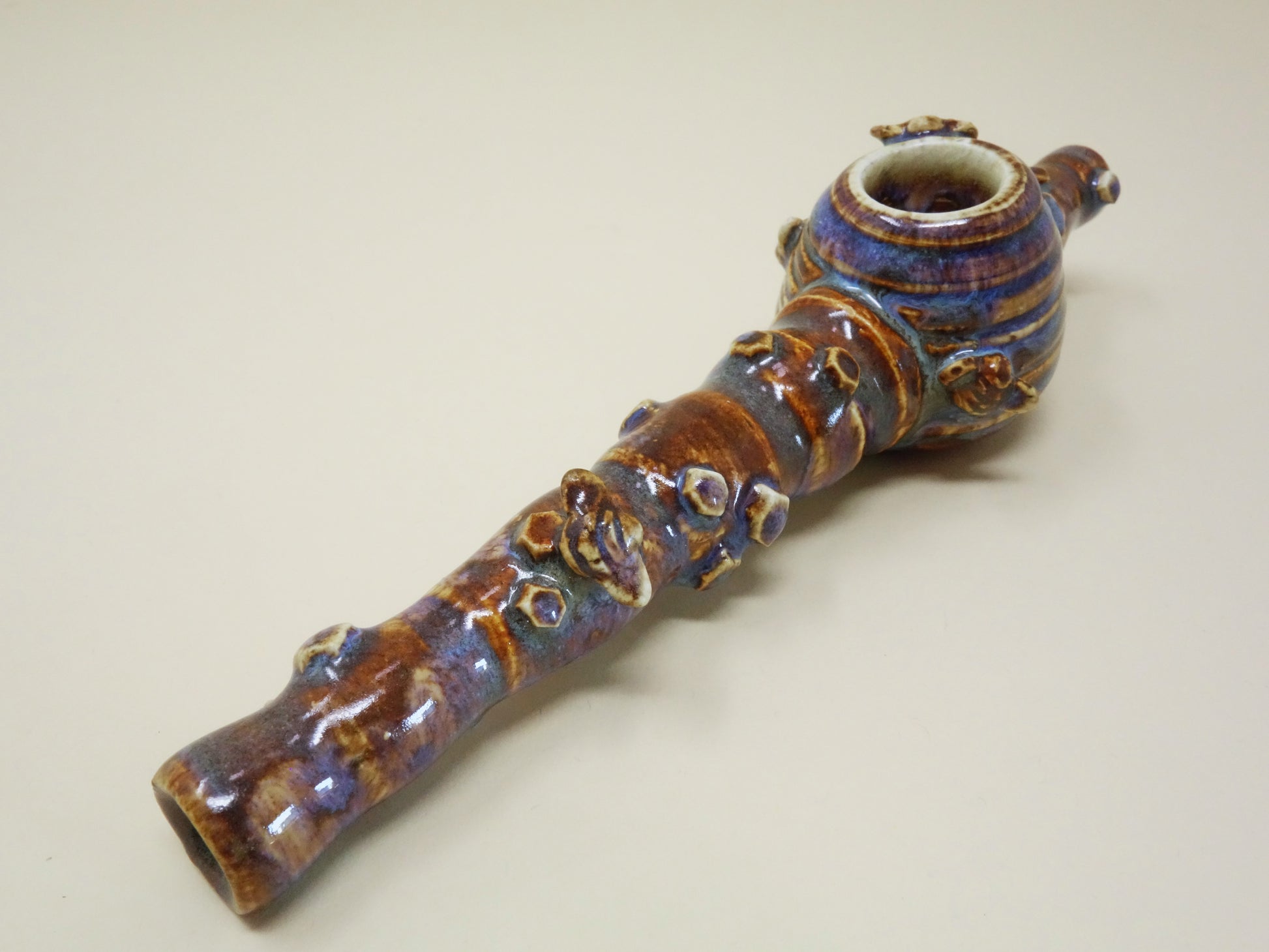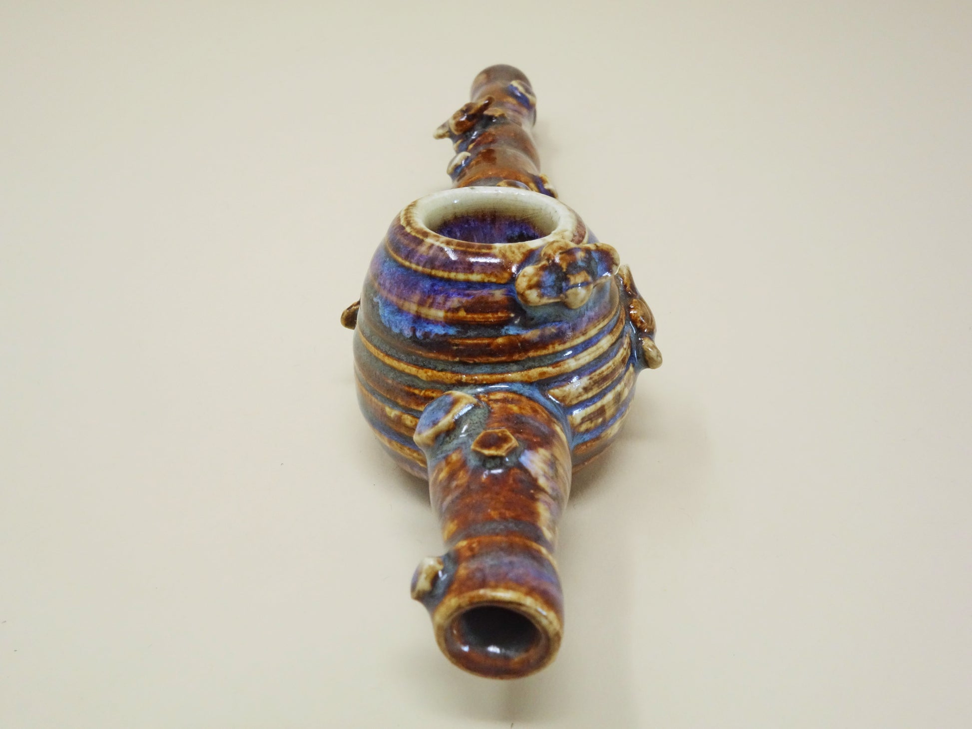 A steamroller piece made to praise the heavens, because Lordy, ain't it gorgeous. Four honeybees embellish a flurry of honeycomb hexagons, dripping with a waterfall of bright blues, purples and oranges. The first honeypot steamroller made by Lita Clay.