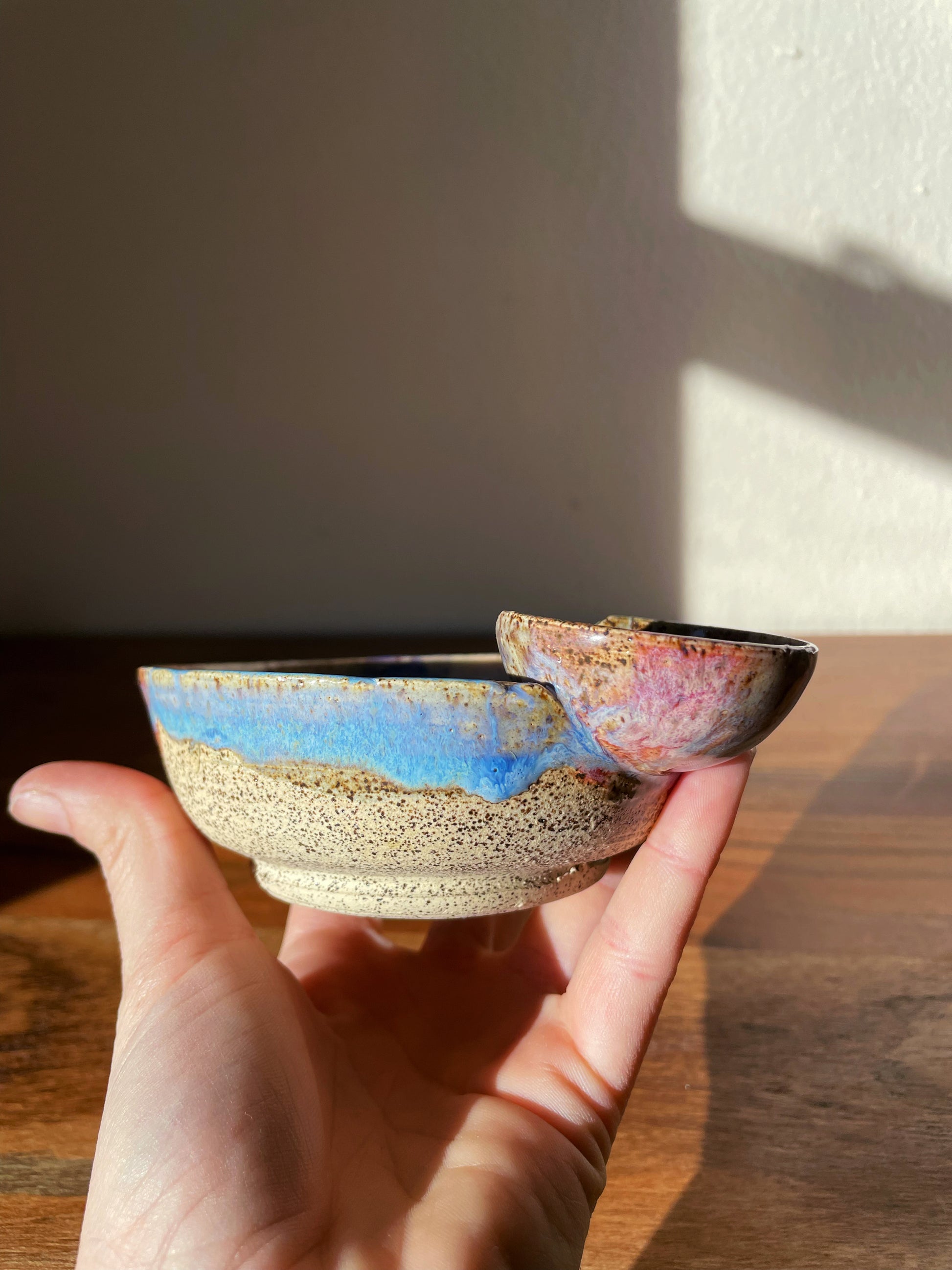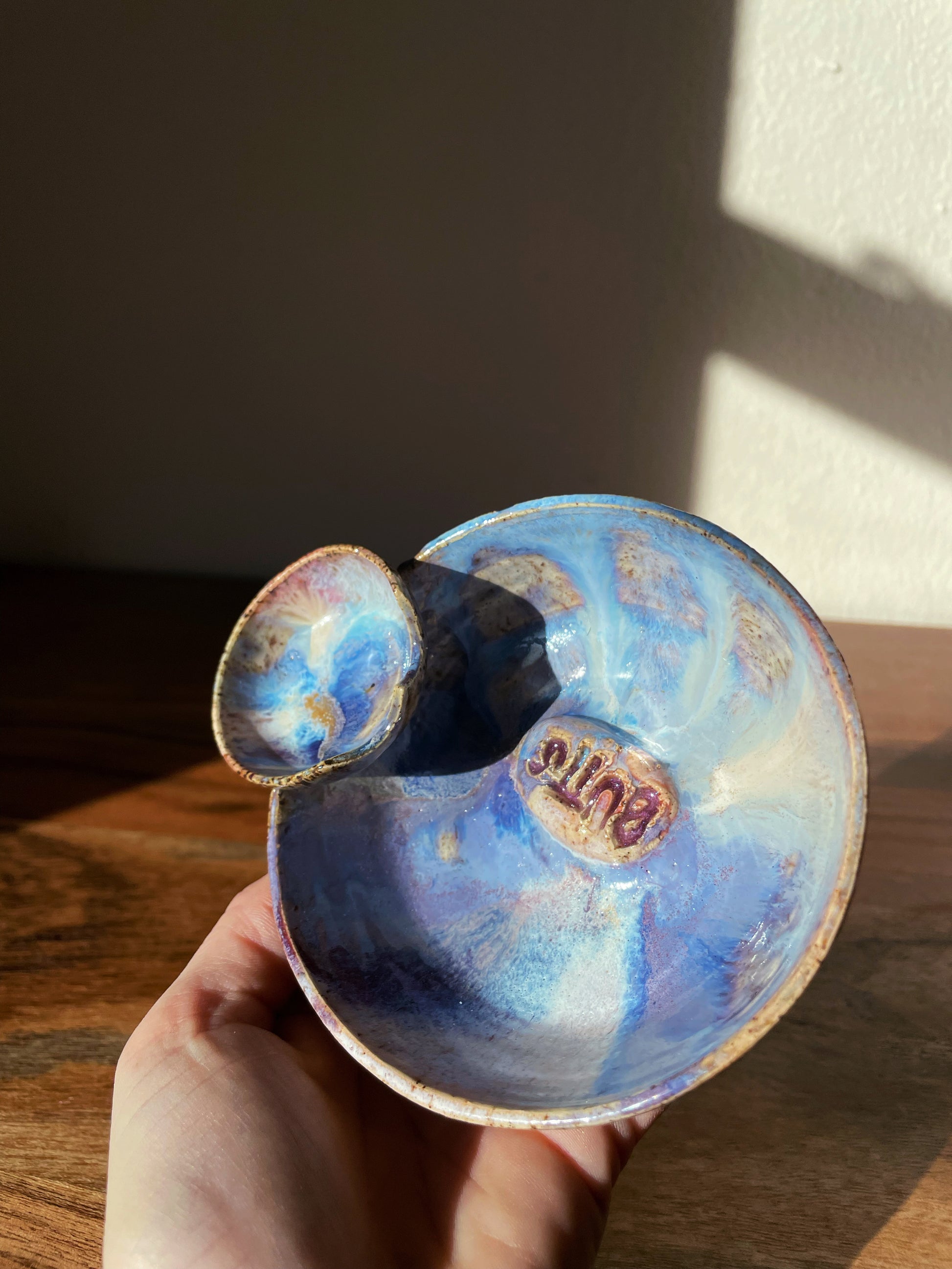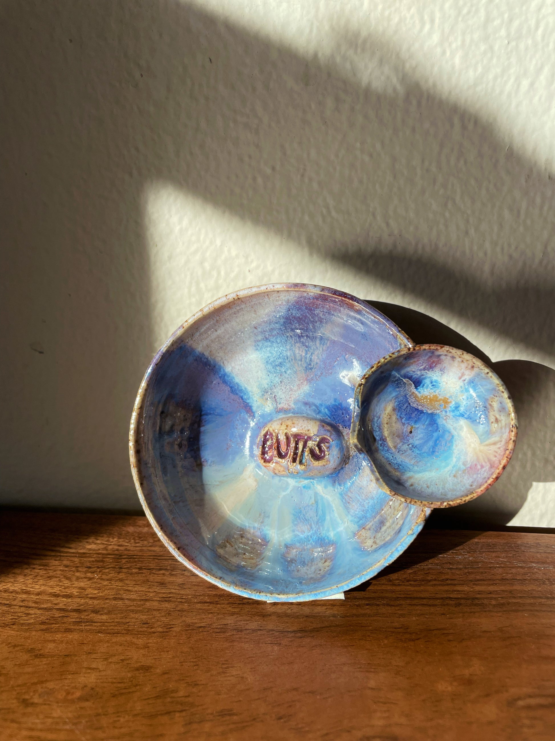 A Butt Buddies Ashtray for our space nerds and daydreamers. Violets, indigos and iridescent blues swirl together around the signature “BUTTS” center detail, mapping an entire galaxy of glaze reactions in one stunning piece. A small bowl offers a booty outline facing the main base to prop up your cigs and joints without a care.