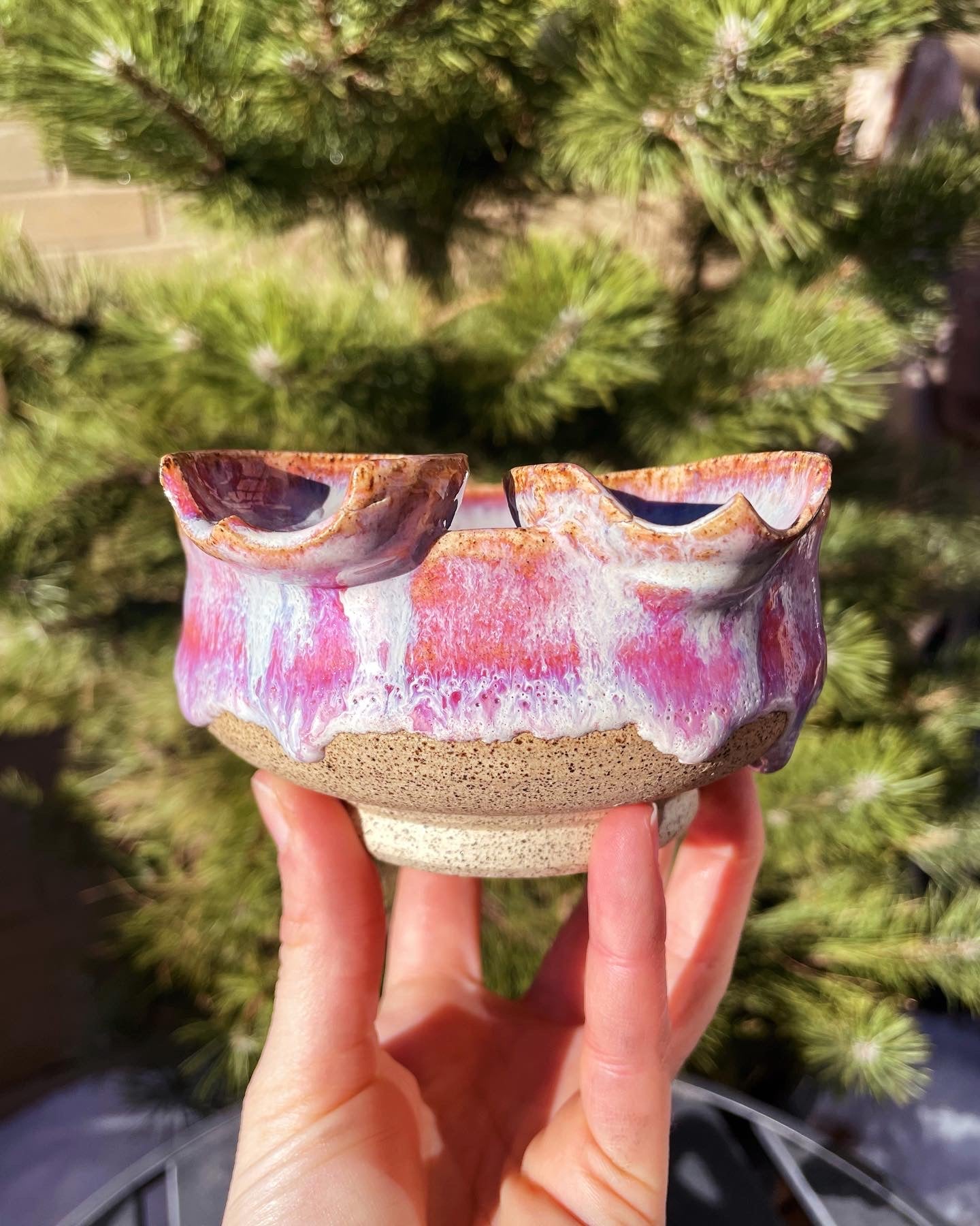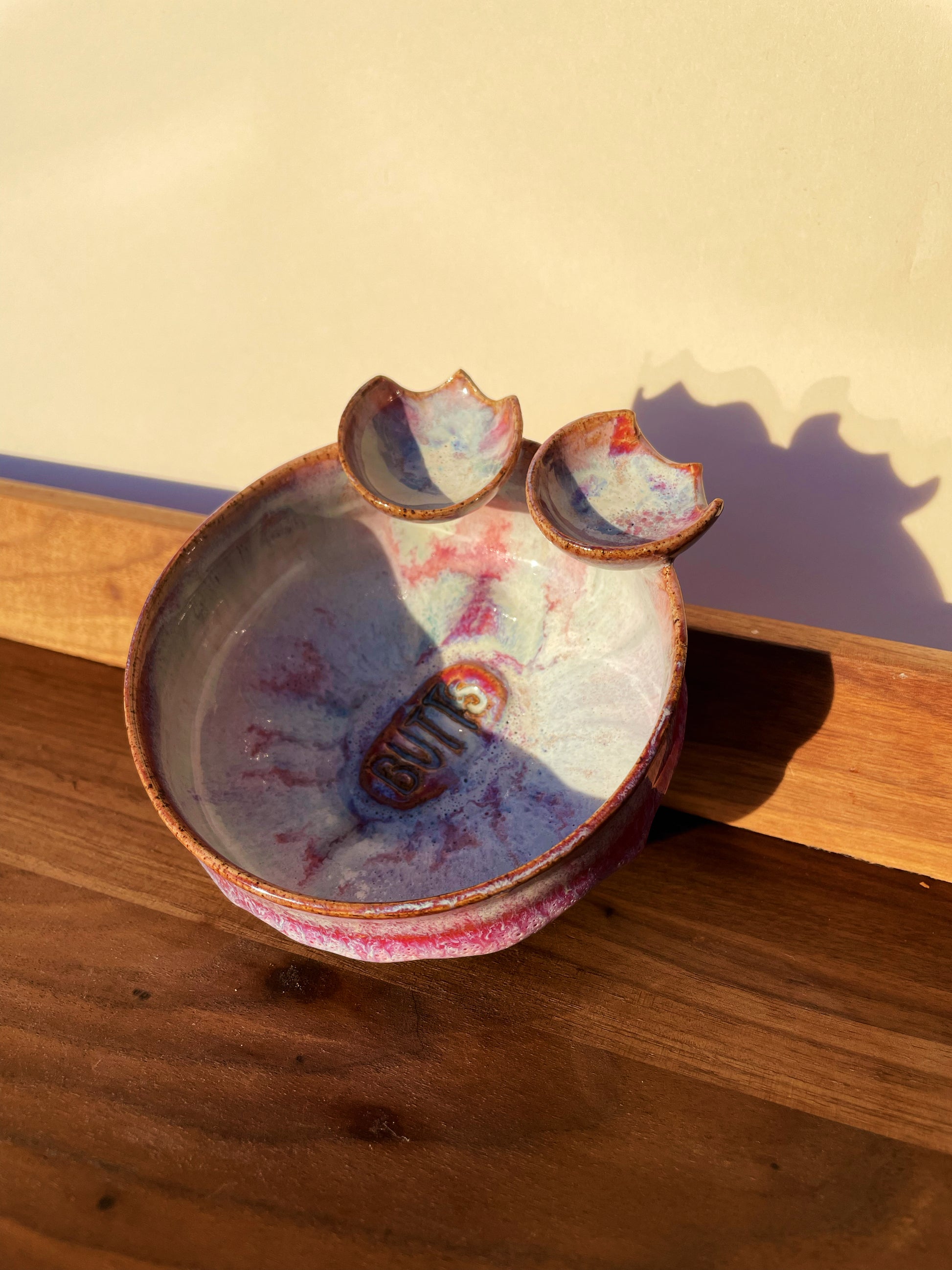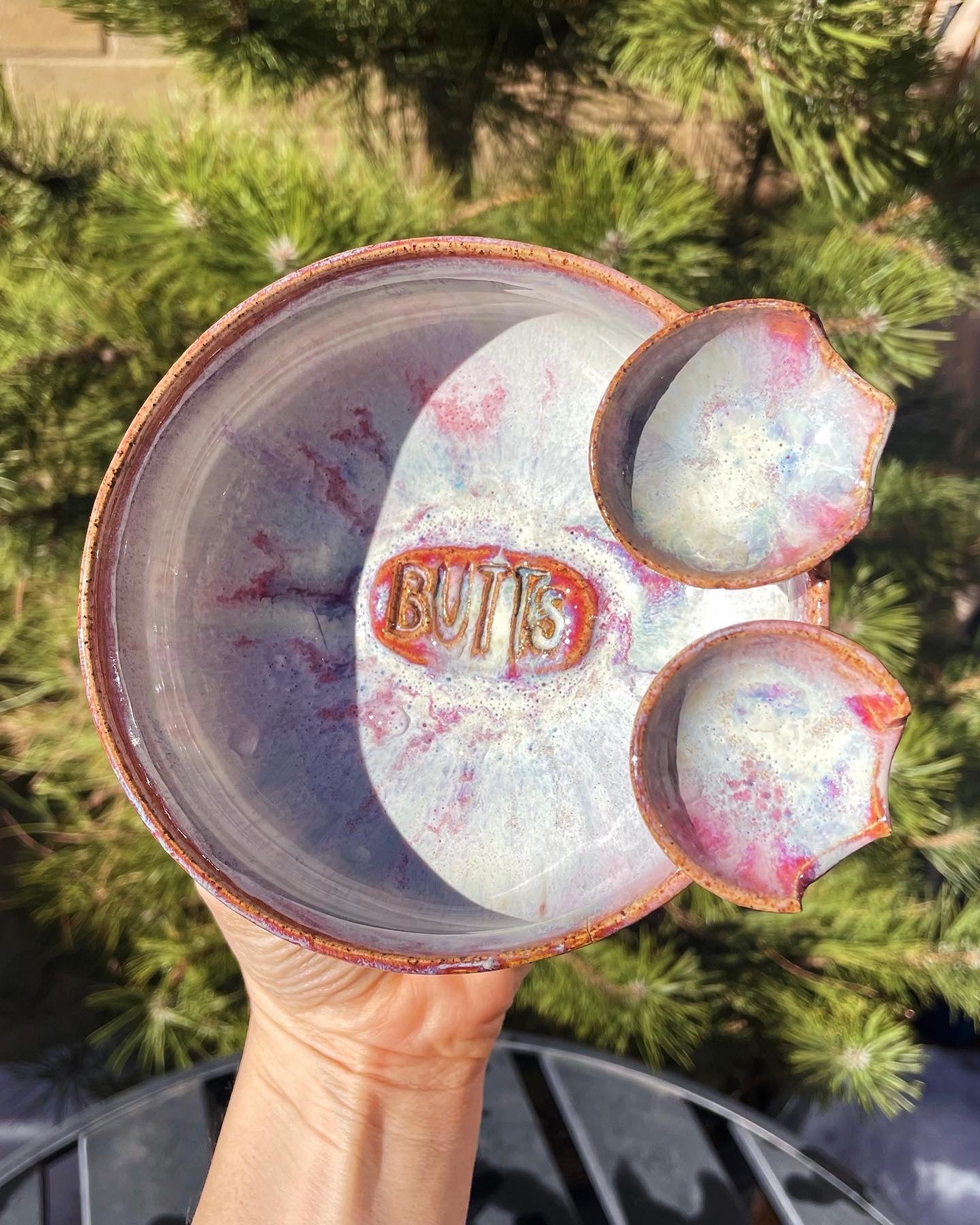 A Butt Buddies ashtray for the books. Have a buddy around and they want a butt-rest too? Not an issue for Lava Juice, which has TWO saucers attached to the main vessel, booty outlines carved into each! Luminescent pearl white melts into hot pink around the outside, a ring of crimson where the glaze is thickest, with the signature "BUTTS" detail embellished in the center.