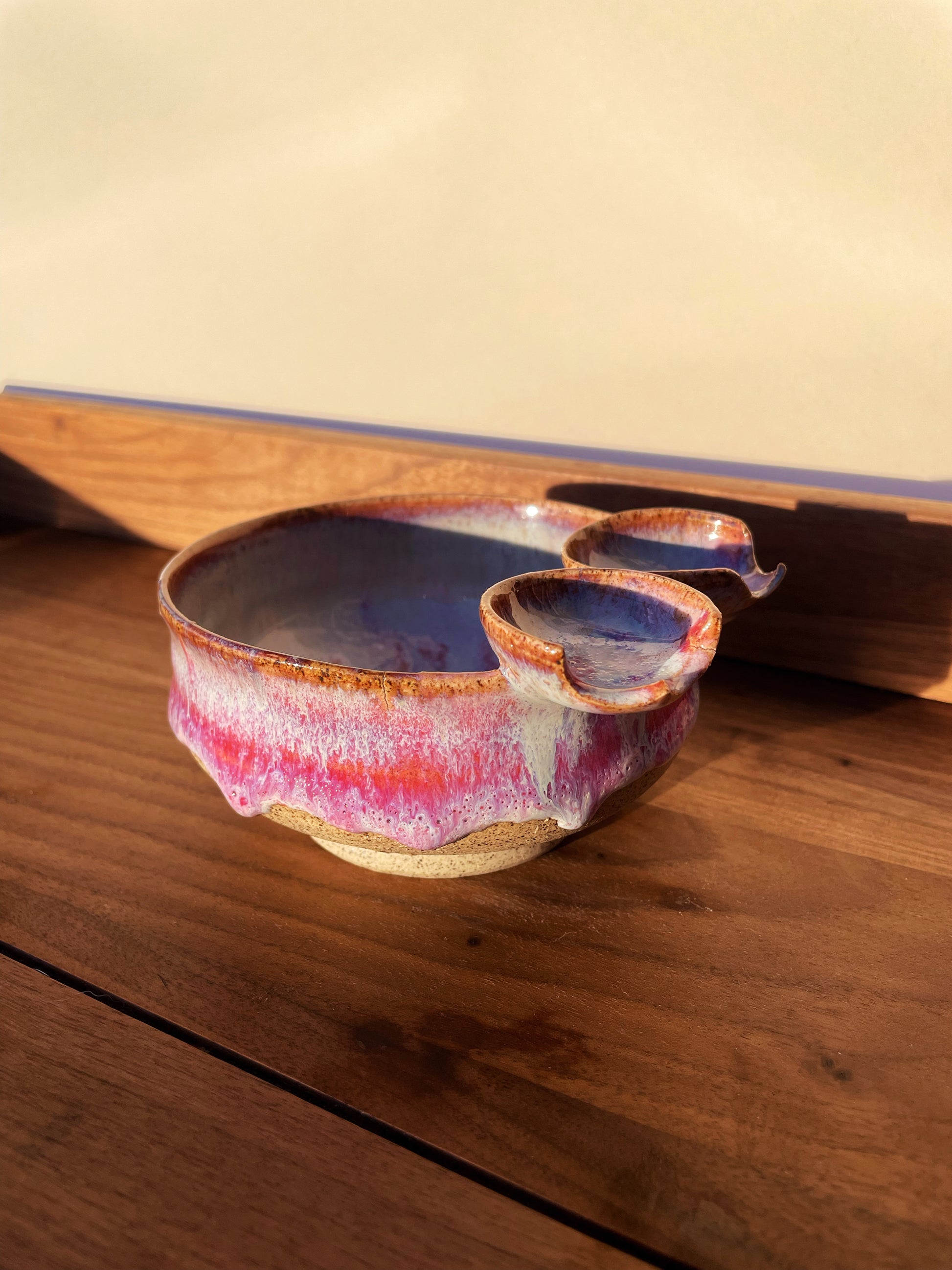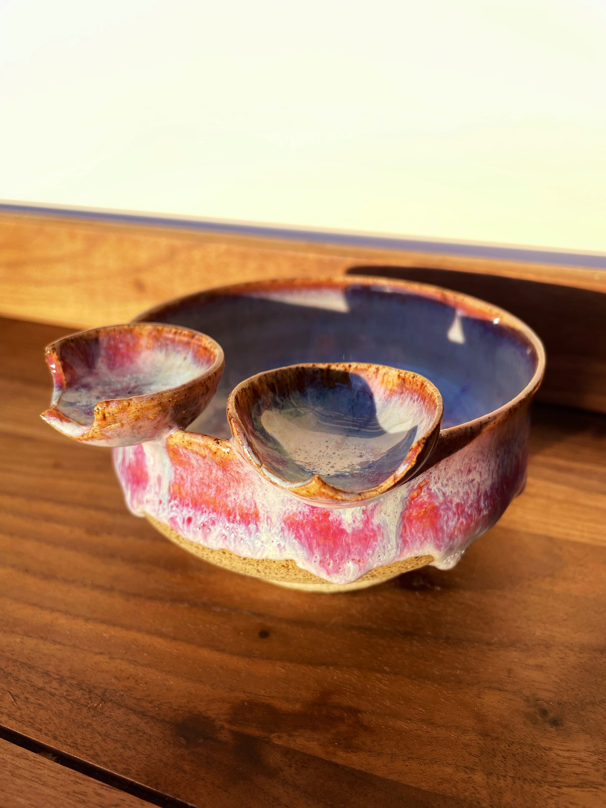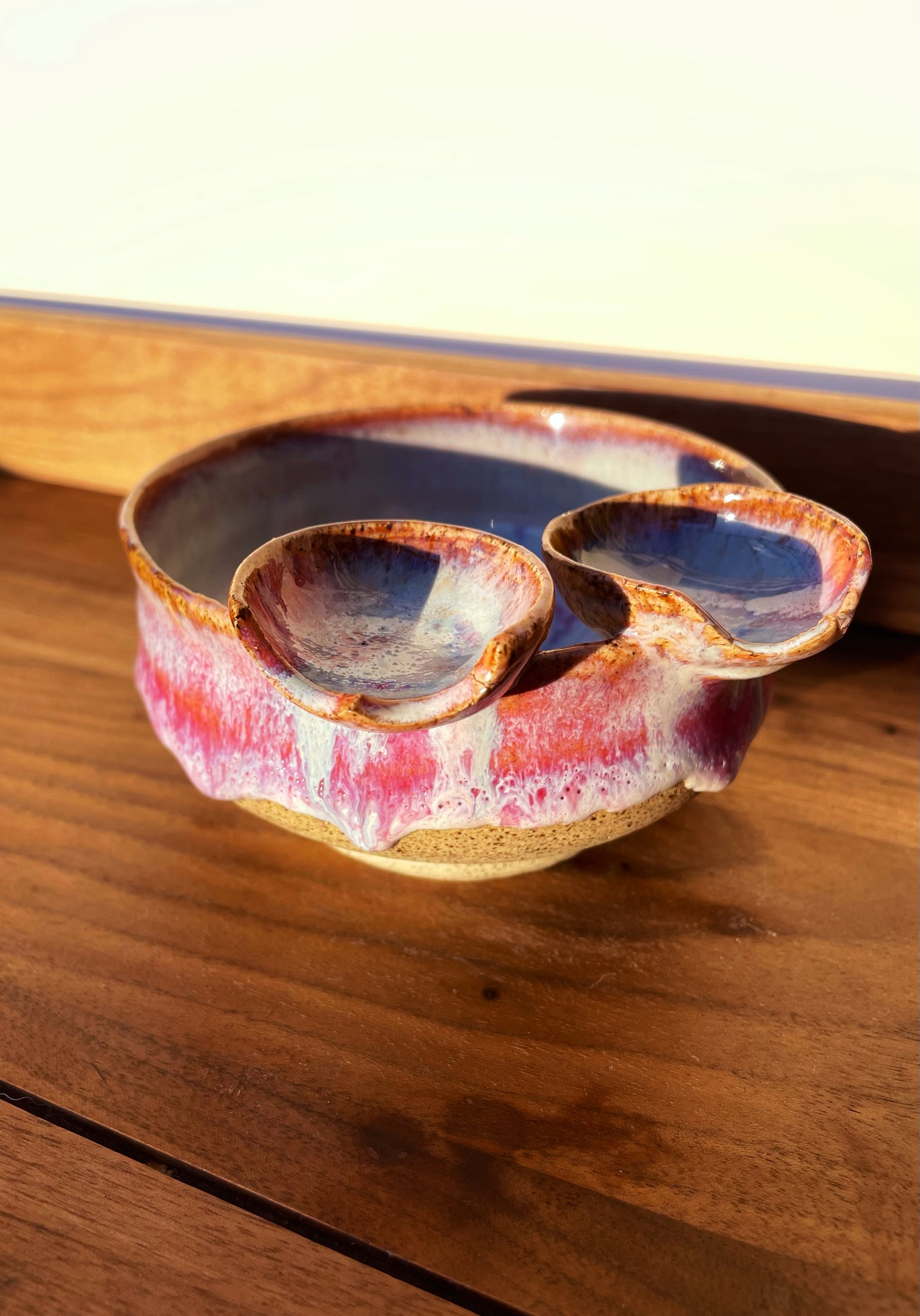 A Butt Buddies ashtray for the books. Have a buddy around and they want a butt-rest too? Not an issue for Lava Juice, which has TWO saucers attached to the main vessel, booty outlines carved into each! Luminescent pearl white melts into hot pink around the outside, a ring of crimson where the glaze is thickest, with the signature "BUTTS" detail embellished in the center.