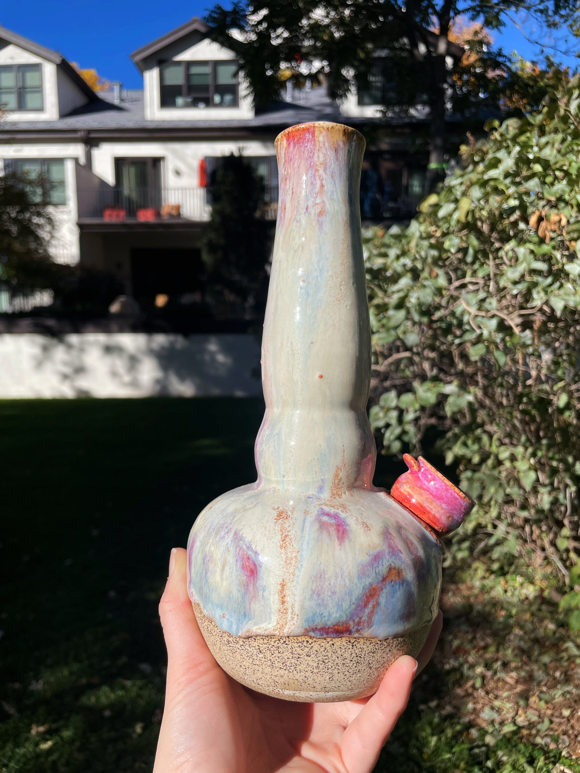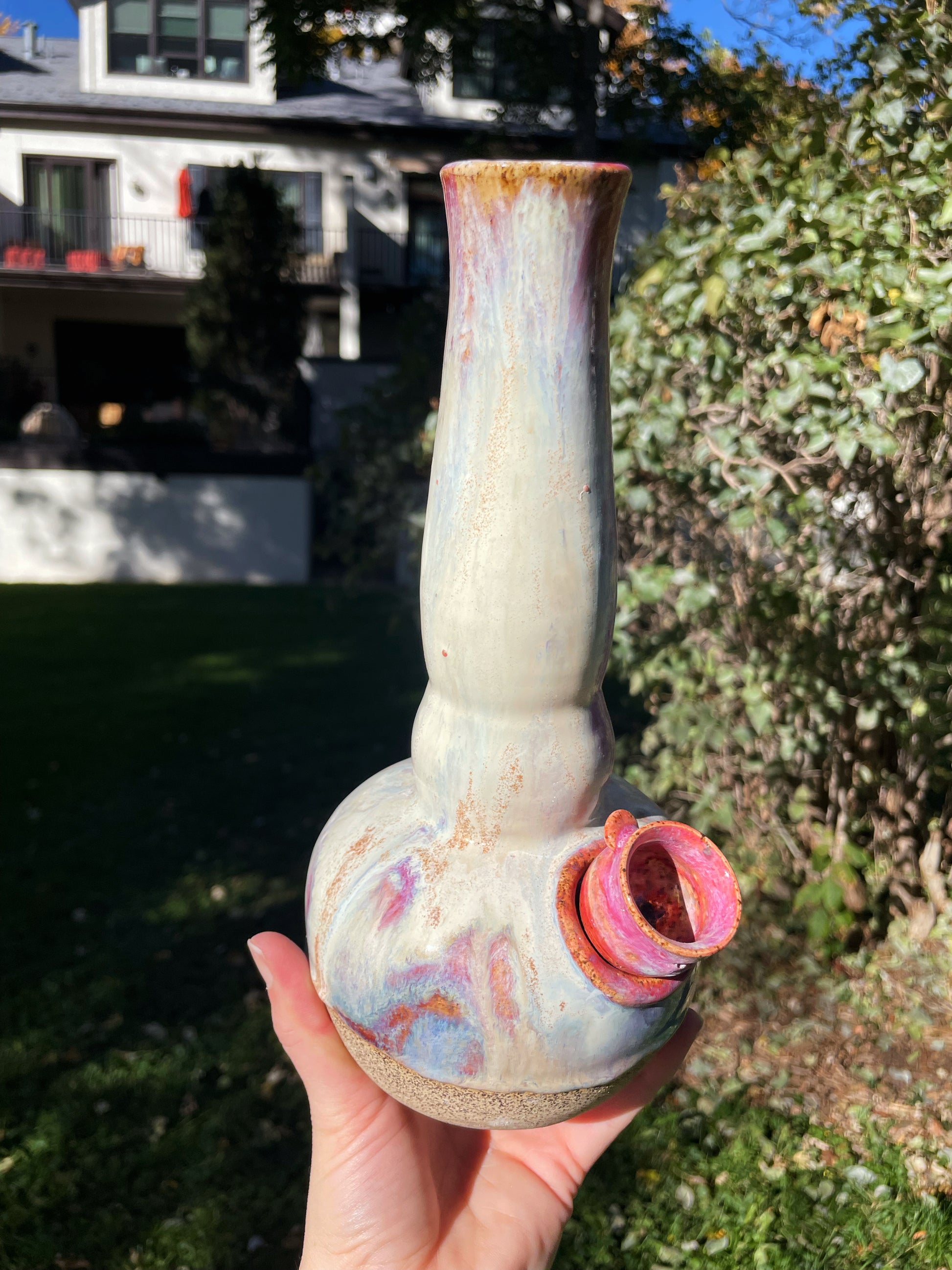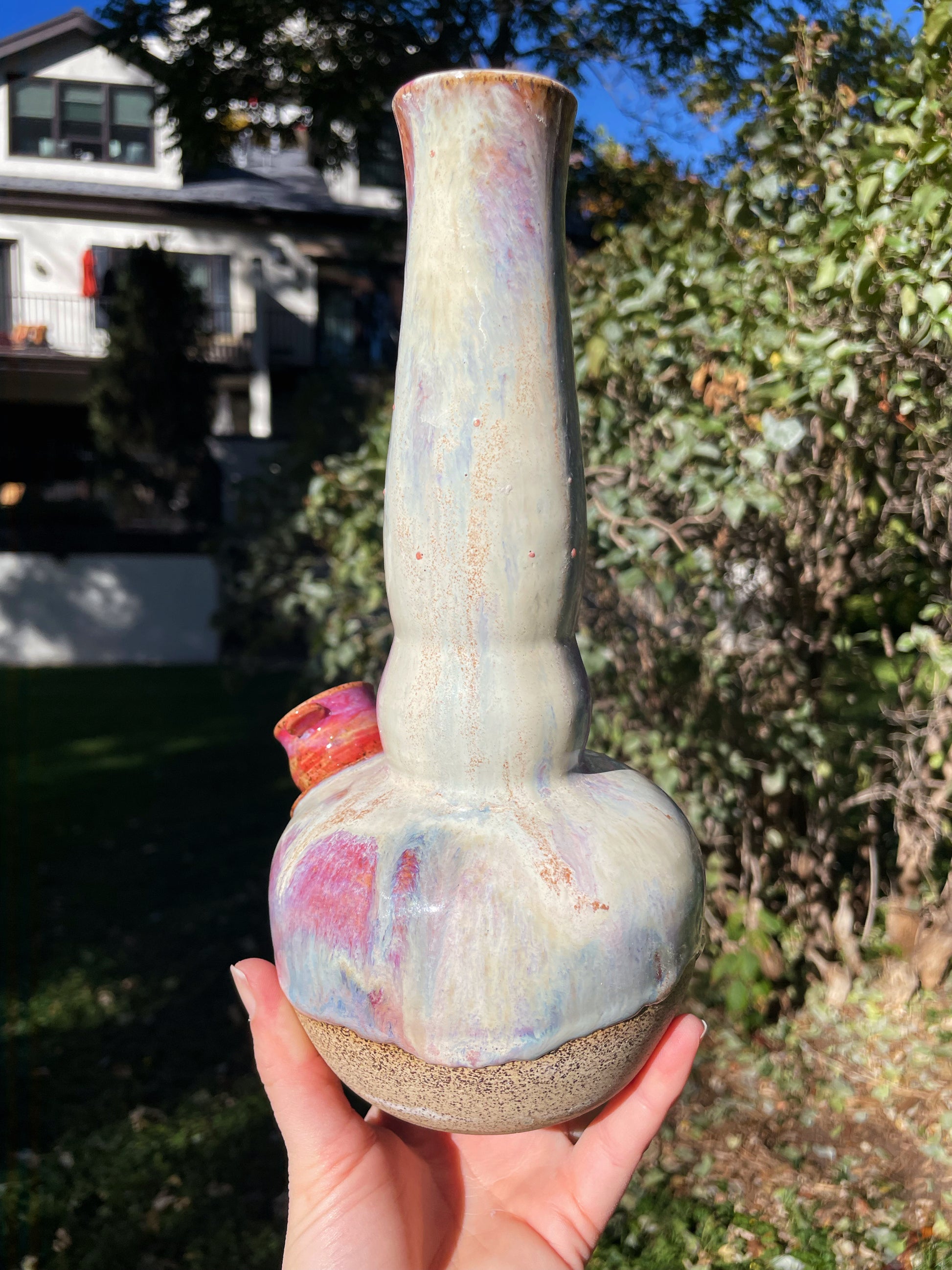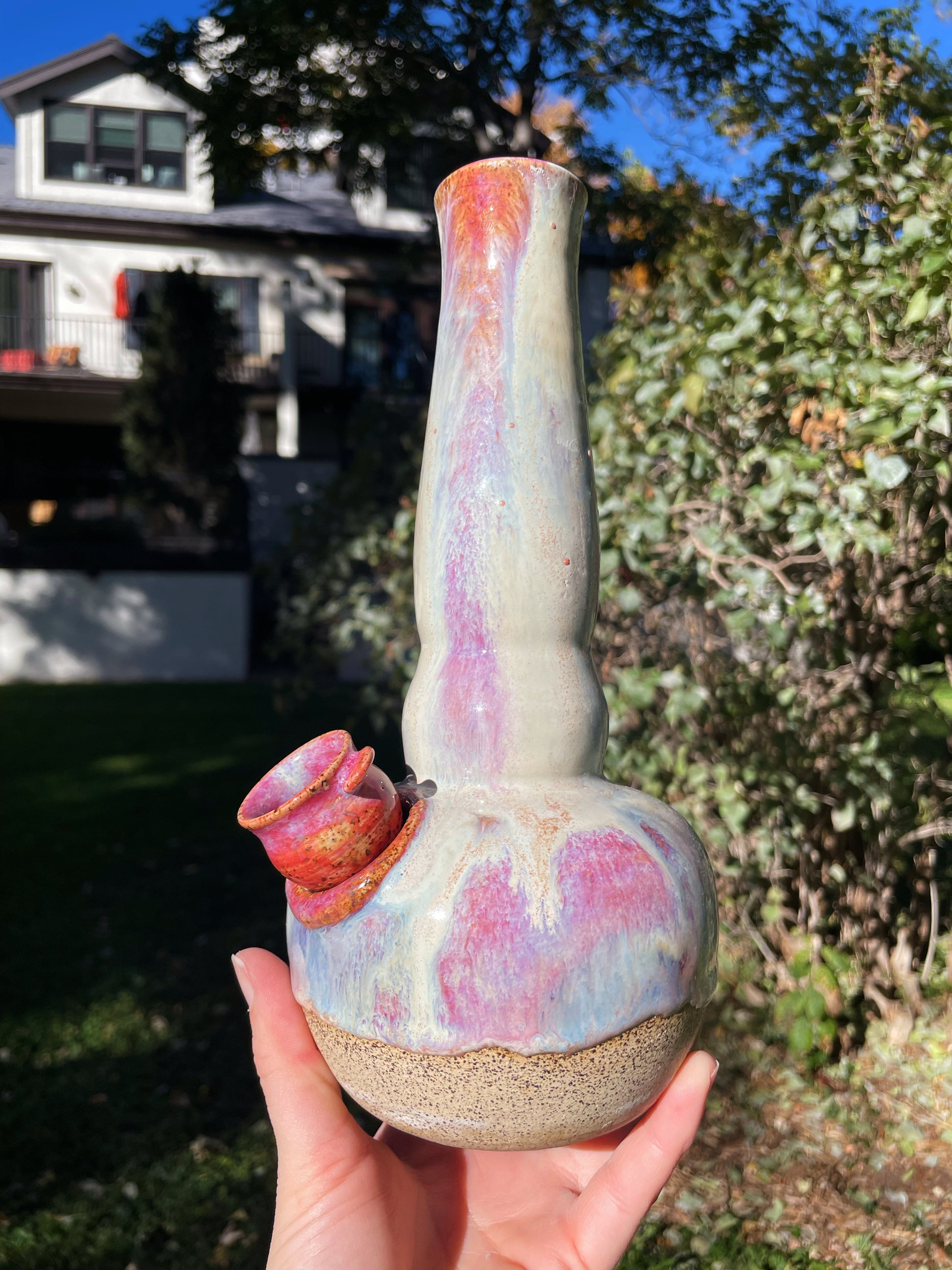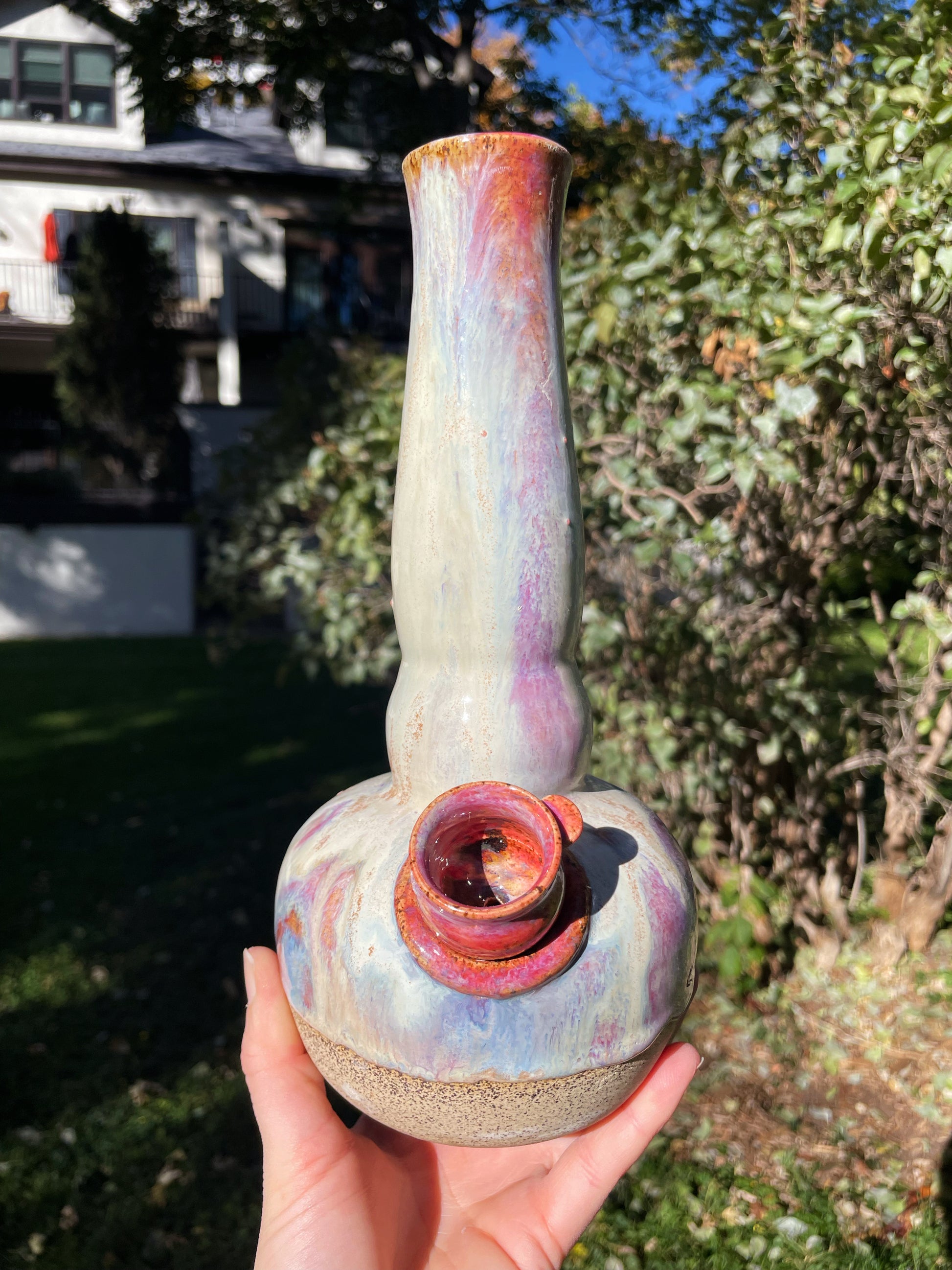 A rounded rosy bong, complete with a detachable bowl and an ice-catcher.