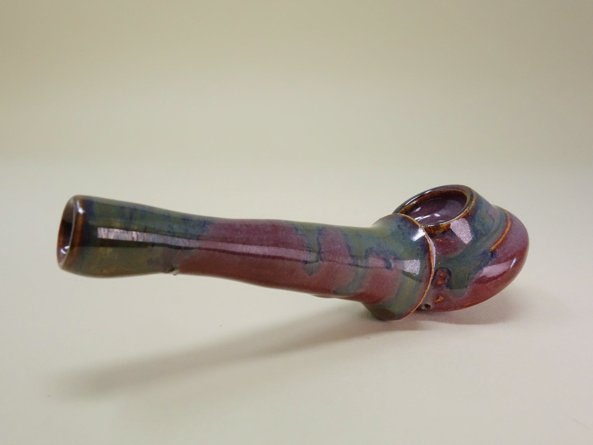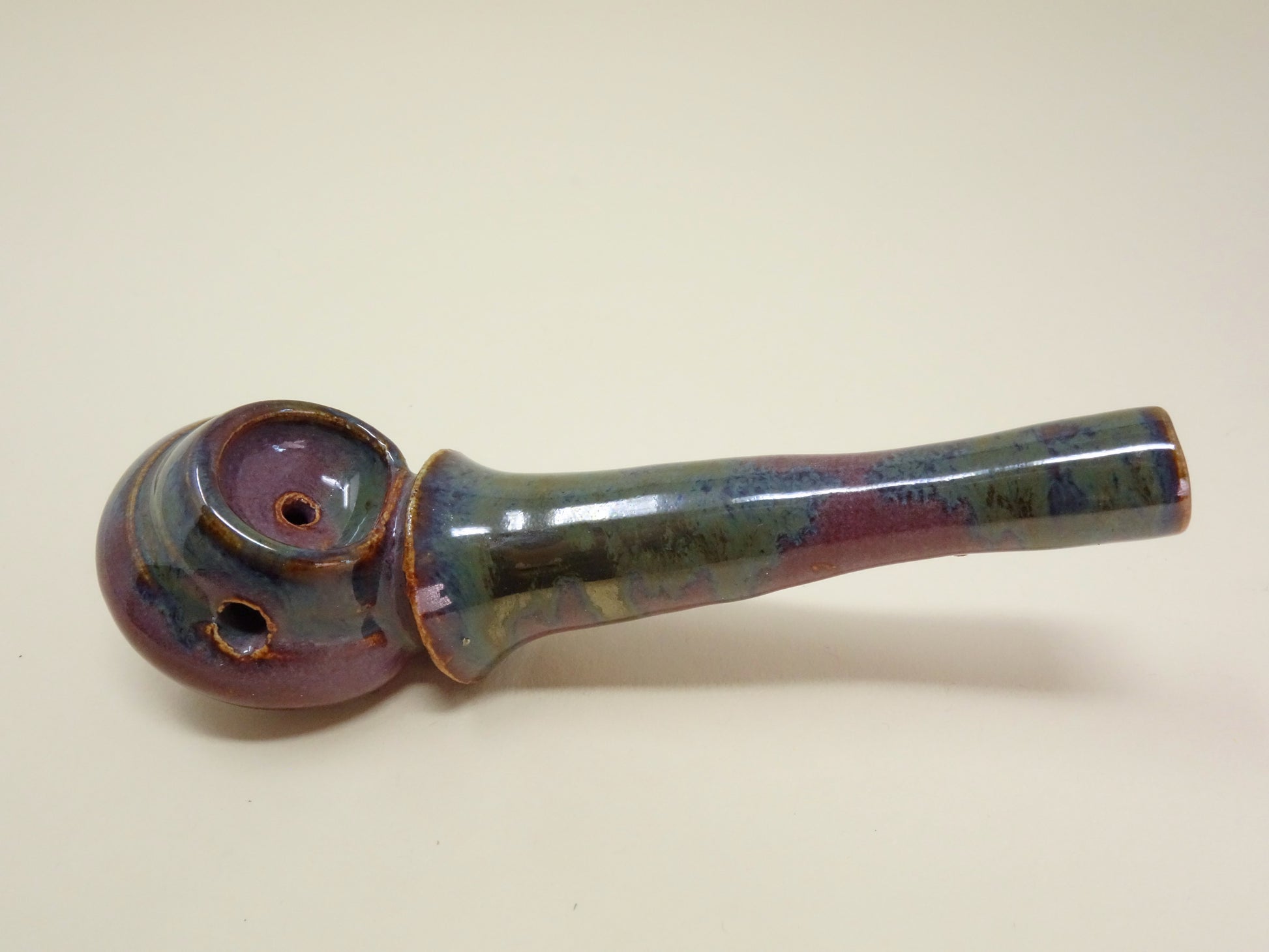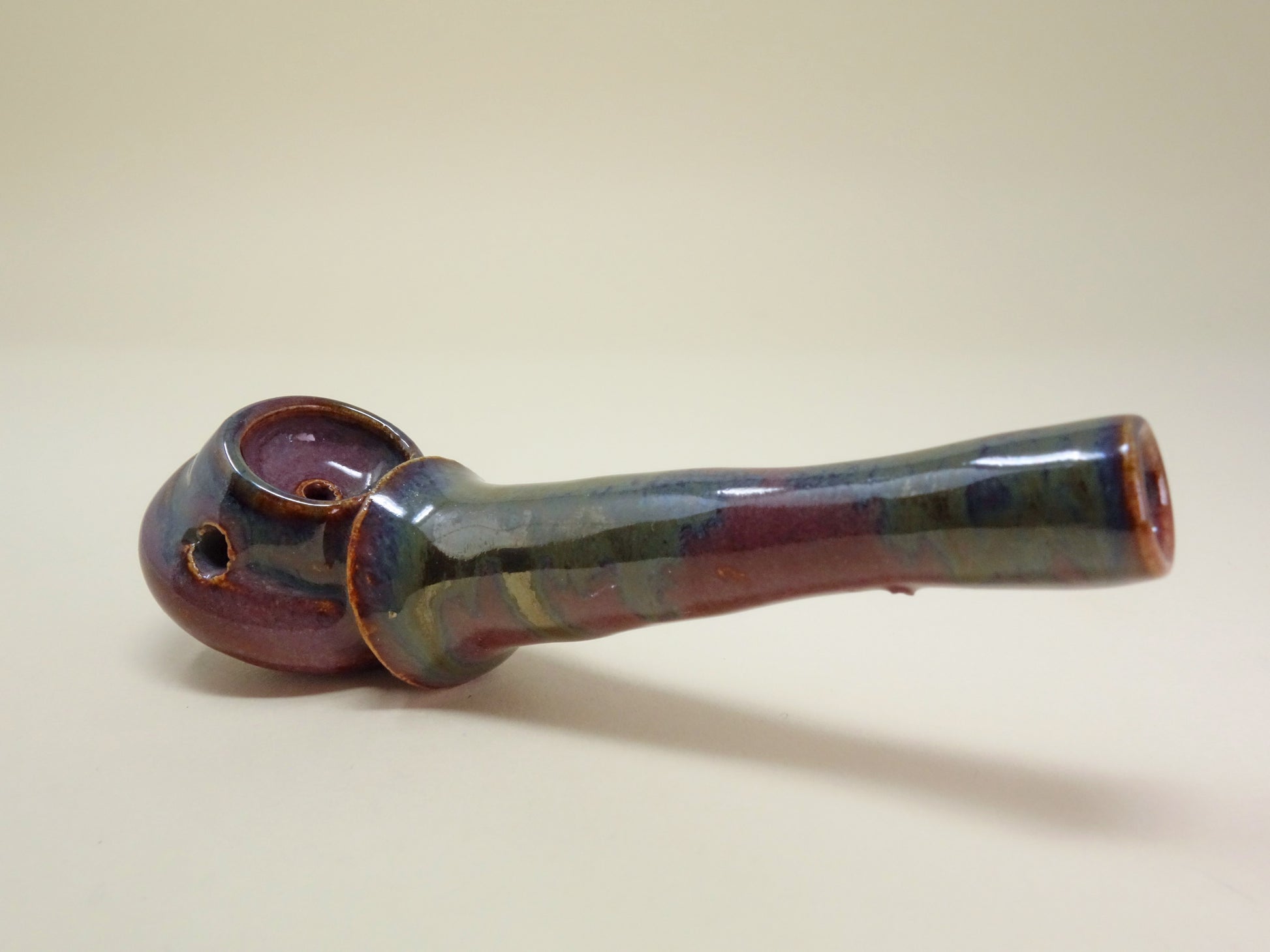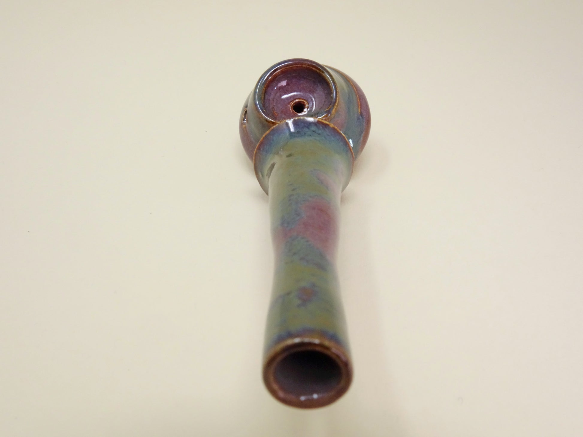 When your chaotic good and evil sides clash on the last day of the week while the country is collapsing into an absurd dumpster fire, but at least you have a sweet bowl that lets it all fade away. A violet base is topped with a metallic mirror-like glaze, which turned green and blue as a reaction to the combination, leaving flashes of its original gold on the trails dripping down the sides. The stem is angled upwards to resemble a classic pipe shape. Deep breaths, despite the chaos.