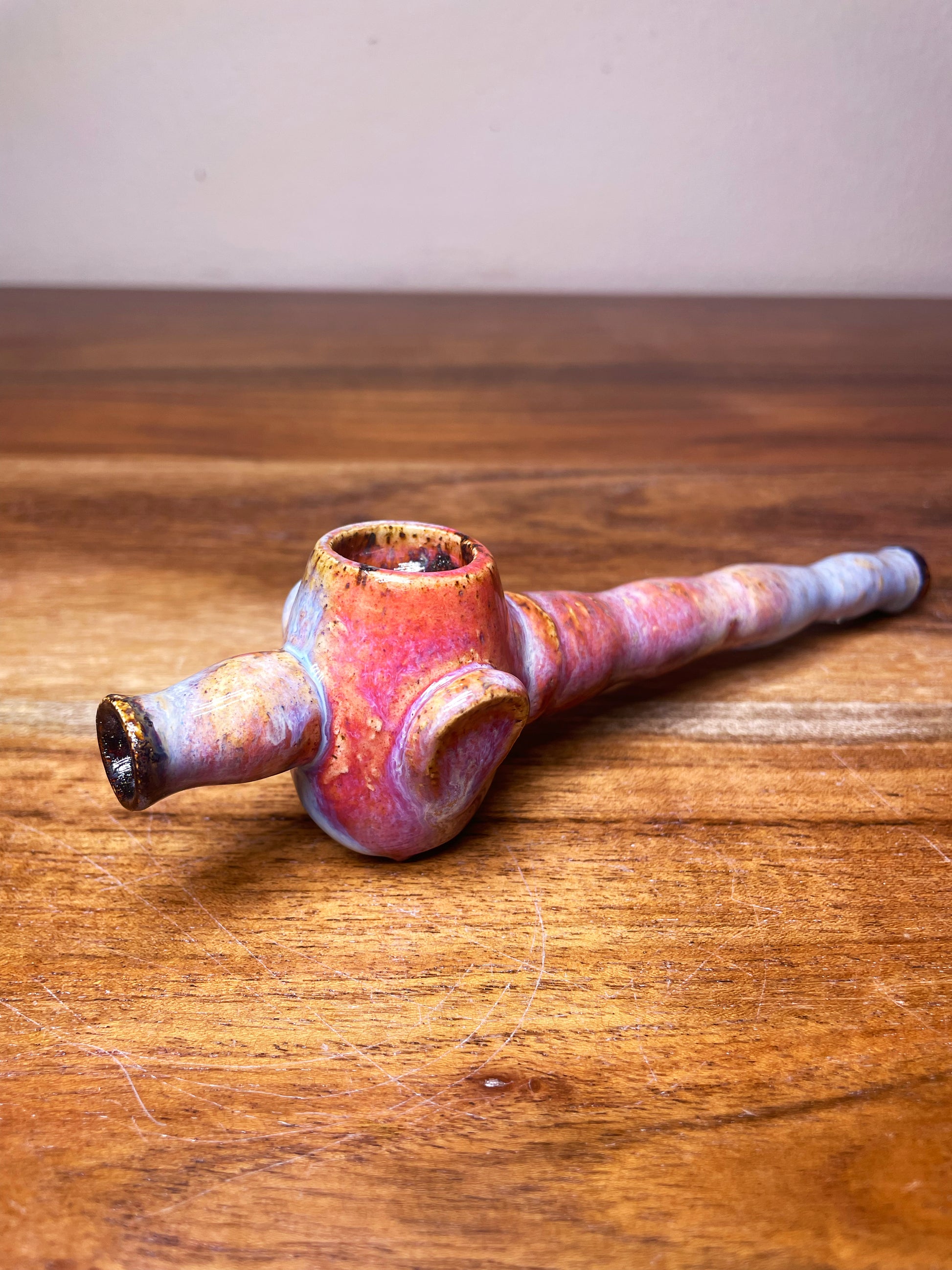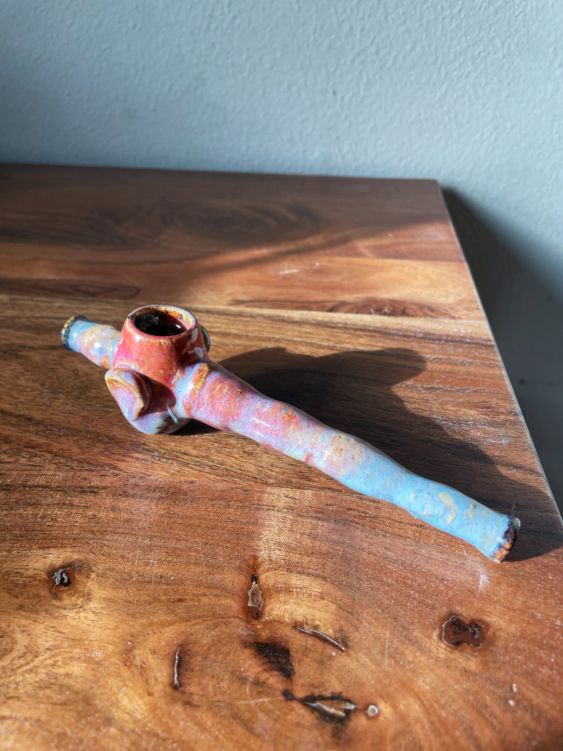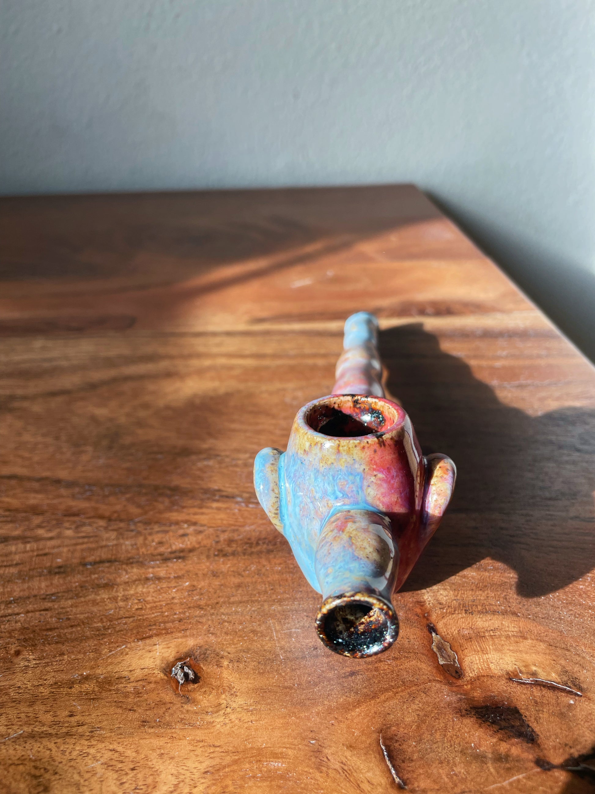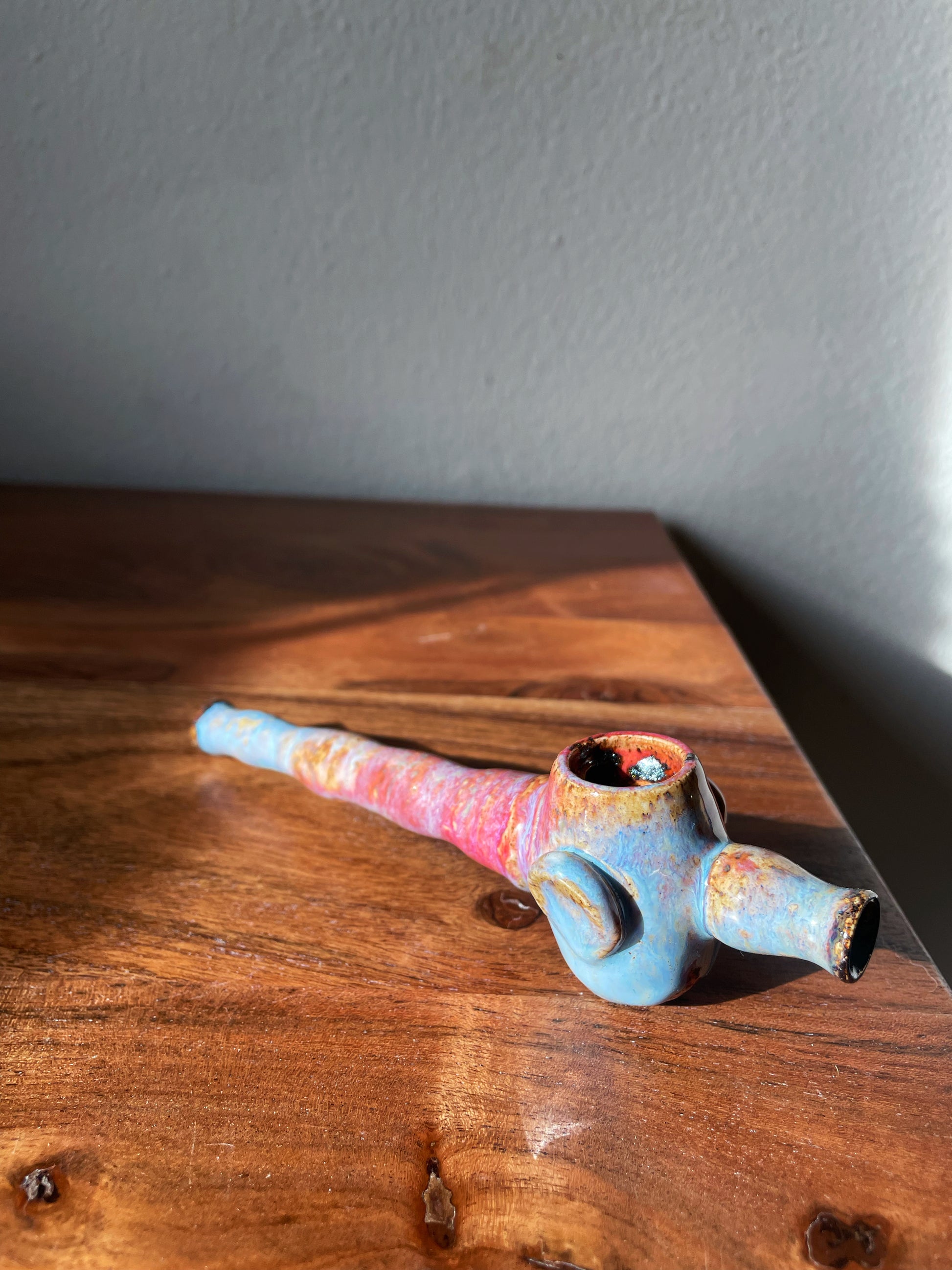 Flames lick an aquamarine steamroller, a concoction of fire and ice. Thumb-holds embellish either side, meant to aid in holding a hefty bowl.