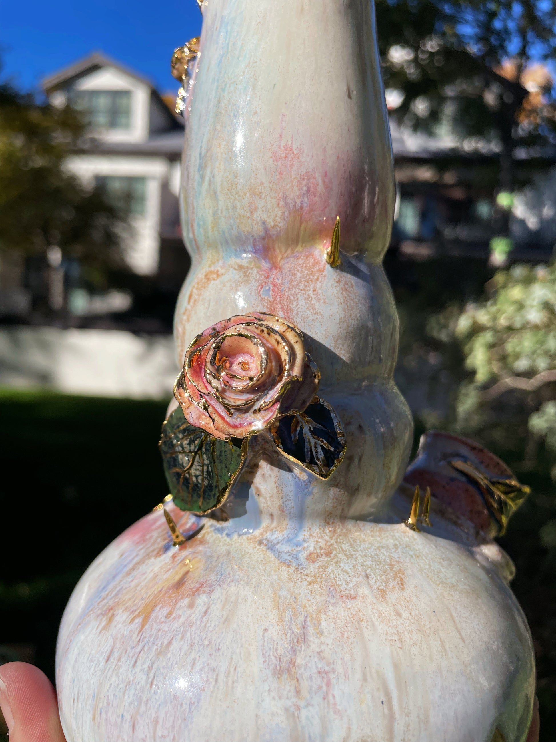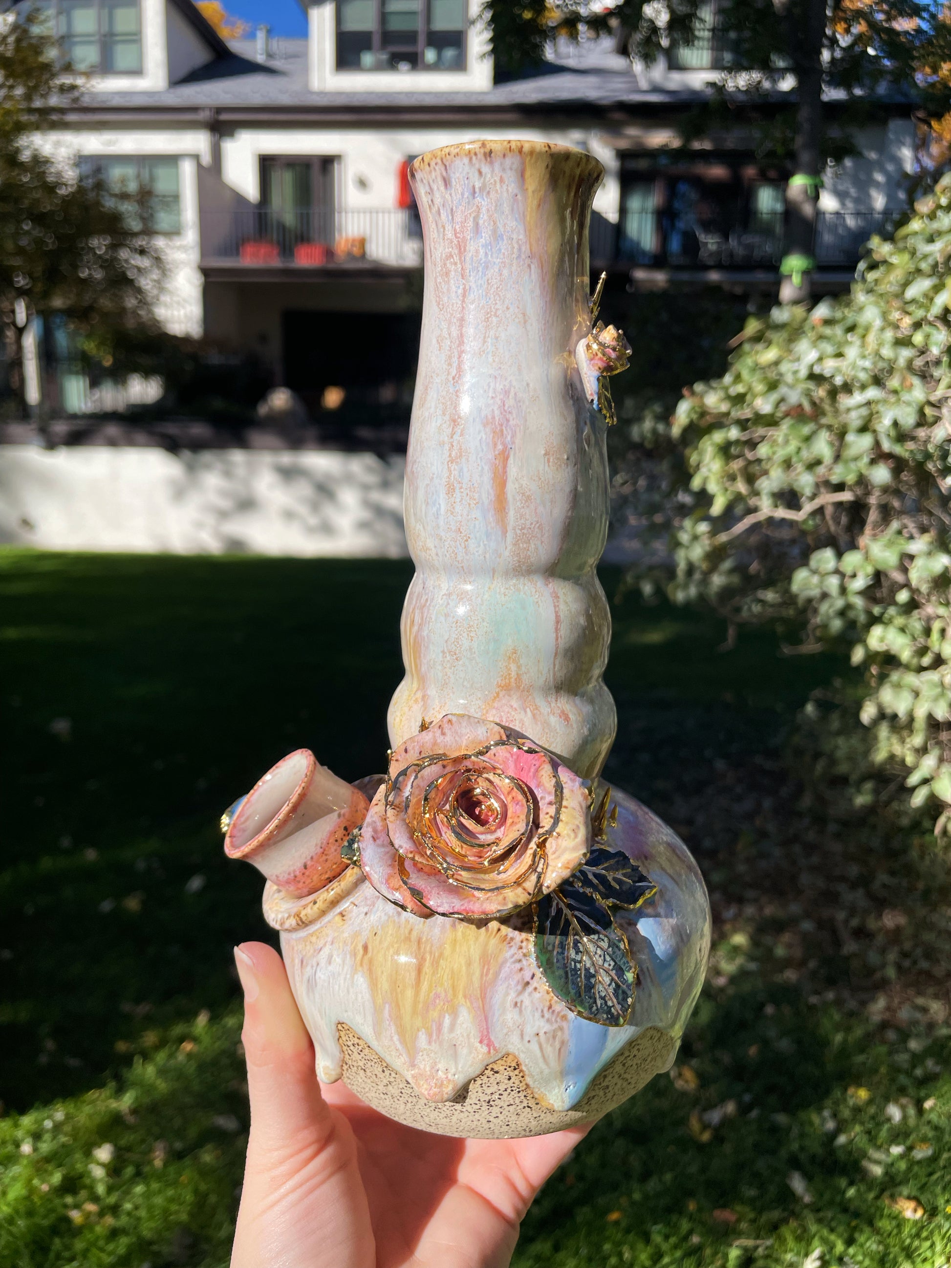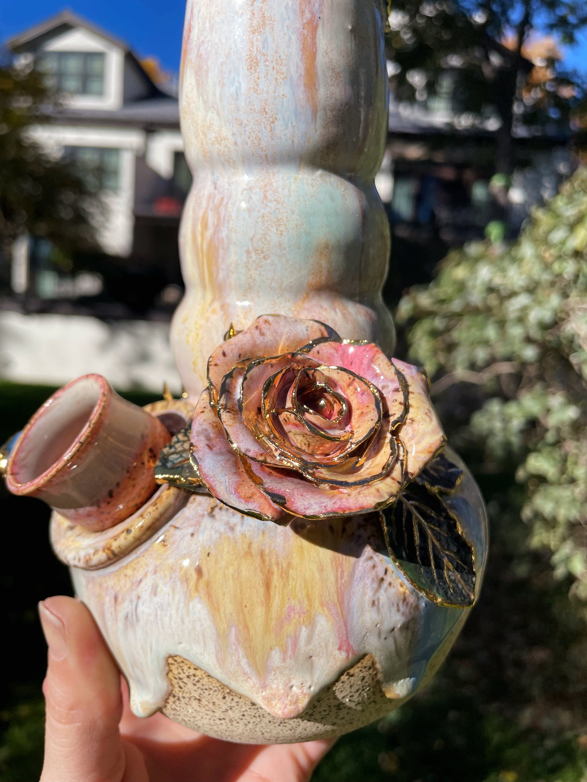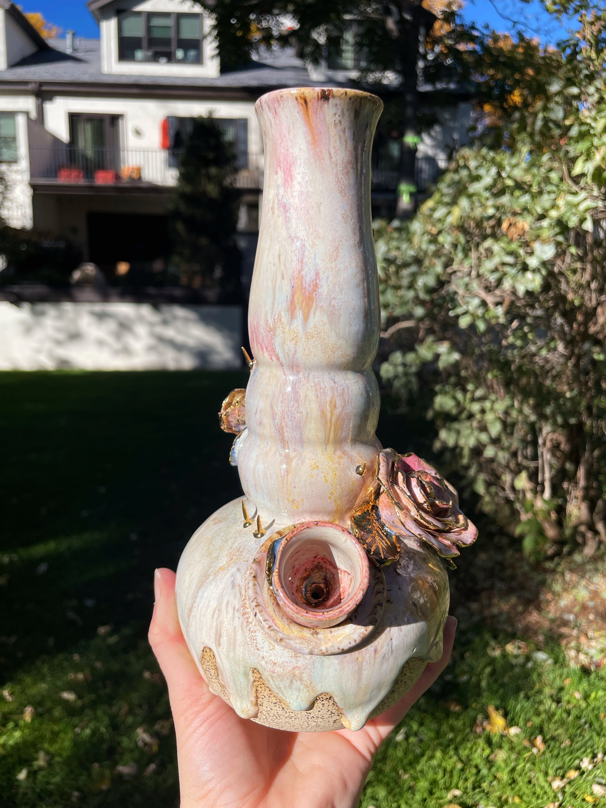 A cascading bong with hand-sculpted roses and thorns, complete with real embossed leaves. Real gold encrusts the organic embellishments, complete with a detachable bowl and an ice-catcher.