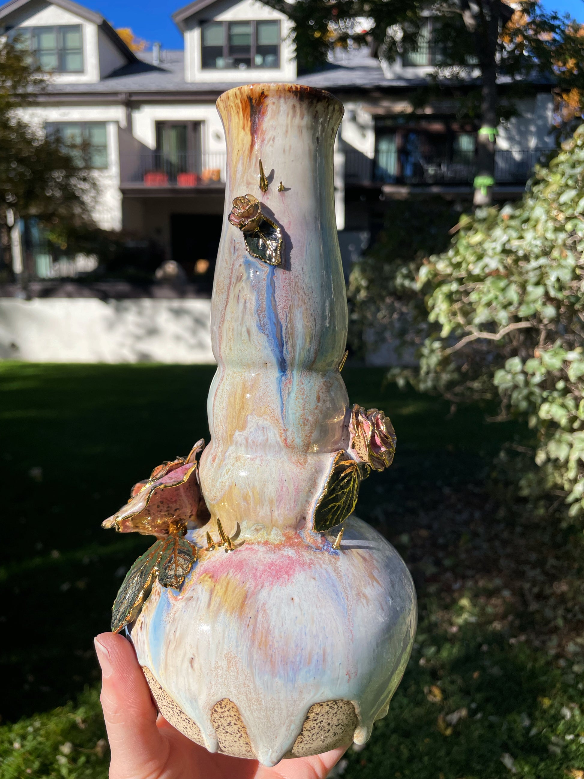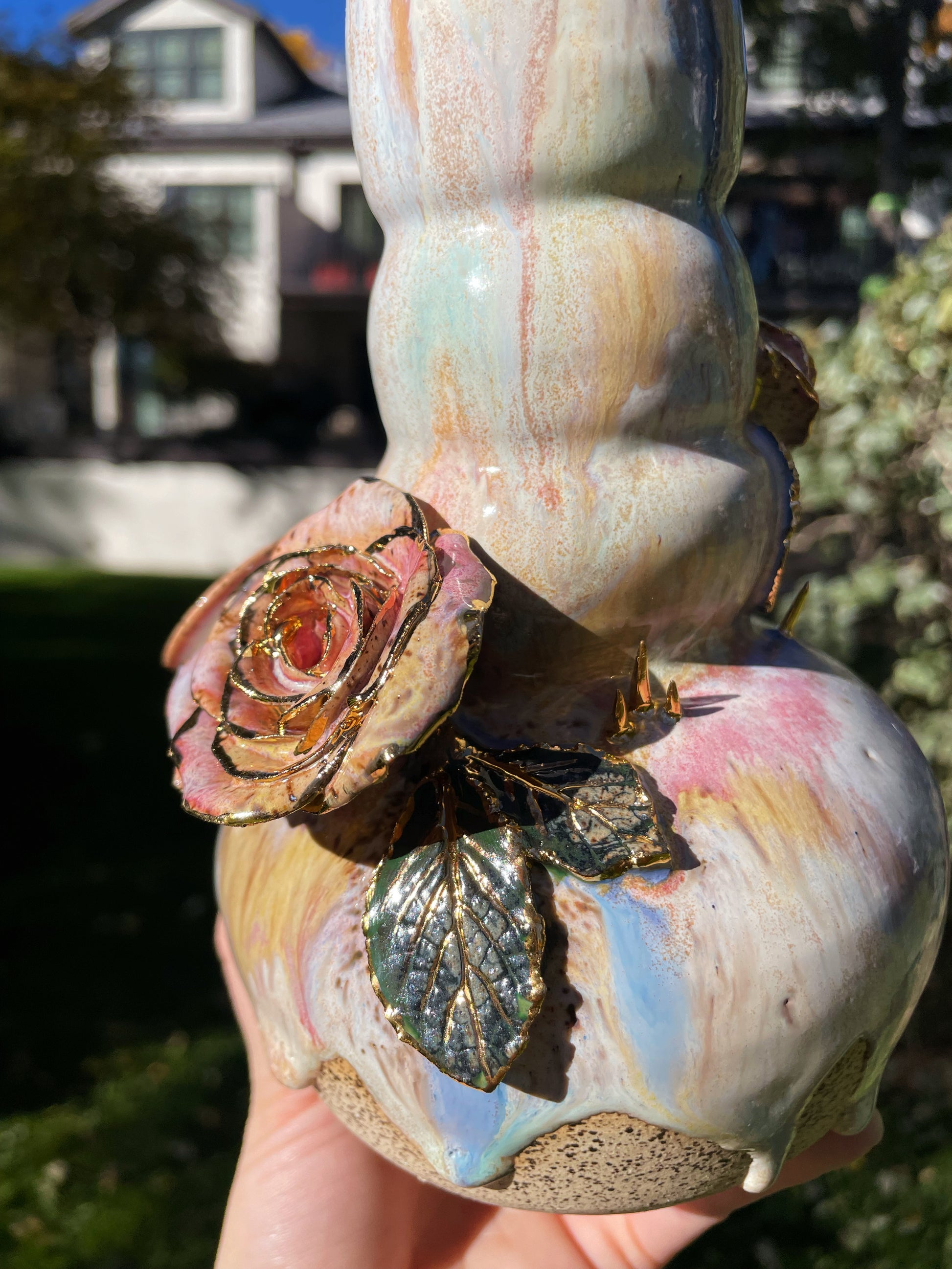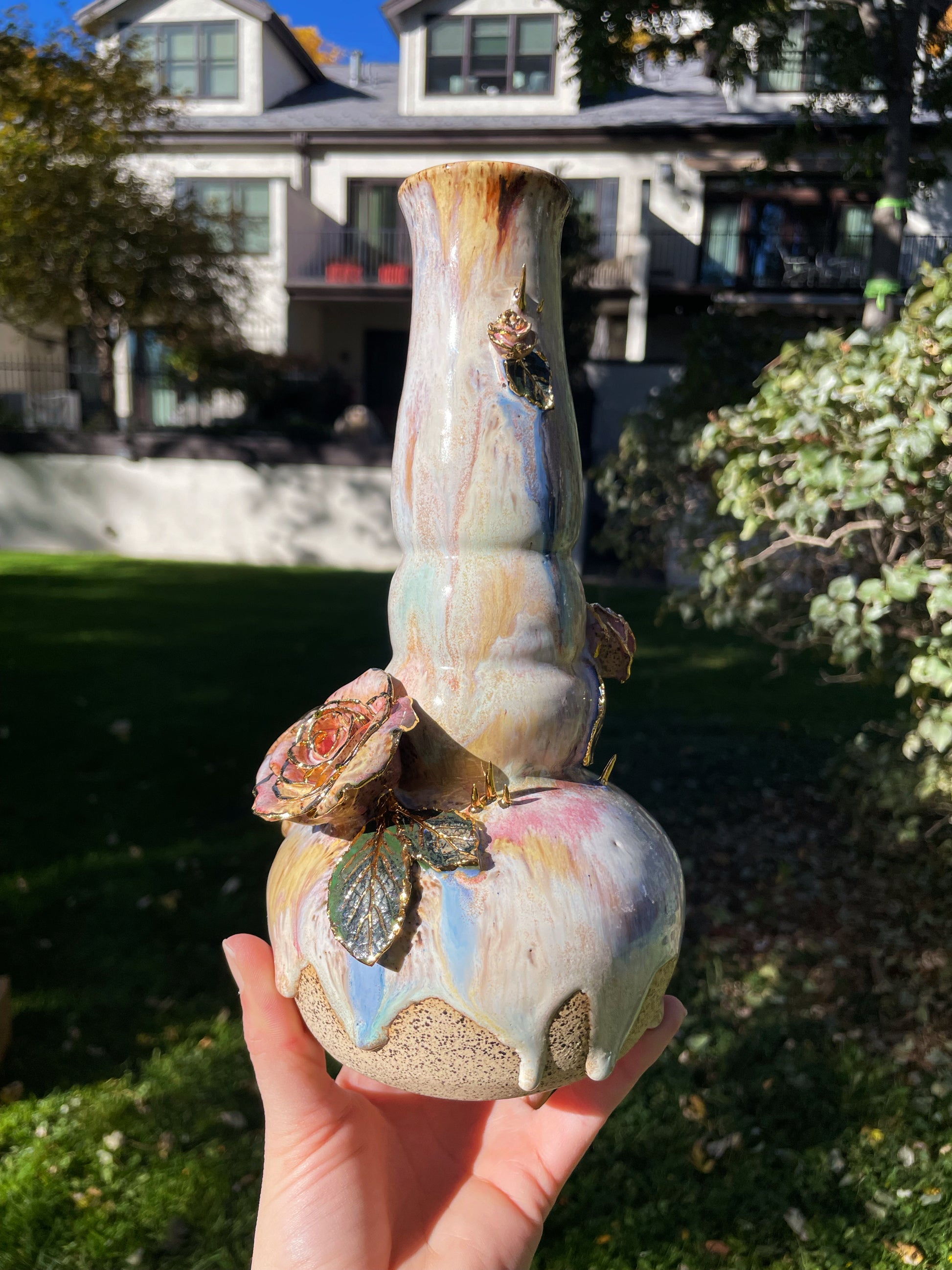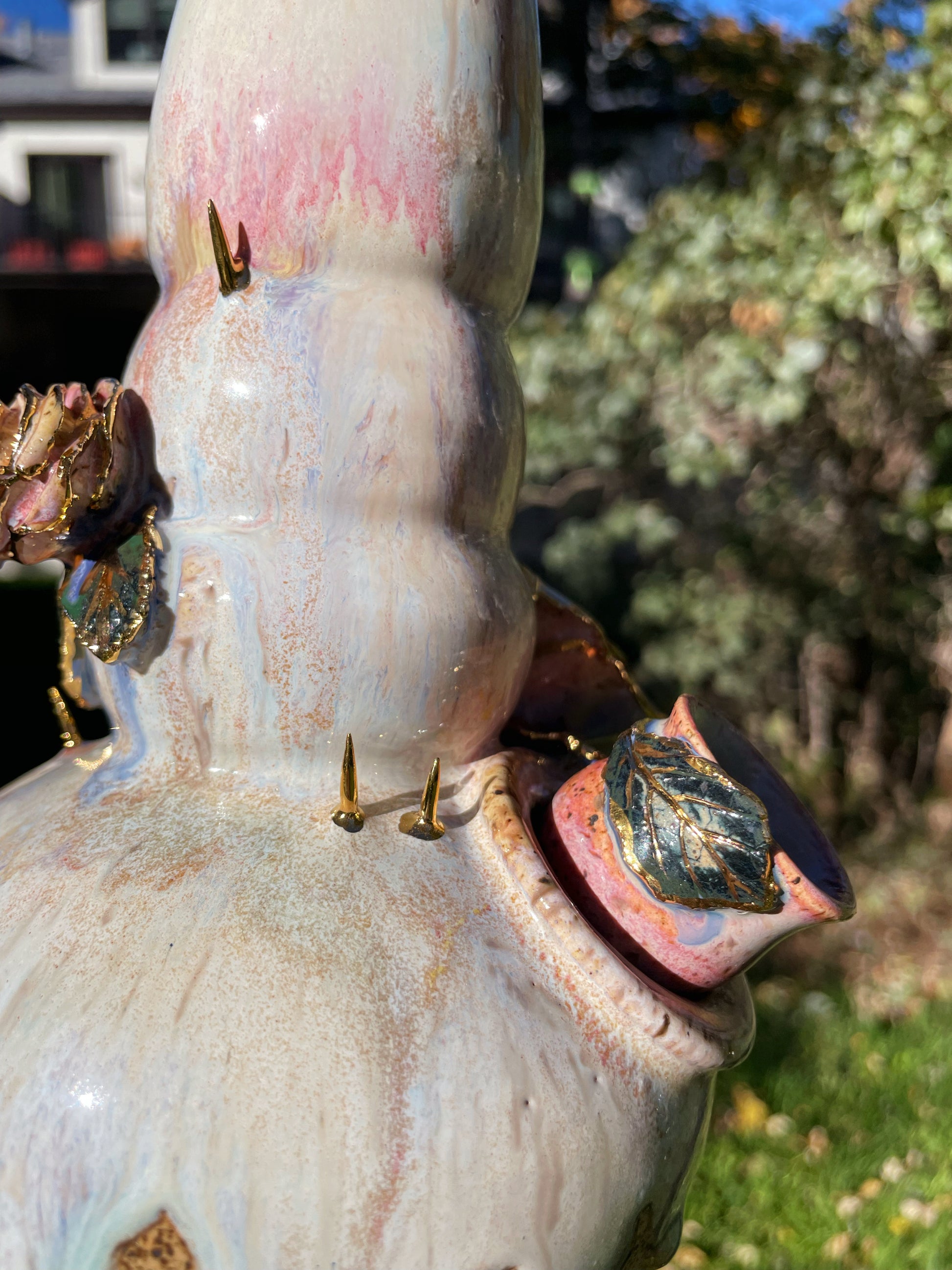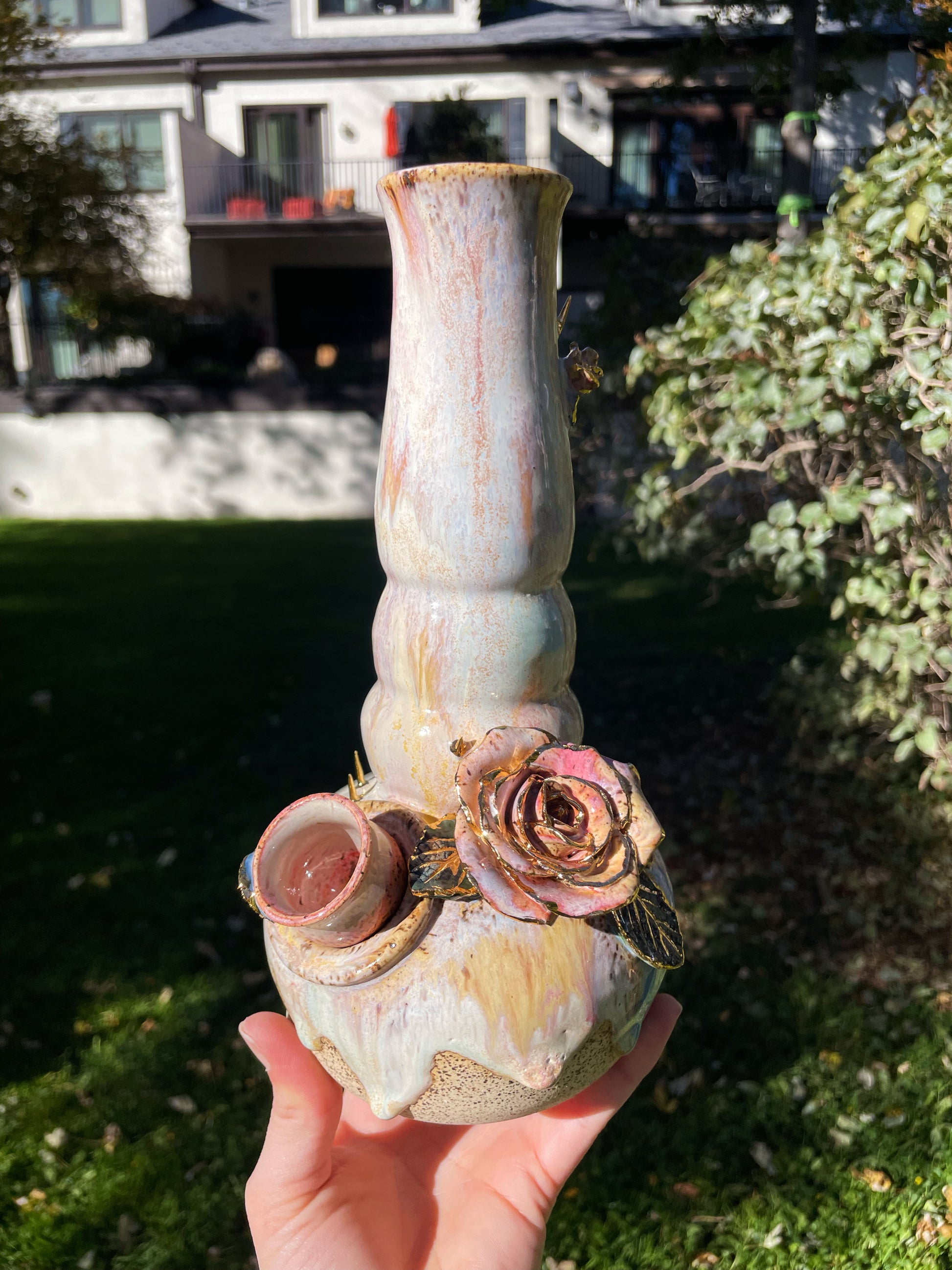 A cascading bong with hand-sculpted roses and thorns, complete with real embossed leaves. Real gold encrusts the organic embellishments, complete with a detachable bowl and an ice-catcher.