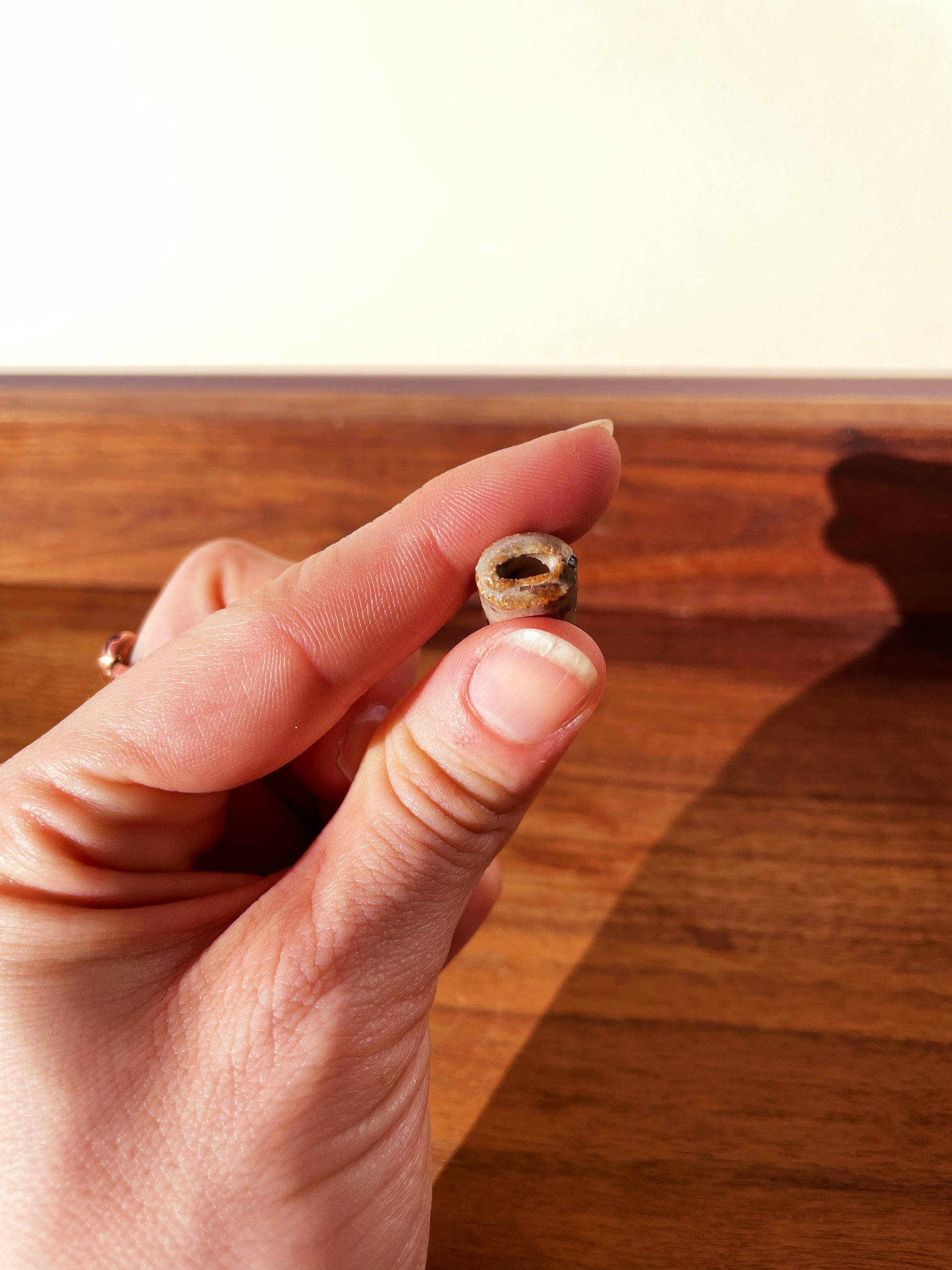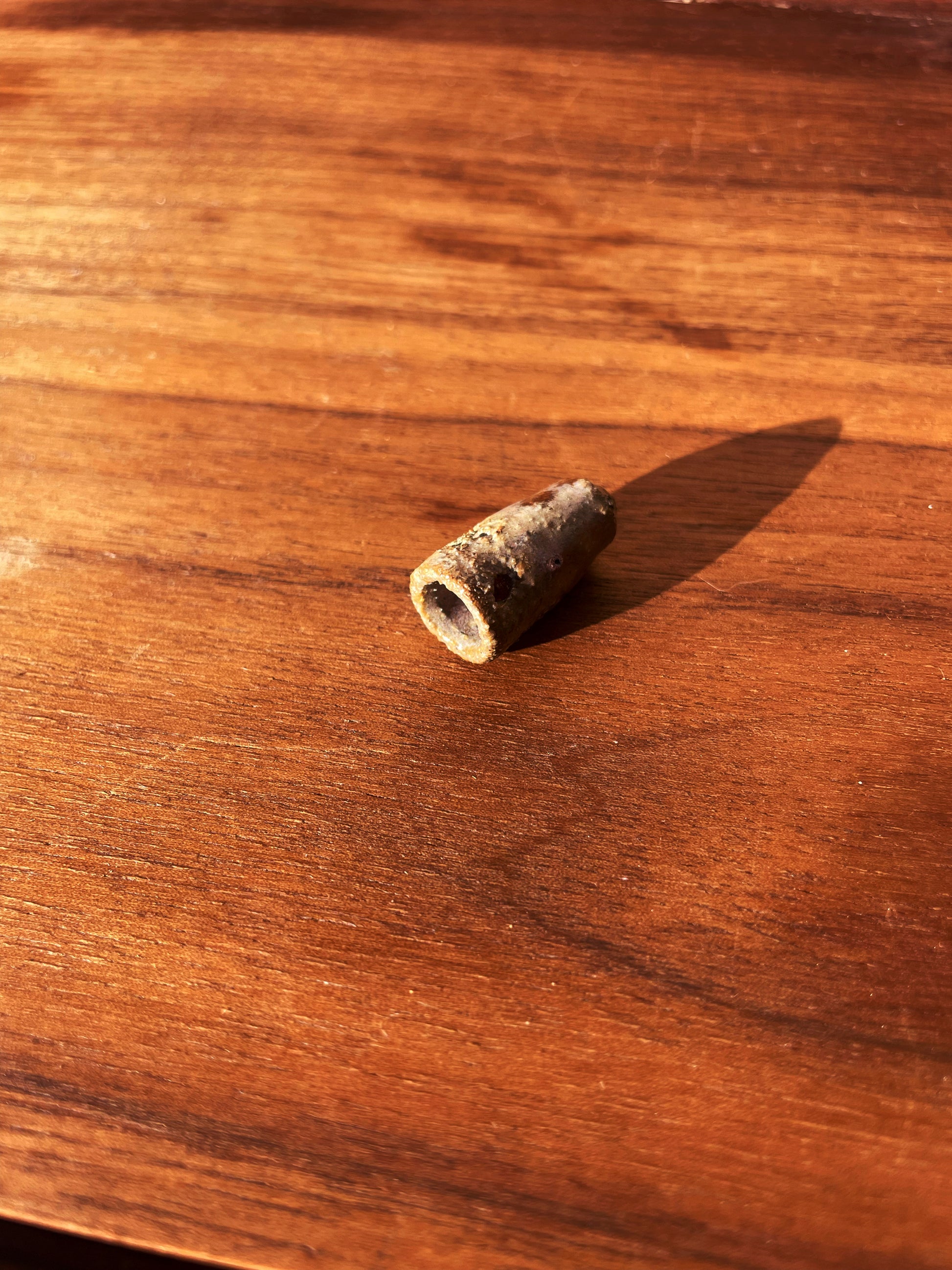 A joint holder with small coffee spots and a clamped mouthpiece.