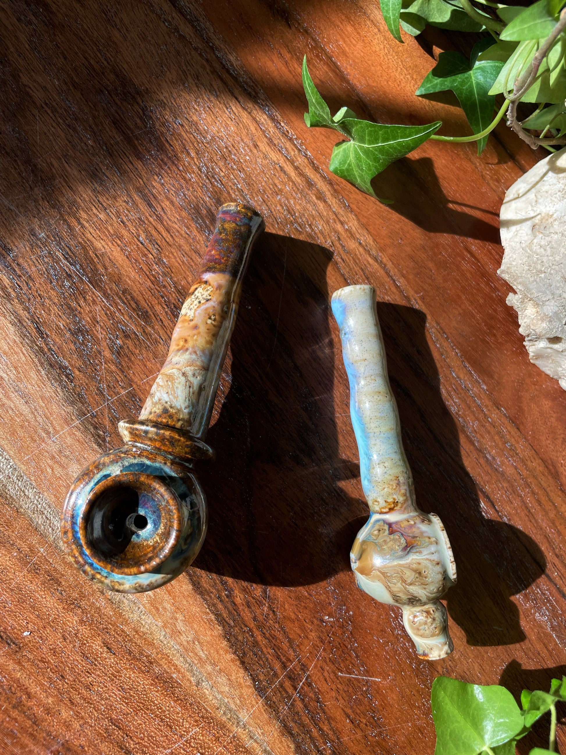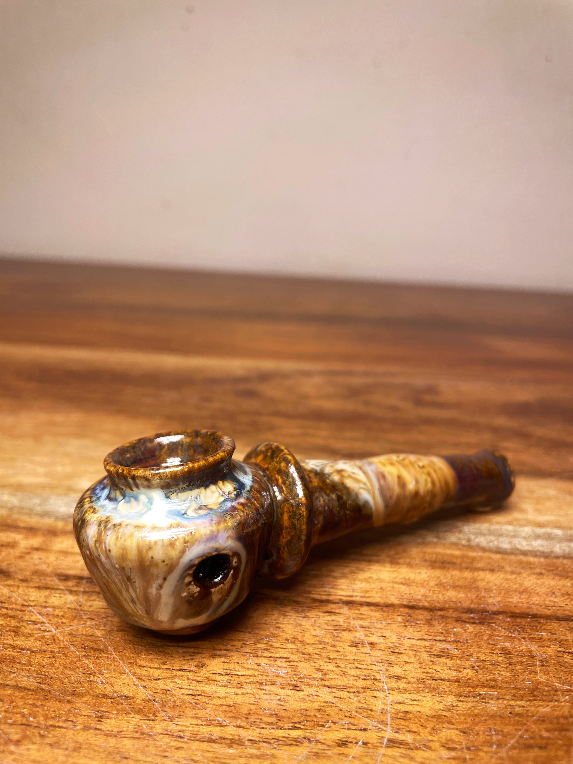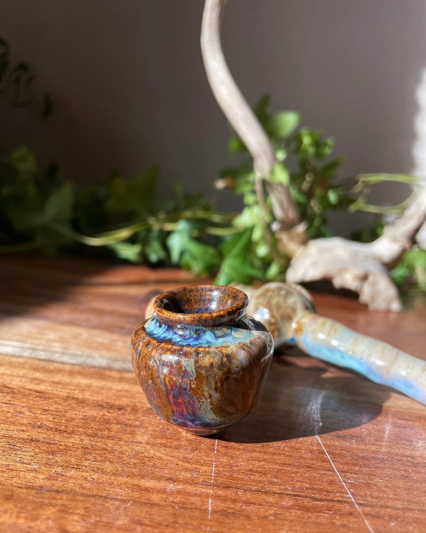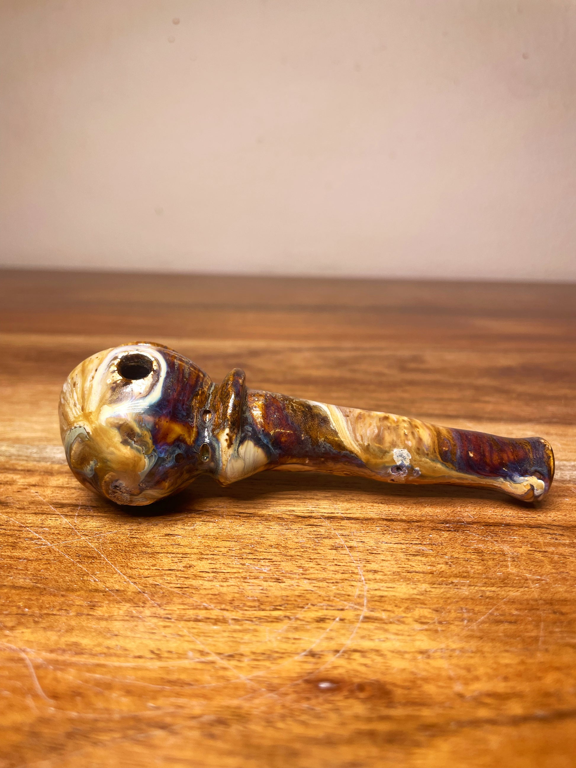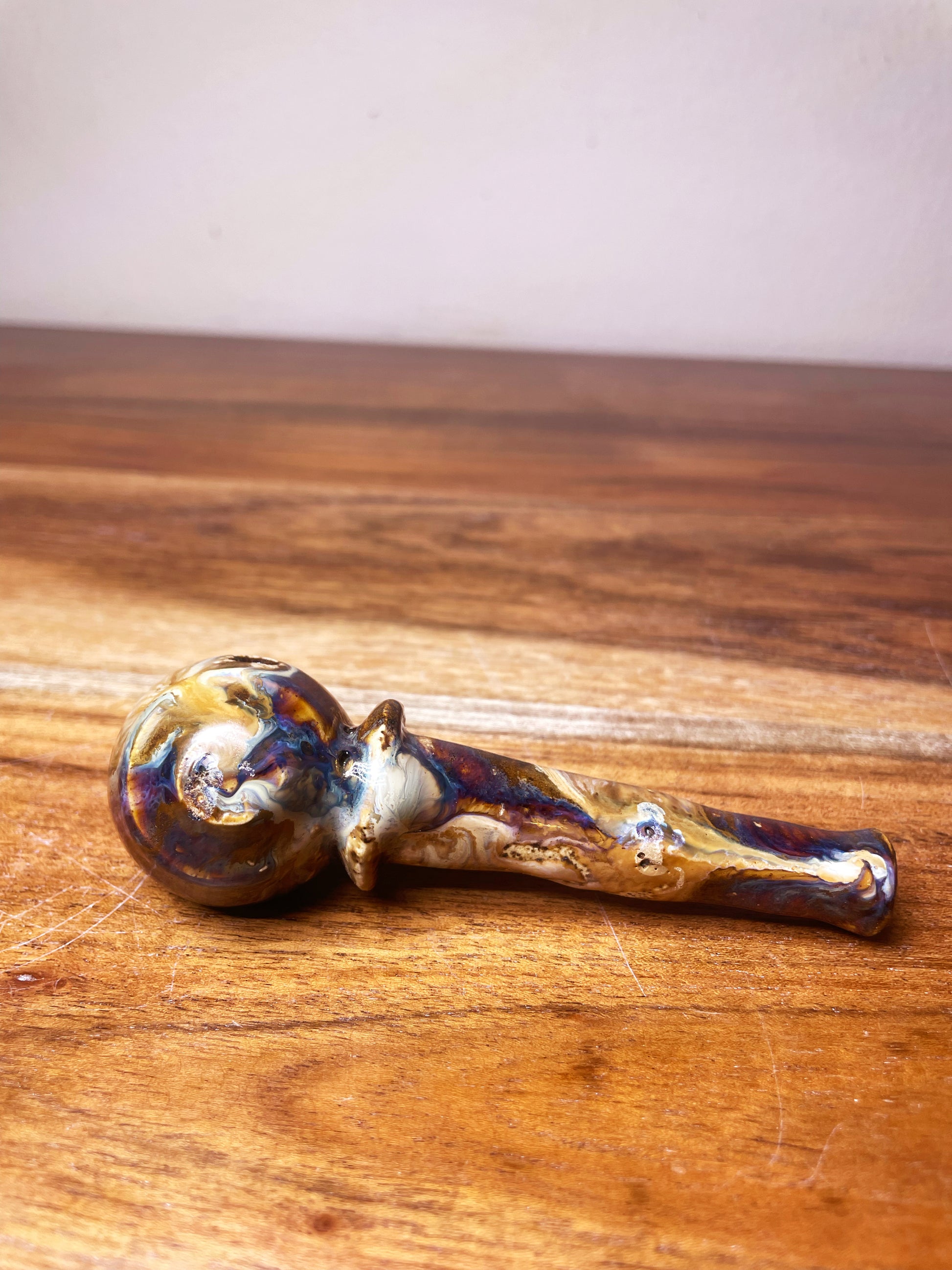 A collection of purples, blues and golds slip across an amber base, forming a collage of chemical movement.