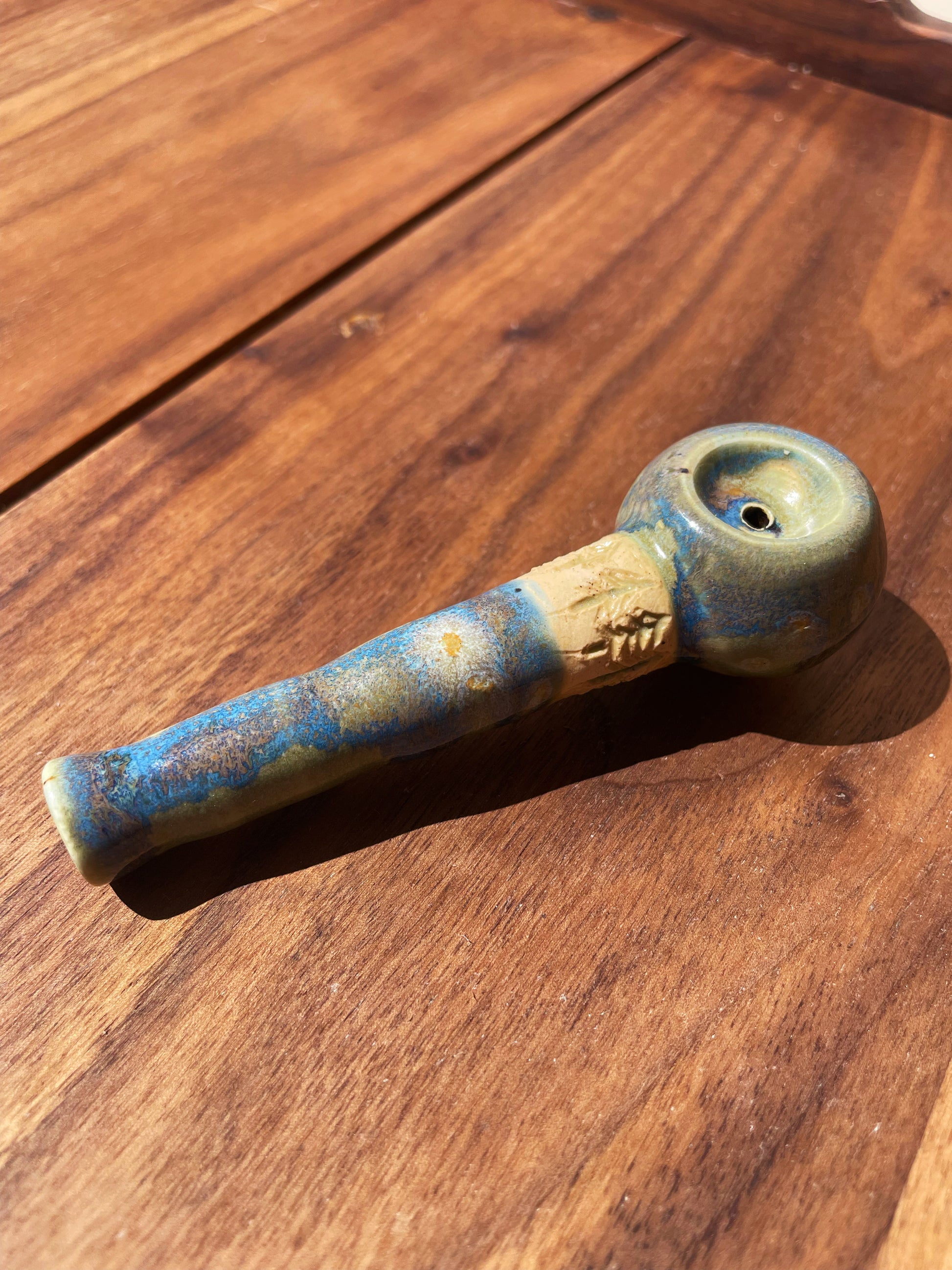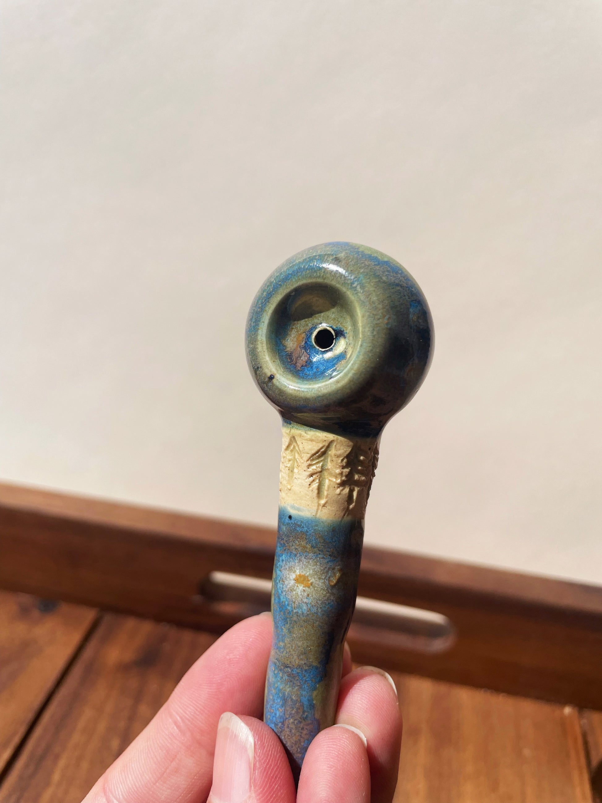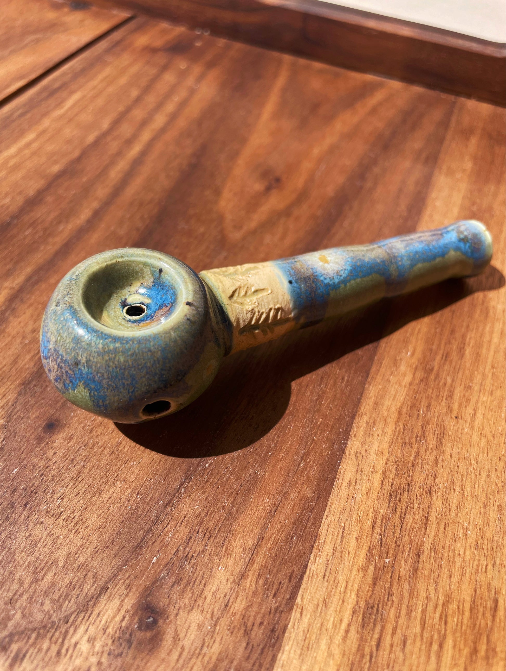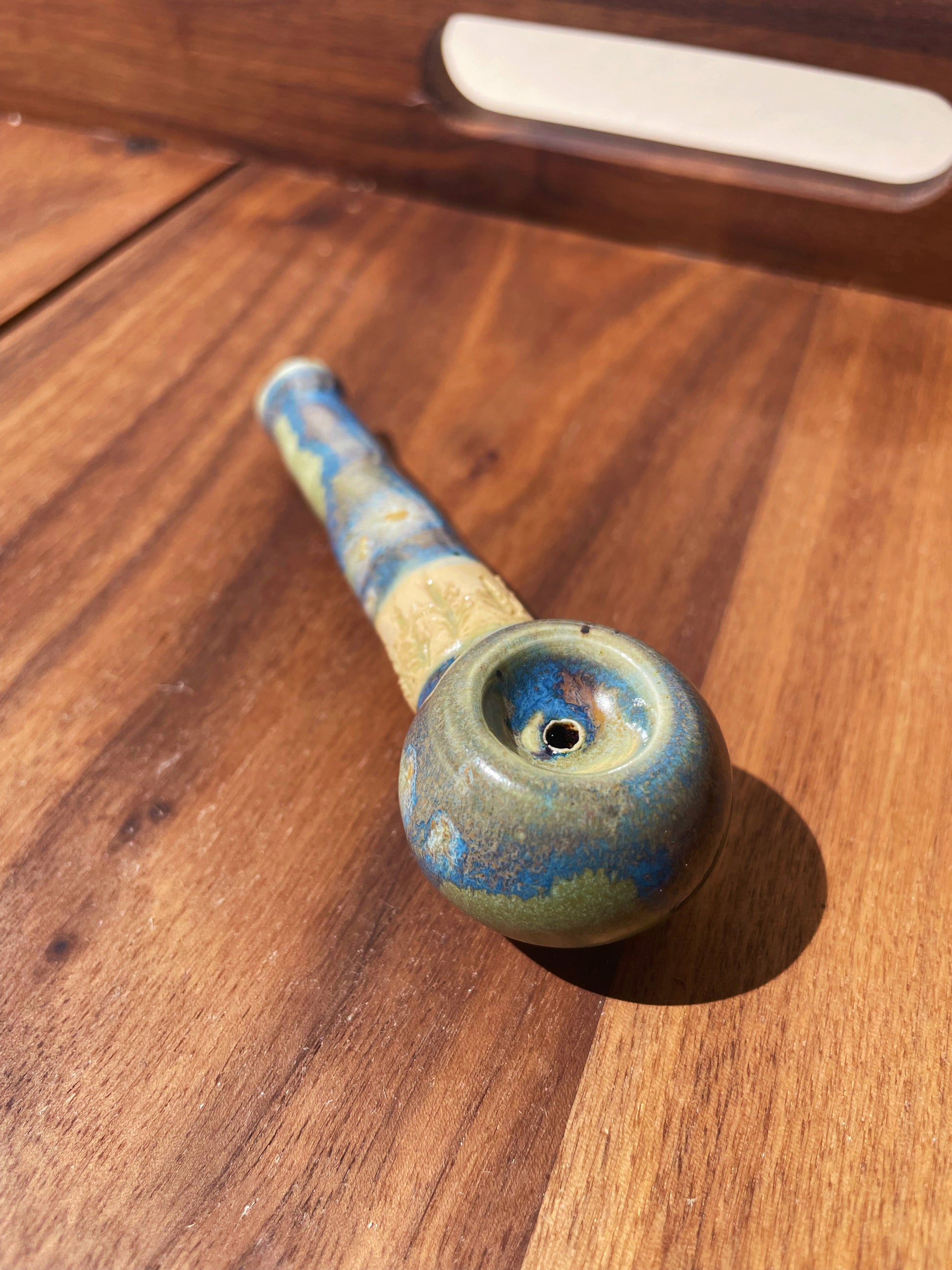 Peace ain’t easy to come by, but this piece has peace written into its gosh-darn name. Inspired by Colorado’s tree lines and green tea, this sweet bowl offers delish smokes over war and deforestation. Embellished with a carved line of firs above a wash of green, azure and gold, this piece will offer only good company on your next adventures.