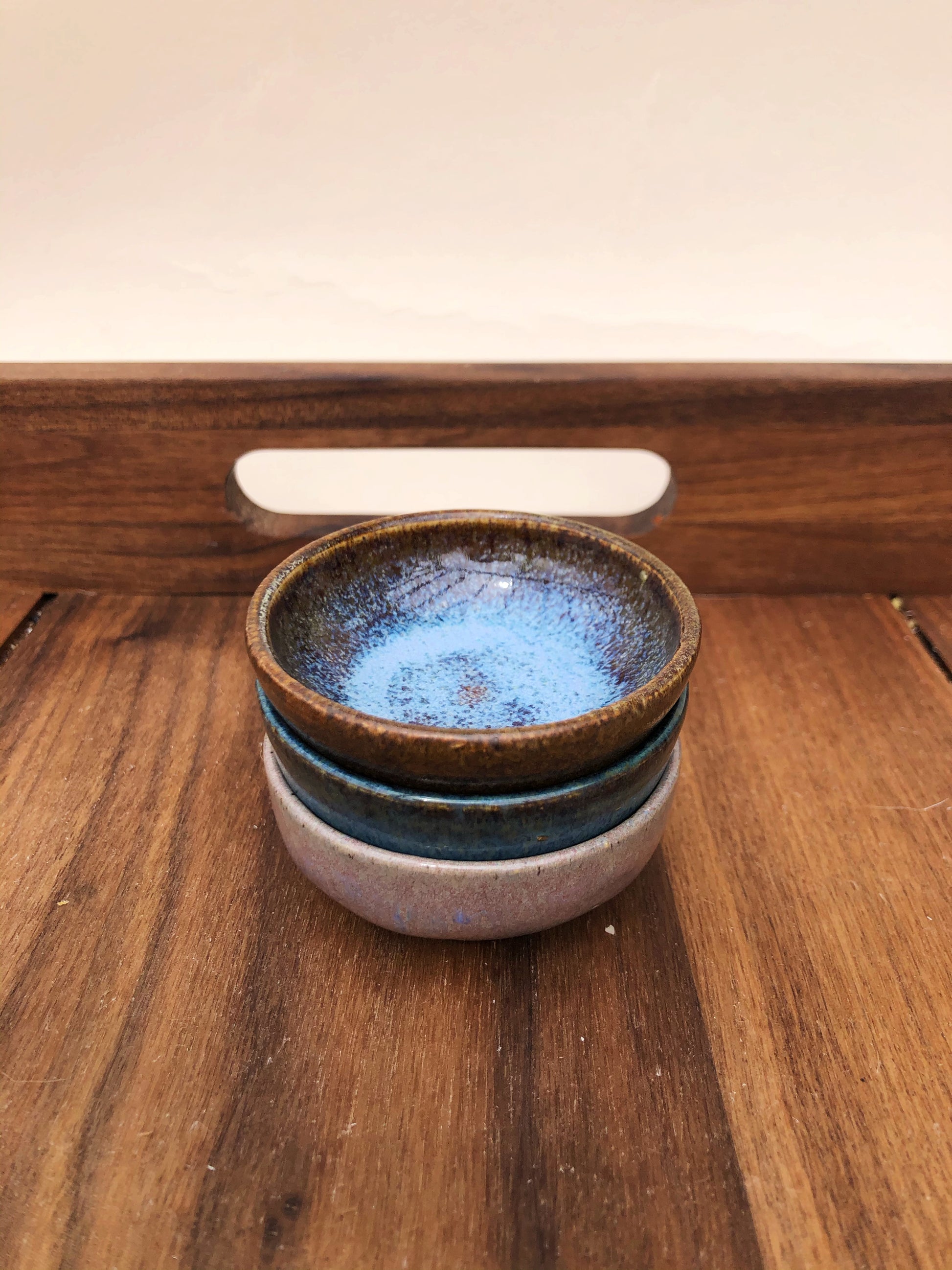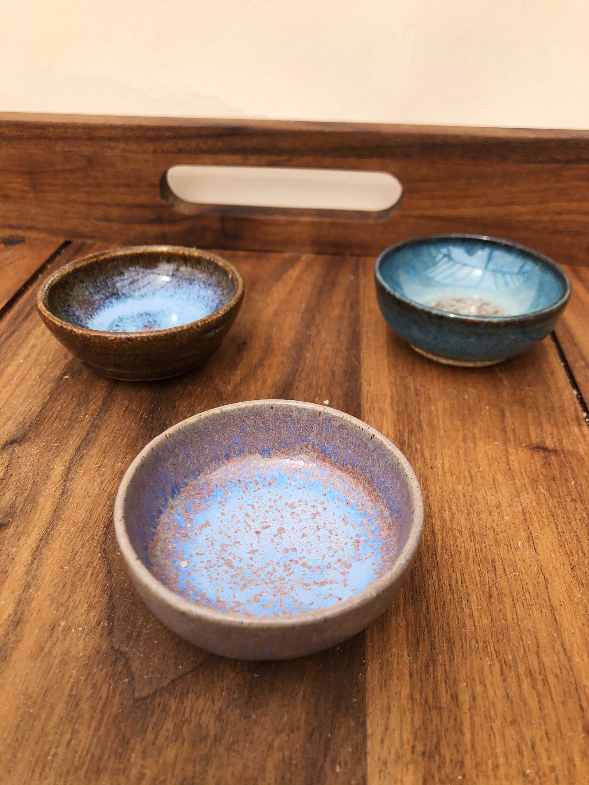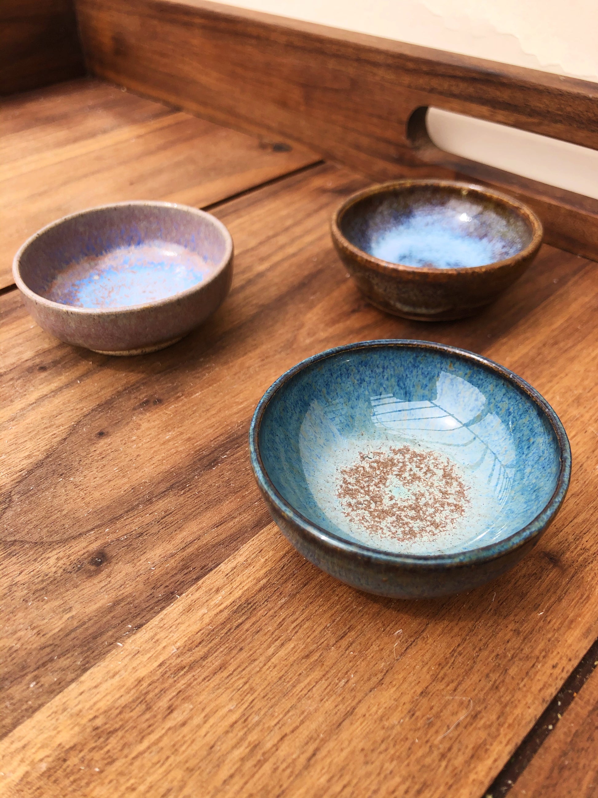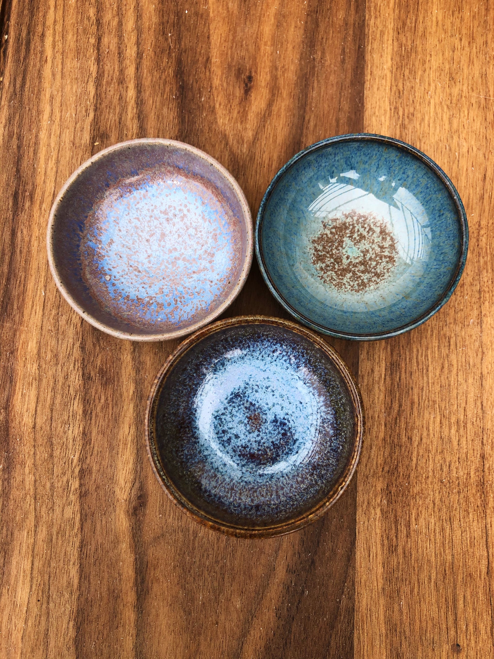The Three Blues are a trio of copitas whose glazes are modeled off of different water levels in the ocean. There's the light-toned piece for sparkling sand meeting the water as it reflects in the sun, a glossy deep turquoise for the stretch of waters, and a dark-toned copita with luminescent light flecks for the trenches.