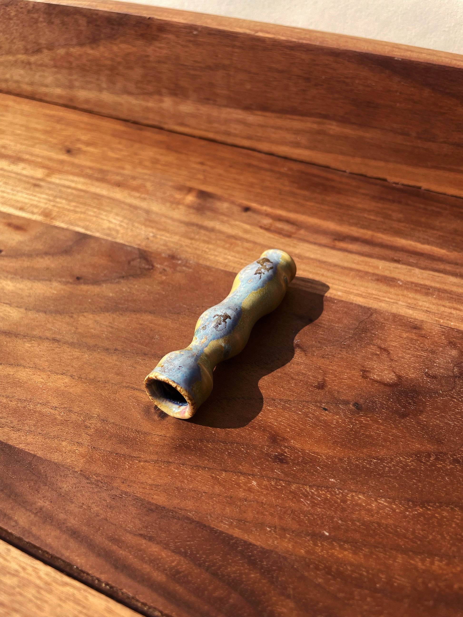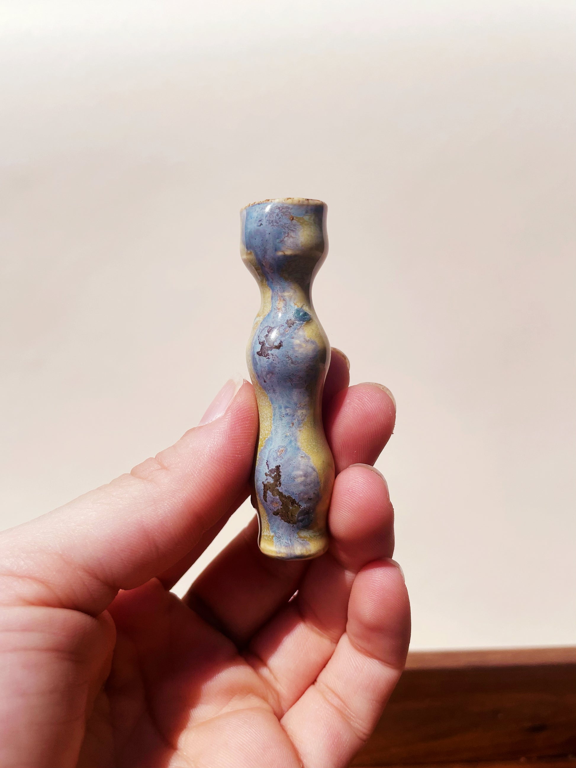 An azure shadow curves on a green tea base flecked with seafoam. In the fine powder mist, the semblance of a figure coos to you, "light up, homie".